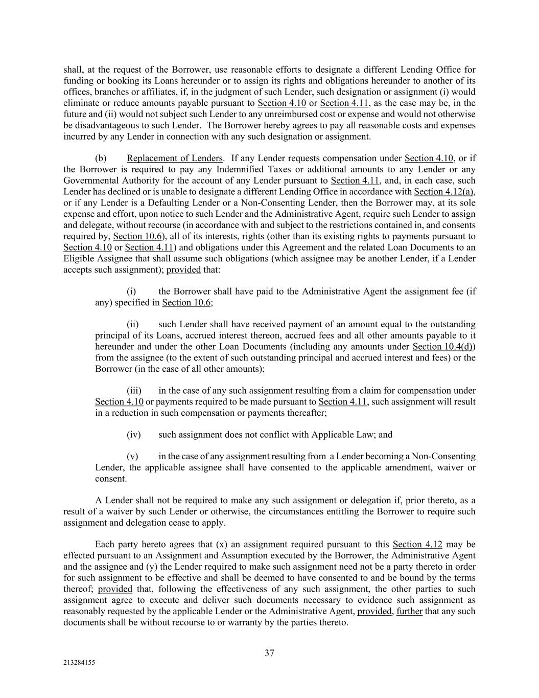 37 213284155 shall, at the request of the Borrower, use reasonable efforts to designate a different Lending Office for funding or booking its Loans hereunder or to assign its rights and obligations hereunder to another of its offices, branches or affiliates, if, in the judgment of such Lender, such designation or assignment (i) would eliminate or reduce amounts payable pursuant to Section 4.10 or Section 4.11, as the case may be, in the future and (ii) would not subject such Lender to any unreimbursed cost or expense and would not otherwise be disadvantageous to such Lender. The Borrower hereby agrees to pay all reasonable costs and expenses incurred by any Lender in connection with any such designation or assignment. (b) Replacement of Lenders. If any Lender requests compensation under Section 4.10, or if the Borrower is required to pay any Indemnified Taxes or additional amounts to any Lender or any Governmental Authority for the account of any Lender pursuant to Section 4.11, and, in each case, such Lender has declined or is unable to designate a different Lending Office in accordance with Section 4.12(a), or if any Lender is a Defaulting Lender or a Non-Consenting Lender, then the Borrower may, at its sole expense and effort, upon notice to such Lender and the Administrative Agent, require such Lender to assign and delegate, without recourse (in accordance with and subject to the restrictions contained in, and consents required by, Section 10.6), all of its interests, rights (other than its existing rights to payments pursuant to Section 4.10 or Section 4.11) and obligations under this Agreement and the related Loan Documents to an Eligible Assignee that shall assume such obligations (which assignee may be another Lender, if a Lender accepts such assignment); provided that: (i) the Borrower shall have paid to the Administrative Agent the assignment fee (if any) specified in Section 10.6; (ii) such Lender shall have received payment of an amount equal to the outstanding principal of its Loans, accrued interest thereon, accrued fees and all other amounts payable to it hereunder and under the other Loan Documents (including any amounts under Section 10.4(d)) from the assignee (to the extent of such outstanding principal and accrued interest and fees) or the Borrower (in the case of all other amounts); (iii) in the case of any such assignment resulting from a claim for compensation under Section 4.10 or payments required to be made pursuant to Section 4.11, such assignment will result in a reduction in such compensation or payments thereafter; (iv) such assignment does not conflict with Applicable Law; and (v) in the case of any assignment resulting from a Lender becoming a Non-Consenting Lender, the applicable assignee shall have consented to the applicable amendment, waiver or consent. A Lender shall not be required to make any such assignment or delegation if, prior thereto, as a result of a waiver by such Lender or otherwise, the circumstances entitling the Borrower to require such assignment and delegation cease to apply. Each party hereto agrees that (x) an assignment required pursuant to this Section 4.12 may be effected pursuant to an Assignment and Assumption executed by the Borrower, the Administrative Agent and the assignee and (y) the Lender required to make such assignment need not be a party thereto in order for such assignment to be effective and shall be deemed to have consented to and be bound by the terms thereof; provided that, following the effectiveness of any such assignment, the other parties to such assignment agree to execute and deliver such documents necessary to evidence such assignment as reasonably requested by the applicable Lender or the Administrative Agent, provided, further that any such documents shall be without recourse to or warranty by the parties thereto.