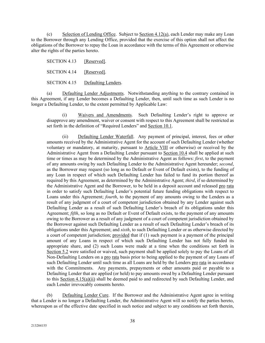 38 213284155 (c) Selection of Lending Office. Subject to Section 4.12(a), each Lender may make any Loan to the Borrower through any Lending Office, provided that the exercise of this option shall not affect the obligations of the Borrower to repay the Loan in accordance with the terms of this Agreement or otherwise alter the rights of the parties hereto. SECTION 4.13 [Reserved]. SECTION 4.14 [Reserved]. SECTION 4.15 Defaulting Lenders. (a) Defaulting Lender Adjustments. Notwithstanding anything to the contrary contained in this Agreement, if any Lender becomes a Defaulting Lender, then, until such time as such Lender is no longer a Defaulting Lender, to the extent permitted by Applicable Law: (i) Waivers and Amendments. Such Defaulting Lender’s right to approve or disapprove any amendment, waiver or consent with respect to this Agreement shall be restricted as set forth in the definition of “Required Lenders” and Section 10.1. (ii) Defaulting Lender Waterfall. Any payment of principal, interest, fees or other amounts received by the Administrative Agent for the account of such Defaulting Lender (whether voluntary or mandatory, at maturity, pursuant to Article VIII or otherwise) or received by the Administrative Agent from a Defaulting Lender pursuant to Section 10.4 shall be applied at such time or times as may be determined by the Administrative Agent as follows: first, to the payment of any amounts owing by such Defaulting Lender to the Administrative Agent hereunder; second, as the Borrower may request (so long as no Default or Event of Default exists), to the funding of any Loan in respect of which such Defaulting Lender has failed to fund its portion thereof as required by this Agreement, as determined by the Administrative Agent; third, if so determined by the Administrative Agent and the Borrower, to be held in a deposit account and released pro rata in order to satisfy such Defaulting Lender’s potential future funding obligations with respect to Loans under this Agreement; fourth, to the payment of any amounts owing to the Lenders as a result of any judgment of a court of competent jurisdiction obtained by any Lender against such Defaulting Lender as a result of such Defaulting Lender’s breach of its obligations under this Agreement; fifth, so long as no Default or Event of Default exists, to the payment of any amounts owing to the Borrower as a result of any judgment of a court of competent jurisdiction obtained by the Borrower against such Defaulting Lender as a result of such Defaulting Lender’s breach of its obligations under this Agreement; and sixth, to such Defaulting Lender or as otherwise directed by a court of competent jurisdiction; provided that if (1) such payment is a payment of the principal amount of any Loans in respect of which such Defaulting Lender has not fully funded its appropriate share, and (2) such Loans were made at a time when the conditions set forth in Section 5.2 were satisfied or waived, such payment shall be applied solely to pay the Loans of all Non-Defaulting Lenders on a pro rata basis prior to being applied to the payment of any Loans of such Defaulting Lender until such time as all Loans are held by the Lenders pro rata in accordance with the Commitments. Any payments, prepayments or other amounts paid or payable to a Defaulting Lender that are applied (or held) to pay amounts owed by a Defaulting Lender pursuant to this Section 4.15(a)(ii) shall be deemed paid to and redirected by such Defaulting Lender, and each Lender irrevocably consents hereto. (b) Defaulting Lender Cure. If the Borrower and the Administrative Agent agree in writing that a Lender is no longer a Defaulting Lender, the Administrative Agent will so notify the parties hereto, whereupon as of the effective date specified in such notice and subject to any conditions set forth therein,