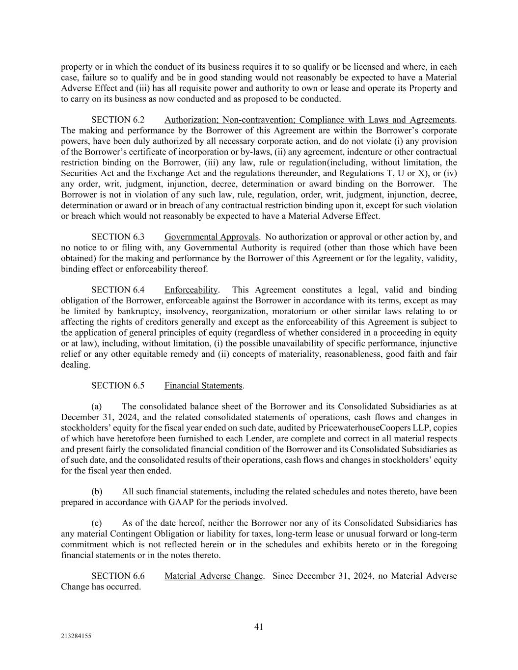 41 213284155 property or in which the conduct of its business requires it to so qualify or be licensed and where, in each case, failure so to qualify and be in good standing would not reasonably be expected to have a Material Adverse Effect and (iii) has all requisite power and authority to own or lease and operate its Property and to carry on its business as now conducted and as proposed to be conducted. SECTION 6.2 Authorization; Non-contravention; Compliance with Laws and Agreements. The making and performance by the Borrower of this Agreement are within the Borrower’s corporate powers, have been duly authorized by all necessary corporate action, and do not violate (i) any provision of the Borrower’s certificate of incorporation or by-laws, (ii) any agreement, indenture or other contractual restriction binding on the Borrower, (iii) any law, rule or regulation (including, without limitation, the Securities Act and the Exchange Act and the regulations thereunder, and Regulations T, U or X), or (iv) any order, writ, judgment, injunction, decree, determination or award binding on the Borrower. The Borrower is not in violation of any such law, rule, regulation, order, writ, judgment, injunction, decree, determination or award or in breach of any contractual restriction binding upon it, except for such violation or breach which would not reasonably be expected to have a Material Adverse Effect. SECTION 6.3 Governmental Approvals. No authorization or approval or other action by, and no notice to or filing with, any Governmental Authority is required (other than those which have been obtained) for the making and performance by the Borrower of this Agreement or for the legality, validity, binding effect or enforceability thereof. SECTION 6.4 Enforceability. This Agreement constitutes a legal, valid and binding obligation of the Borrower, enforceable against the Borrower in accordance with its terms, except as may be limited by bankruptcy, insolvency, reorganization, moratorium or other similar laws relating to or affecting the rights of creditors generally and except as the enforceability of this Agreement is subject to the application of general principles of equity (regardless of whether considered in a proceeding in equity or at law), including, without limitation, (i) the possible unavailability of specific performance, injunctive relief or any other equitable remedy and (ii) concepts of materiality, reasonableness, good faith and fair dealing. SECTION 6.5 Financial Statements. (a) The consolidated balance sheet of the Borrower and its Consolidated Subsidiaries as at December 31, 2024, and the related consolidated statements of operations, cash flows and changes in stockholders’ equity for the fiscal year ended on such date, audited by PricewaterhouseCoopers LLP, copies of which have heretofore been furnished to each Lender, are complete and correct in all material respects and present fairly the consolidated financial condition of the Borrower and its Consolidated Subsidiaries as of such date, and the consolidated results of their operations, cash flows and changes in stockholders’ equity for the fiscal year then ended. (b) All such financial statements, including the related schedules and notes thereto, have been prepared in accordance with GAAP for the periods involved. (c) As of the date hereof, neither the Borrower nor any of its Consolidated Subsidiaries has any material Contingent Obligation or liability for taxes, long-term lease or unusual forward or long-term commitment which is not reflected herein or in the schedules and exhibits hereto or in the foregoing financial statements or in the notes thereto. SECTION 6.6 Material Adverse Change. Since December 31, 2024, no Material Adverse Change has occurred.