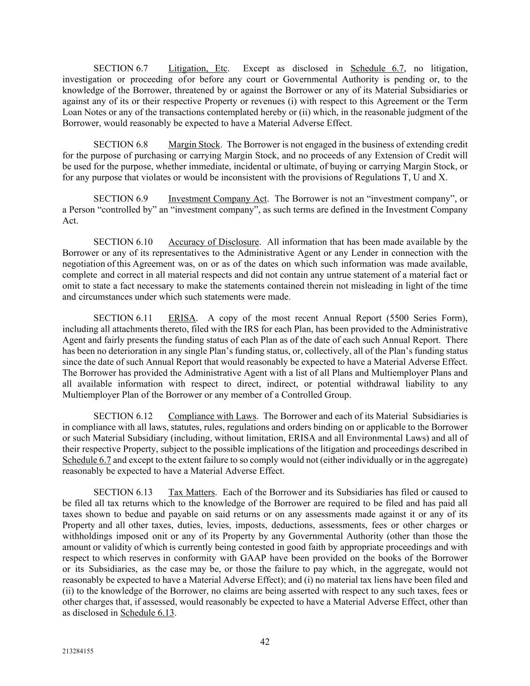 42 213284155 SECTION 6.7 Litigation, Etc. Except as disclosed in Schedule 6.7, no litigation, investigation or proceeding of or before any court or Governmental Authority is pending or, to the knowledge of the Borrower, threatened by or against the Borrower or any of its Material Subsidiaries or against any of its or their respective Property or revenues (i) with respect to this Agreement or the Term Loan Notes or any of the transactions contemplated hereby or (ii) which, in the reasonable judgment of the Borrower, would reasonably be expected to have a Material Adverse Effect. SECTION 6.8 Margin Stock. The Borrower is not engaged in the business of extending credit for the purpose of purchasing or carrying Margin Stock, and no proceeds of any Extension of Credit will be used for the purpose, whether immediate, incidental or ultimate, of buying or carrying Margin Stock, or for any purpose that violates or would be inconsistent with the provisions of Regulations T, U and X. SECTION 6.9 Investment Company Act. The Borrower is not an “investment company”, or a Person “controlled by” an “investment company”, as such terms are defined in the Investment Company Act. SECTION 6.10 Accuracy of Disclosure. All information that has been made available by the Borrower or any of its representatives to the Administrative Agent or any Lender in connection with the negotiation of this Agreement was, on or as of the dates on which such information was made available, complete and correct in all material respects and did not contain any untrue statement of a material fact or omit to state a fact necessary to make the statements contained therein not misleading in light of the time and circumstances under which such statements were made. SECTION 6.11 ERISA. A copy of the most recent Annual Report (5500 Series Form), including all attachments thereto, filed with the IRS for each Plan, has been provided to the Administrative Agent and fairly presents the funding status of each Plan as of the date of each such Annual Report. There has been no deterioration in any single Plan’s funding status, or, collectively, all of the Plan’s funding status since the date of such Annual Report that would reasonably be expected to have a Material Adverse Effect. The Borrower has provided the Administrative Agent with a list of all Plans and Multiemployer Plans and all available information with respect to direct, indirect, or potential withdrawal liability to any Multiemployer Plan of the Borrower or any member of a Controlled Group. SECTION 6.12 Compliance with Laws. The Borrower and each of its Material Subsidiaries is in compliance with all laws, statutes, rules, regulations and orders binding on or applicable to the Borrower or such Material Subsidiary (including, without limitation, ERISA and all Environmental Laws) and all of their respective Property, subject to the possible implications of the litigation and proceedings described in Schedule 6.7 and except to the extent failure to so comply would not (either individually or in the aggregate) reasonably be expected to have a Material Adverse Effect. SECTION 6.13 Tax Matters. Each of the Borrower and its Subsidiaries has filed or caused to be filed all tax returns which to the knowledge of the Borrower are required to be filed and has paid all taxes shown to be due and payable on said returns or on any assessments made against it or any of its Property and all other taxes, duties, levies, imposts, deductions, assessments, fees or other charges or withholdings imposed on it or any of its Property by any Governmental Authority (other than those the amount or validity of which is currently being contested in good faith by appropriate proceedings and with respect to which reserves in conformity with GAAP have been provided on the books of the Borrower or its Subsidiaries, as the case may be, or those the failure to pay which, in the aggregate, would not reasonably be expected to have a Material Adverse Effect); and (i) no material tax liens have been filed and (ii) to the knowledge of the Borrower, no claims are being asserted with respect to any such taxes, fees or other charges that, if assessed, would reasonably be expected to have a Material Adverse Effect, other than as disclosed in Schedule 6.13.