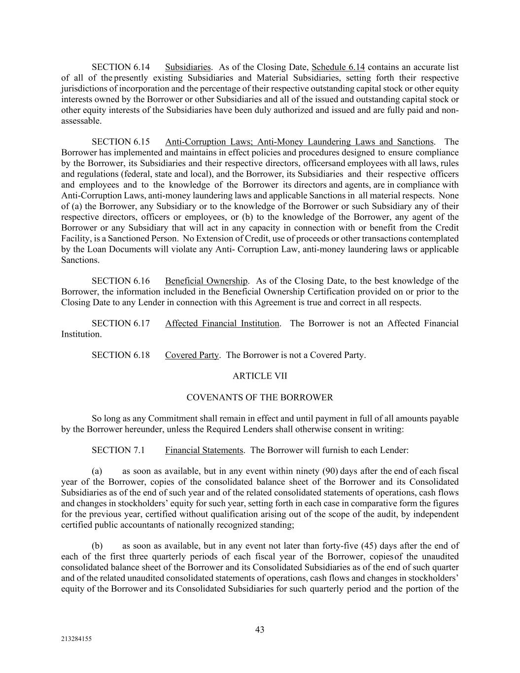 43 213284155 SECTION 6.14 Subsidiaries. As of the Closing Date, Schedule 6.14 contains an accurate list of all of the presently existing Subsidiaries and Material Subsidiaries, setting forth their respective jurisdictions of incorporation and the percentage of their respective outstanding capital stock or other equity interests owned by the Borrower or other Subsidiaries and all of the issued and outstanding capital stock or other equity interests of the Subsidiaries have been duly authorized and issued and are fully paid and non- assessable. SECTION 6.15 Anti-Corruption Laws; Anti-Money Laundering Laws and Sanctions. The Borrower has implemented and maintains in effect policies and procedures designed to ensure compliance by the Borrower, its Subsidiaries and their respective directors, officers and employees with all laws, rules and regulations (federal, state and local), and the Borrower, its Subsidiaries and their respective officers and employees and to the knowledge of the Borrower its directors and agents, are in compliance with Anti-Corruption Laws, anti-money laundering laws and applicable Sanctions in all material respects. None of (a) the Borrower, any Subsidiary or to the knowledge of the Borrower or such Subsidiary any of their respective directors, officers or employees, or (b) to the knowledge of the Borrower, any agent of the Borrower or any Subsidiary that will act in any capacity in connection with or benefit from the Credit Facility, is a Sanctioned Person. No Extension of Credit, use of proceeds or other transactions contemplated by the Loan Documents will violate any Anti- Corruption Law, anti-money laundering laws or applicable Sanctions. SECTION 6.16 Beneficial Ownership. As of the Closing Date, to the best knowledge of the Borrower, the information included in the Beneficial Ownership Certification provided on or prior to the Closing Date to any Lender in connection with this Agreement is true and correct in all respects. SECTION 6.17 Affected Financial Institution. The Borrower is not an Affected Financial Institution. SECTION 6.18 Covered Party. The Borrower is not a Covered Party. ARTICLE VII COVENANTS OF THE BORROWER So long as any Commitment shall remain in effect and until payment in full of all amounts payable by the Borrower hereunder, unless the Required Lenders shall otherwise consent in writing: SECTION 7.1 Financial Statements. The Borrower will furnish to each Lender: (a) as soon as available, but in any event within ninety (90) days after the end of each fiscal year of the Borrower, copies of the consolidated balance sheet of the Borrower and its Consolidated Subsidiaries as of the end of such year and of the related consolidated statements of operations, cash flows and changes in stockholders’ equity for such year, setting forth in each case in comparative form the figures for the previous year, certified without qualification arising out of the scope of the audit, by independent certified public accountants of nationally recognized standing; (b) as soon as available, but in any event not later than forty-five (45) days after the end of each of the first three quarterly periods of each fiscal year of the Borrower, copies of the unaudited consolidated balance sheet of the Borrower and its Consolidated Subsidiaries as of the end of such quarter and of the related unaudited consolidated statements of operations, cash flows and changes in stockholders’ equity of the Borrower and its Consolidated Subsidiaries for such quarterly period and the portion of the