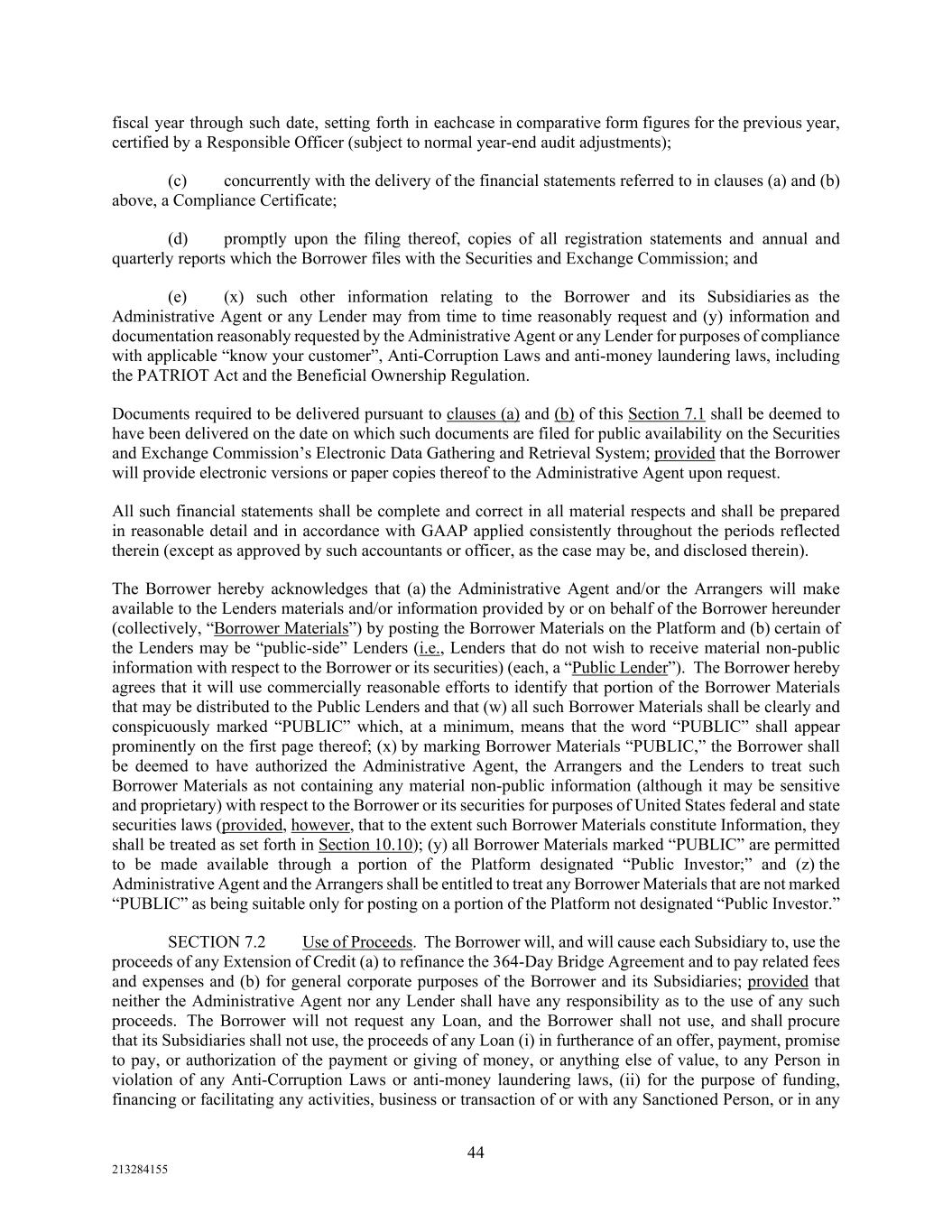 44 213284155 fiscal year through such date, setting forth in each case in comparative form figures for the previous year, certified by a Responsible Officer (subject to normal year-end audit adjustments); (c) concurrently with the delivery of the financial statements referred to in clauses (a) and (b) above, a Compliance Certificate; (d) promptly upon the filing thereof, copies of all registration statements and annual and quarterly reports which the Borrower files with the Securities and Exchange Commission; and (e) (x) such other information relating to the Borrower and its Subsidiaries as the Administrative Agent or any Lender may from time to time reasonably request and (y) information and documentation reasonably requested by the Administrative Agent or any Lender for purposes of compliance with applicable “know your customer”, Anti-Corruption Laws and anti-money laundering laws, including the PATRIOT Act and the Beneficial Ownership Regulation. Documents required to be delivered pursuant to clauses (a) and (b) of this Section 7.1 shall be deemed to have been delivered on the date on which such documents are filed for public availability on the Securities and Exchange Commission’s Electronic Data Gathering and Retrieval System; provided that the Borrower will provide electronic versions or paper copies thereof to the Administrative Agent upon request. All such financial statements shall be complete and correct in all material respects and shall be prepared in reasonable detail and in accordance with GAAP applied consistently throughout the periods reflected therein (except as approved by such accountants or officer, as the case may be, and disclosed therein). The Borrower hereby acknowledges that (a) the Administrative Agent and/or the Arrangers will make available to the Lenders materials and/or information provided by or on behalf of the Borrower hereunder (collectively, “Borrower Materials”) by posting the Borrower Materials on the Platform and (b) certain of the Lenders may be “public-side” Lenders (i.e., Lenders that do not wish to receive material non-public information with respect to the Borrower or its securities) (each, a “Public Lender”). The Borrower hereby agrees that it will use commercially reasonable efforts to identify that portion of the Borrower Materials that may be distributed to the Public Lenders and that (w) all such Borrower Materials shall be clearly and conspicuously marked “PUBLIC” which, at a minimum, means that the word “PUBLIC” shall appear prominently on the first page thereof; (x) by marking Borrower Materials “PUBLIC,” the Borrower shall be deemed to have authorized the Administrative Agent, the Arrangers and the Lenders to treat such Borrower Materials as not containing any material non-public information (although it may be sensitive and proprietary) with respect to the Borrower or its securities for purposes of United States federal and state securities laws (provided, however, that to the extent such Borrower Materials constitute Information, they shall be treated as set forth in Section 10.10); (y) all Borrower Materials marked “PUBLIC” are permitted to be made available through a portion of the Platform designated “Public Investor;” and (z) the Administrative Agent and the Arrangers shall be entitled to treat any Borrower Materials that are not marked “PUBLIC” as being suitable only for posting on a portion of the Platform not designated “Public Investor.” SECTION 7.2 Use of Proceeds. The Borrower will, and will cause each Subsidiary to, use the proceeds of any Extension of Credit (a) to refinance the 364-Day Bridge Agreement and to pay related fees and expenses and (b) for general corporate purposes of the Borrower and its Subsidiaries; provided that neither the Administrative Agent nor any Lender shall have any responsibility as to the use of any such proceeds. The Borrower will not request any Loan, and the Borrower shall not use, and shall procure that its Subsidiaries shall not use, the proceeds of any Loan (i) in furtherance of an offer, payment, promise to pay, or authorization of the payment or giving of money, or anything else of value, to any Person in violation of any Anti-Corruption Laws or anti-money laundering laws, (ii) for the purpose of funding, financing or facilitating any activities, business or transaction of or with any Sanctioned Person, or in any