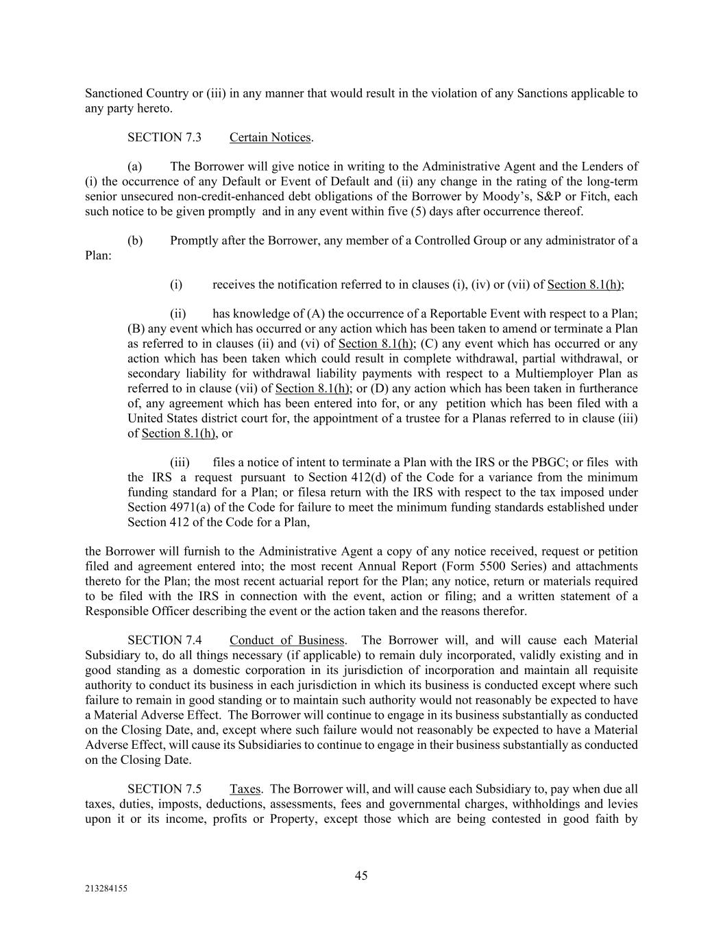 45 213284155 Sanctioned Country or (iii) in any manner that would result in the violation of any Sanctions applicable to any party hereto. SECTION 7.3 Certain Notices. (a) The Borrower will give notice in writing to the Administrative Agent and the Lenders of (i) the occurrence of any Default or Event of Default and (ii) any change in the rating of the long-term senior unsecured non-credit-enhanced debt obligations of the Borrower by Moody’s, S&P or Fitch, each such notice to be given promptly and in any event within five (5) days after occurrence thereof. (b) Promptly after the Borrower, any member of a Controlled Group or any administrator of a Plan: (i) receives the notification referred to in clauses (i), (iv) or (vii) of Section 8.1(h); (ii) has knowledge of (A) the occurrence of a Reportable Event with respect to a Plan; (B) any event which has occurred or any action which has been taken to amend or terminate a Plan as referred to in clauses (ii) and (vi) of Section 8.1(h); (C) any event which has occurred or any action which has been taken which could result in complete withdrawal, partial withdrawal, or secondary liability for withdrawal liability payments with respect to a Multiemployer Plan as referred to in clause (vii) of Section 8.1(h); or (D) any action which has been taken in furtherance of, any agreement which has been entered into for, or any petition which has been filed with a United States district court for, the appointment of a trustee for a Plan as referred to in clause (iii) of Section 8.1(h), or (iii) files a notice of intent to terminate a Plan with the IRS or the PBGC; or files with the IRS a request pursuant to Section 412(d) of the Code for a variance from the minimum funding standard for a Plan; or files a return with the IRS with respect to the tax imposed under Section 4971(a) of the Code for failure to meet the minimum funding standards established under Section 412 of the Code for a Plan, the Borrower will furnish to the Administrative Agent a copy of any notice received, request or petition filed and agreement entered into; the most recent Annual Report (Form 5500 Series) and attachments thereto for the Plan; the most recent actuarial report for the Plan; any notice, return or materials required to be filed with the IRS in connection with the event, action or filing; and a written statement of a Responsible Officer describing the event or the action taken and the reasons therefor. SECTION 7.4 Conduct of Business. The Borrower will, and will cause each Material Subsidiary to, do all things necessary (if applicable) to remain duly incorporated, validly existing and in good standing as a domestic corporation in its jurisdiction of incorporation and maintain all requisite authority to conduct its business in each jurisdiction in which its business is conducted except where such failure to remain in good standing or to maintain such authority would not reasonably be expected to have a Material Adverse Effect. The Borrower will continue to engage in its business substantially as conducted on the Closing Date, and, except where such failure would not reasonably be expected to have a Material Adverse Effect, will cause its Subsidiaries to continue to engage in their business substantially as conducted on the Closing Date. SECTION 7.5 Taxes. The Borrower will, and will cause each Subsidiary to, pay when due all taxes, duties, imposts, deductions, assessments, fees and governmental charges, withholdings and levies upon it or its income, profits or Property, except those which are being contested in good faith by