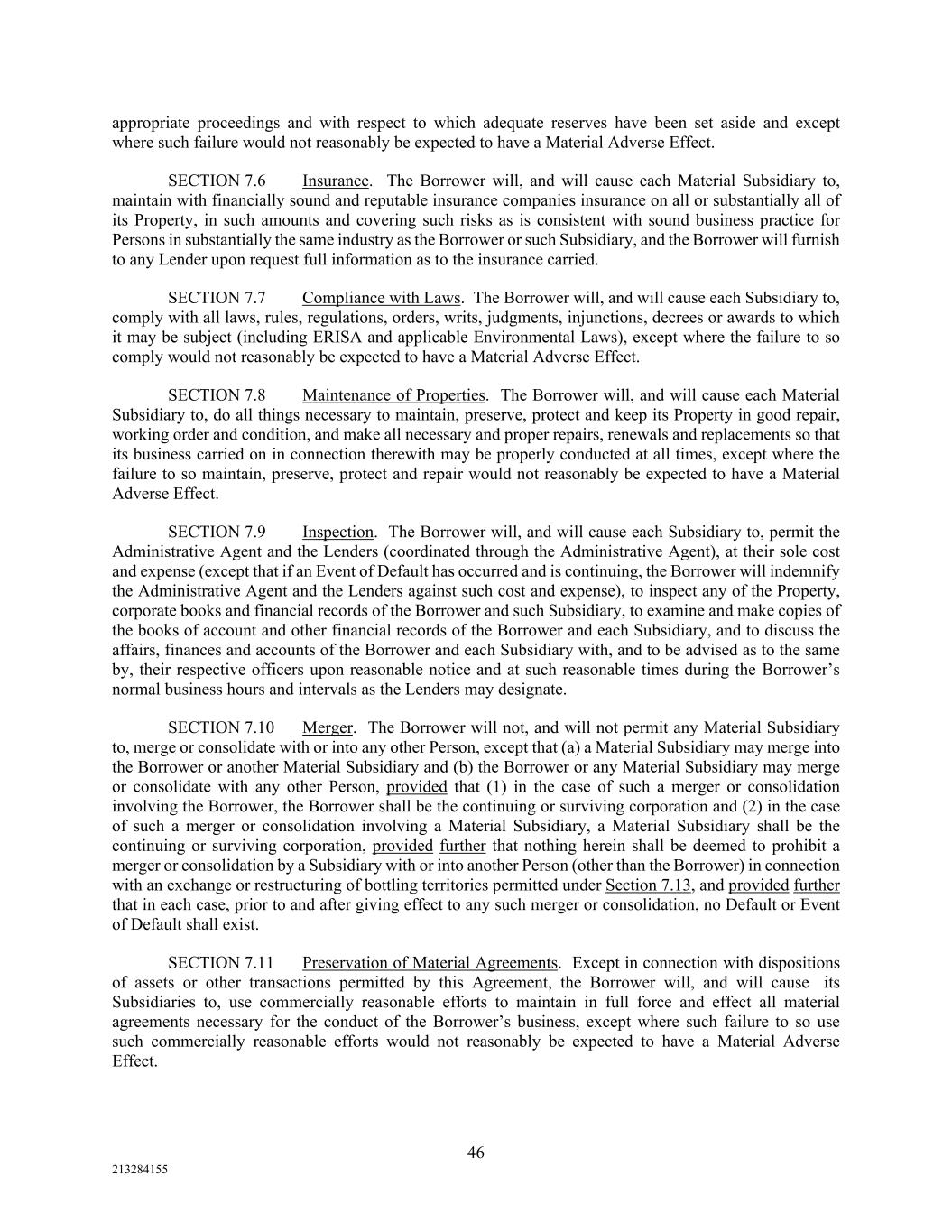 46 213284155 appropriate proceedings and with respect to which adequate reserves have been set aside and except where such failure would not reasonably be expected to have a Material Adverse Effect. SECTION 7.6 Insurance. The Borrower will, and will cause each Material Subsidiary to, maintain with financially sound and reputable insurance companies insurance on all or substantially all of its Property, in such amounts and covering such risks as is consistent with sound business practice for Persons in substantially the same industry as the Borrower or such Subsidiary, and the Borrower will furnish to any Lender upon request full information as to the insurance carried. SECTION 7.7 Compliance with Laws. The Borrower will, and will cause each Subsidiary to, comply with all laws, rules, regulations, orders, writs, judgments, injunctions, decrees or awards to which it may be subject (including ERISA and applicable Environmental Laws), except where the failure to so comply would not reasonably be expected to have a Material Adverse Effect. SECTION 7.8 Maintenance of Properties. The Borrower will, and will cause each Material Subsidiary to, do all things necessary to maintain, preserve, protect and keep its Property in good repair, working order and condition, and make all necessary and proper repairs, renewals and replacements so that its business carried on in connection therewith may be properly conducted at all times, except where the failure to so maintain, preserve, protect and repair would not reasonably be expected to have a Material Adverse Effect. SECTION 7.9 Inspection. The Borrower will, and will cause each Subsidiary to, permit the Administrative Agent and the Lenders (coordinated through the Administrative Agent), at their sole cost and expense (except that if an Event of Default has occurred and is continuing, the Borrower will indemnify the Administrative Agent and the Lenders against such cost and expense), to inspect any of the Property, corporate books and financial records of the Borrower and such Subsidiary, to examine and make copies of the books of account and other financial records of the Borrower and each Subsidiary, and to discuss the affairs, finances and accounts of the Borrower and each Subsidiary with, and to be advised as to the same by, their respective officers upon reasonable notice and at such reasonable times during the Borrower’s normal business hours and intervals as the Lenders may designate. SECTION 7.10 Merger. The Borrower will not, and will not permit any Material Subsidiary to, merge or consolidate with or into any other Person, except that (a) a Material Subsidiary may merge into the Borrower or another Material Subsidiary and (b) the Borrower or any Material Subsidiary may merge or consolidate with any other Person, provided that (1) in the case of such a merger or consolidation involving the Borrower, the Borrower shall be the continuing or surviving corporation and (2) in the case of such a merger or consolidation involving a Material Subsidiary, a Material Subsidiary shall be the continuing or surviving corporation, provided further that nothing herein shall be deemed to prohibit a merger or consolidation by a Subsidiary with or into another Person (other than the Borrower) in connection with an exchange or restructuring of bottling territories permitted under Section 7.13, and provided further that in each case, prior to and after giving effect to any such merger or consolidation, no Default or Event of Default shall exist. SECTION 7.11 Preservation of Material Agreements. Except in connection with dispositions of assets or other transactions permitted by this Agreement, the Borrower will, and will cause its Subsidiaries to, use commercially reasonable efforts to maintain in full force and effect all material agreements necessary for the conduct of the Borrower’s business, except where such failure to so use such commercially reasonable efforts would not reasonably be expected to have a Material Adverse Effect.