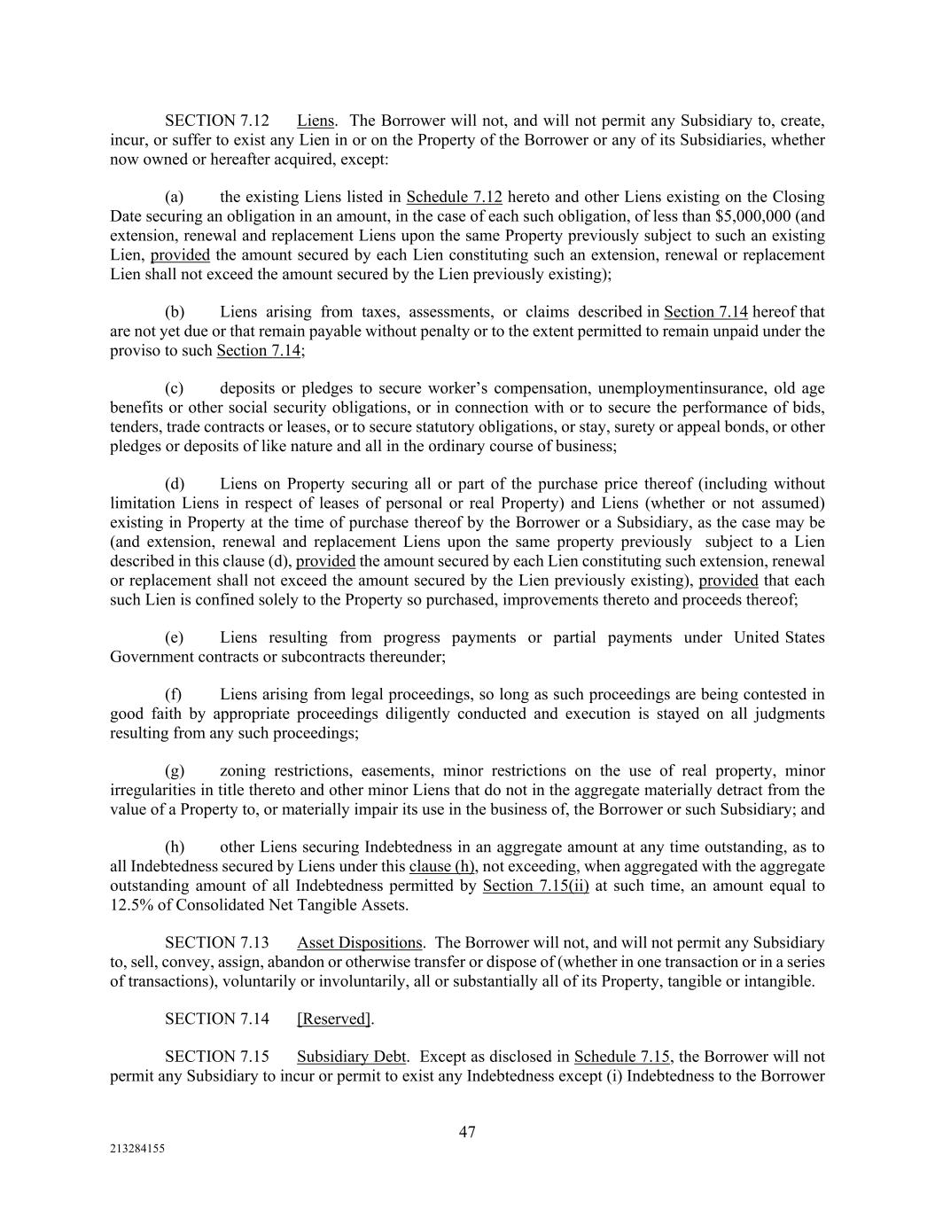 47 213284155 SECTION 7.12 Liens. The Borrower will not, and will not permit any Subsidiary to, create, incur, or suffer to exist any Lien in or on the Property of the Borrower or any of its Subsidiaries, whether now owned or hereafter acquired, except: (a) the existing Liens listed in Schedule 7.12 hereto and other Liens existing on the Closing Date securing an obligation in an amount, in the case of each such obligation, of less than $5,000,000 (and extension, renewal and replacement Liens upon the same Property previously subject to such an existing Lien, provided the amount secured by each Lien constituting such an extension, renewal or replacement Lien shall not exceed the amount secured by the Lien previously existing); (b) Liens arising from taxes, assessments, or claims described in Section 7.14 hereof that are not yet due or that remain payable without penalty or to the extent permitted to remain unpaid under the proviso to such Section 7.14; (c) deposits or pledges to secure worker’s compensation, unemployment insurance, old age benefits or other social security obligations, or in connection with or to secure the performance of bids, tenders, trade contracts or leases, or to secure statutory obligations, or stay, surety or appeal bonds, or other pledges or deposits of like nature and all in the ordinary course of business; (d) Liens on Property securing all or part of the purchase price thereof (including without limitation Liens in respect of leases of personal or real Property) and Liens (whether or not assumed) existing in Property at the time of purchase thereof by the Borrower or a Subsidiary, as the case may be (and extension, renewal and replacement Liens upon the same property previously subject to a Lien described in this clause (d), provided the amount secured by each Lien constituting such extension, renewal or replacement shall not exceed the amount secured by the Lien previously existing), provided that each such Lien is confined solely to the Property so purchased, improvements thereto and proceeds thereof; (e) Liens resulting from progress payments or partial payments under United States Government contracts or subcontracts thereunder; (f) Liens arising from legal proceedings, so long as such proceedings are being contested in good faith by appropriate proceedings diligently conducted and execution is stayed on all judgments resulting from any such proceedings; (g) zoning restrictions, easements, minor restrictions on the use of real property, minor irregularities in title thereto and other minor Liens that do not in the aggregate materially detract from the value of a Property to, or materially impair its use in the business of, the Borrower or such Subsidiary; and (h) other Liens securing Indebtedness in an aggregate amount at any time outstanding, as to all Indebtedness secured by Liens under this clause (h), not exceeding, when aggregated with the aggregate outstanding amount of all Indebtedness permitted by Section 7.15(ii) at such time, an amount equal to 12.5% of Consolidated Net Tangible Assets. SECTION 7.13 Asset Dispositions. The Borrower will not, and will not permit any Subsidiary to, sell, convey, assign, abandon or otherwise transfer or dispose of (whether in one transaction or in a series of transactions), voluntarily or involuntarily, all or substantially all of its Property, tangible or intangible. SECTION 7.14 [Reserved]. SECTION 7.15 Subsidiary Debt. Except as disclosed in Schedule 7.15, the Borrower will not permit any Subsidiary to incur or permit to exist any Indebtedness except (i) Indebtedness to the Borrower