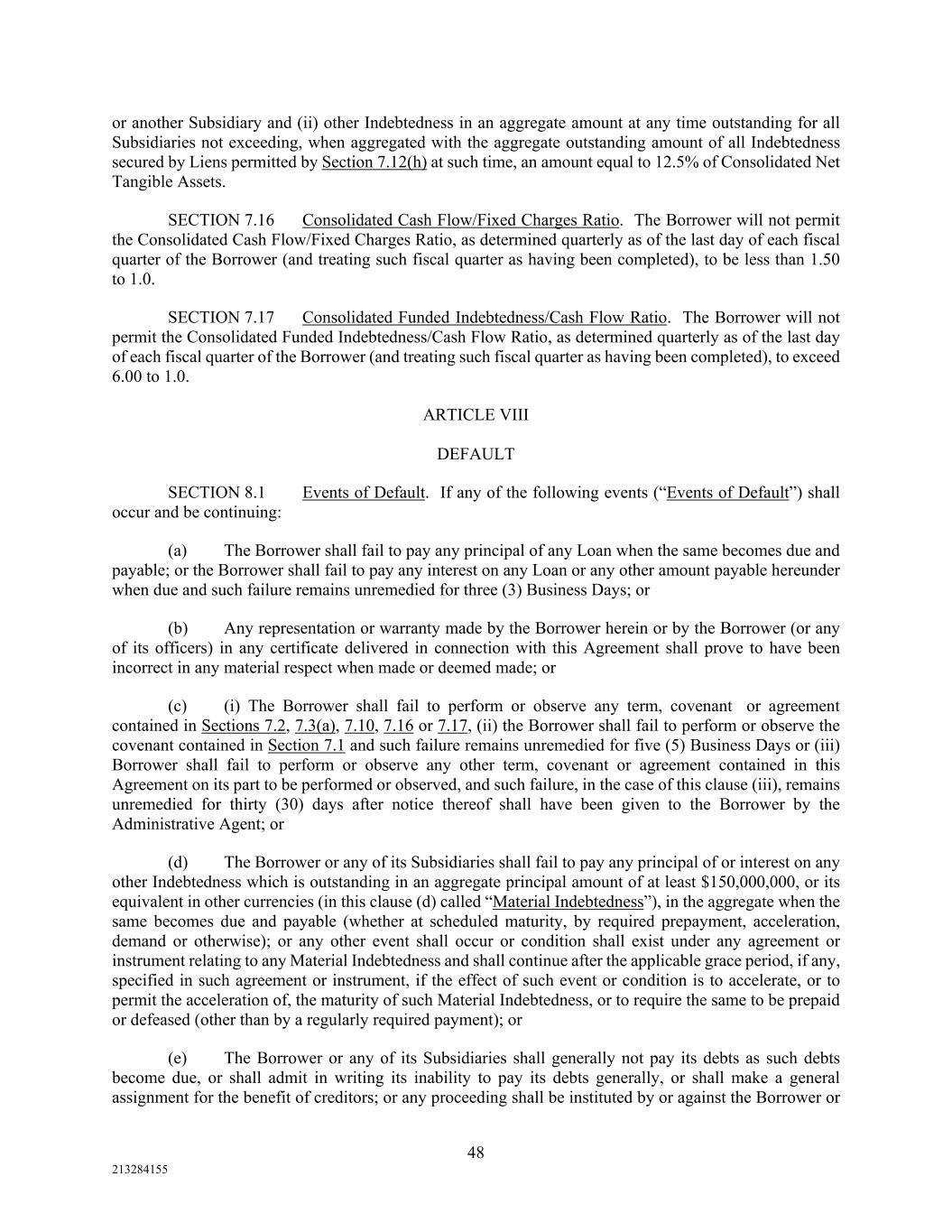 48 213284155 or another Subsidiary and (ii) other Indebtedness in an aggregate amount at any time outstanding for all Subsidiaries not exceeding, when aggregated with the aggregate outstanding amount of all Indebtedness secured by Liens permitted by Section 7.12(h) at such time, an amount equal to 12.5% of Consolidated Net Tangible Assets. SECTION 7.16 Consolidated Cash Flow/Fixed Charges Ratio. The Borrower will not permit the Consolidated Cash Flow/Fixed Charges Ratio, as determined quarterly as of the last day of each fiscal quarter of the Borrower (and treating such fiscal quarter as having been completed), to be less than 1.50 to 1.0. SECTION 7.17 Consolidated Funded Indebtedness/Cash Flow Ratio. The Borrower will not permit the Consolidated Funded Indebtedness/Cash Flow Ratio, as determined quarterly as of the last day of each fiscal quarter of the Borrower (and treating such fiscal quarter as having been completed), to exceed 6.00 to 1.0. ARTICLE VIII DEFAULT SECTION 8.1 Events of Default. If any of the following events (“Events of Default”) shall occur and be continuing: (a) The Borrower shall fail to pay any principal of any Loan when the same becomes due and payable; or the Borrower shall fail to pay any interest on any Loan or any other amount payable hereunder when due and such failure remains unremedied for three (3) Business Days; or (b) Any representation or warranty made by the Borrower herein or by the Borrower (or any of its officers) in any certificate delivered in connection with this Agreement shall prove to have been incorrect in any material respect when made or deemed made; or (c) (i) The Borrower shall fail to perform or observe any term, covenant or agreement contained in Sections 7.2, 7.3(a), 7.10, 7.16 or 7.17, (ii) the Borrower shall fail to perform or observe the covenant contained in Section 7.1 and such failure remains unremedied for five (5) Business Days or (iii) Borrower shall fail to perform or observe any other term, covenant or agreement contained in this Agreement on its part to be performed or observed, and such failure, in the case of this clause (iii), remains unremedied for thirty (30) days after notice thereof shall have been given to the Borrower by the Administrative Agent; or (d) The Borrower or any of its Subsidiaries shall fail to pay any principal of or interest on any other Indebtedness which is outstanding in an aggregate principal amount of at least $150,000,000, or its equivalent in other currencies (in this clause (d) called “Material Indebtedness”), in the aggregate when the same becomes due and payable (whether at scheduled maturity, by required prepayment, acceleration, demand or otherwise); or any other event shall occur or condition shall exist under any agreement or instrument relating to any Material Indebtedness and shall continue after the applicable grace period, if any, specified in such agreement or instrument, if the effect of such event or condition is to accelerate, or to permit the acceleration of, the maturity of such Material Indebtedness, or to require the same to be prepaid or defeased (other than by a regularly required payment); or (e) The Borrower or any of its Subsidiaries shall generally not pay its debts as such debts become due, or shall admit in writing its inability to pay its debts generally, or shall make a general assignment for the benefit of creditors; or any proceeding shall be instituted by or against the Borrower or