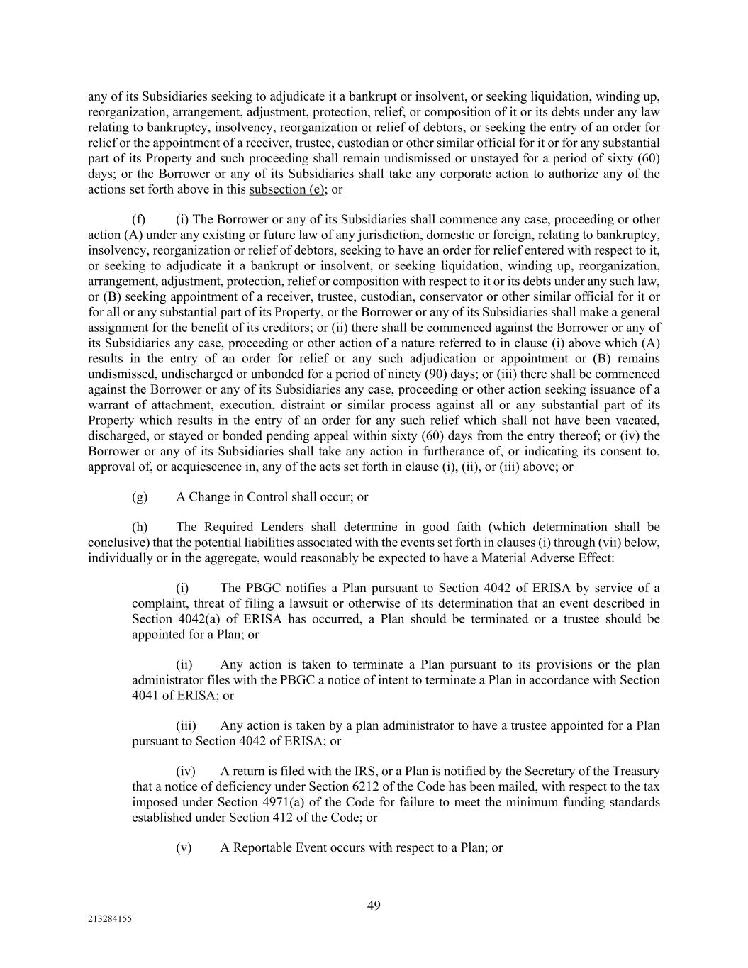49 213284155 any of its Subsidiaries seeking to adjudicate it a bankrupt or insolvent, or seeking liquidation, winding up, reorganization, arrangement, adjustment, protection, relief, or composition of it or its debts under any law relating to bankruptcy, insolvency, reorganization or relief of debtors, or seeking the entry of an order for relief or the appointment of a receiver, trustee, custodian or other similar official for it or for any substantial part of its Property and such proceeding shall remain undismissed or unstayed for a period of sixty (60) days; or the Borrower or any of its Subsidiaries shall take any corporate action to authorize any of the actions set forth above in this subsection (e); or (f) (i) The Borrower or any of its Subsidiaries shall commence any case, proceeding or other action (A) under any existing or future law of any jurisdiction, domestic or foreign, relating to bankruptcy, insolvency, reorganization or relief of debtors, seeking to have an order for relief entered with respect to it, or seeking to adjudicate it a bankrupt or insolvent, or seeking liquidation, winding up, reorganization, arrangement, adjustment, protection, relief or composition with respect to it or its debts under any such law, or (B) seeking appointment of a receiver, trustee, custodian, conservator or other similar official for it or for all or any substantial part of its Property, or the Borrower or any of its Subsidiaries shall make a general assignment for the benefit of its creditors; or (ii) there shall be commenced against the Borrower or any of its Subsidiaries any case, proceeding or other action of a nature referred to in clause (i) above which (A) results in the entry of an order for relief or any such adjudication or appointment or (B) remains undismissed, undischarged or unbonded for a period of ninety (90) days; or (iii) there shall be commenced against the Borrower or any of its Subsidiaries any case, proceeding or other action seeking issuance of a warrant of attachment, execution, distraint or similar process against all or any substantial part of its Property which results in the entry of an order for any such relief which shall not have been vacated, discharged, or stayed or bonded pending appeal within sixty (60) days from the entry thereof; or (iv) the Borrower or any of its Subsidiaries shall take any action in furtherance of, or indicating its consent to, approval of, or acquiescence in, any of the acts set forth in clause (i), (ii), or (iii) above; or (g) A Change in Control shall occur; or (h) The Required Lenders shall determine in good faith (which determination shall be conclusive) that the potential liabilities associated with the events set forth in clauses (i) through (vii) below, individually or in the aggregate, would reasonably be expected to have a Material Adverse Effect: (i) The PBGC notifies a Plan pursuant to Section 4042 of ERISA by service of a complaint, threat of filing a lawsuit or otherwise of its determination that an event described in Section 4042(a) of ERISA has occurred, a Plan should be terminated or a trustee should be appointed for a Plan; or (ii) Any action is taken to terminate a Plan pursuant to its provisions or the plan administrator files with the PBGC a notice of intent to terminate a Plan in accordance with Section 4041 of ERISA; or (iii) Any action is taken by a plan administrator to have a trustee appointed for a Plan pursuant to Section 4042 of ERISA; or (iv) A return is filed with the IRS, or a Plan is notified by the Secretary of the Treasury that a notice of deficiency under Section 6212 of the Code has been mailed, with respect to the tax imposed under Section 4971(a) of the Code for failure to meet the minimum funding standards established under Section 412 of the Code; or (v) A Reportable Event occurs with respect to a Plan; or