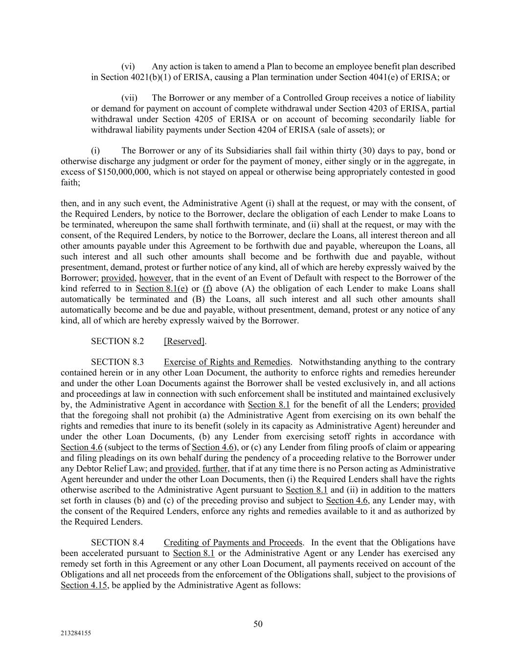 50 213284155 (vi) Any action is taken to amend a Plan to become an employee benefit plan described in Section 4021(b)(1) of ERISA, causing a Plan termination under Section 4041(e) of ERISA; or (vii) The Borrower or any member of a Controlled Group receives a notice of liability or demand for payment on account of complete withdrawal under Section 4203 of ERISA, partial withdrawal under Section 4205 of ERISA or on account of becoming secondarily liable for withdrawal liability payments under Section 4204 of ERISA (sale of assets); or (i) The Borrower or any of its Subsidiaries shall fail within thirty (30) days to pay, bond or otherwise discharge any judgment or order for the payment of money, either singly or in the aggregate, in excess of $150,000,000, which is not stayed on appeal or otherwise being appropriately contested in good faith; then, and in any such event, the Administrative Agent (i) shall at the request, or may with the consent, of the Required Lenders, by notice to the Borrower, declare the obligation of each Lender to make Loans to be terminated, whereupon the same shall forthwith terminate, and (ii) shall at the request, or may with the consent, of the Required Lenders, by notice to the Borrower, declare the Loans, all interest thereon and all other amounts payable under this Agreement to be forthwith due and payable, whereupon the Loans, all such interest and all such other amounts shall become and be forthwith due and payable, without presentment, demand, protest or further notice of any kind, all of which are hereby expressly waived by the Borrower; provided, however, that in the event of an Event of Default with respect to the Borrower of the kind referred to in Section 8.1(e) or (f) above (A) the obligation of each Lender to make Loans shall automatically be terminated and (B) the Loans, all such interest and all such other amounts shall automatically become and be due and payable, without presentment, demand, protest or any notice of any kind, all of which are hereby expressly waived by the Borrower. SECTION 8.2 [Reserved]. SECTION 8.3 Exercise of Rights and Remedies. Notwithstanding anything to the contrary contained herein or in any other Loan Document, the authority to enforce rights and remedies hereunder and under the other Loan Documents against the Borrower shall be vested exclusively in, and all actions and proceedings at law in connection with such enforcement shall be instituted and maintained exclusively by, the Administrative Agent in accordance with Section 8.1 for the benefit of all the Lenders; provided that the foregoing shall not prohibit (a) the Administrative Agent from exercising on its own behalf the rights and remedies that inure to its benefit (solely in its capacity as Administrative Agent) hereunder and under the other Loan Documents, (b) any Lender from exercising setoff rights in accordance with Section 4.6 (subject to the terms of Section 4.6), or (c) any Lender from filing proofs of claim or appearing and filing pleadings on its own behalf during the pendency of a proceeding relative to the Borrower under any Debtor Relief Law; and provided, further, that if at any time there is no Person acting as Administrative Agent hereunder and under the other Loan Documents, then (i) the Required Lenders shall have the rights otherwise ascribed to the Administrative Agent pursuant to Section 8.1 and (ii) in addition to the matters set forth in clauses (b) and (c) of the preceding proviso and subject to Section 4.6, any Lender may, with the consent of the Required Lenders, enforce any rights and remedies available to it and as authorized by the Required Lenders. SECTION 8.4 Crediting of Payments and Proceeds. In the event that the Obligations have been accelerated pursuant to Section 8.1 or the Administrative Agent or any Lender has exercised any remedy set forth in this Agreement or any other Loan Document, all payments received on account of the Obligations and all net proceeds from the enforcement of the Obligations shall, subject to the provisions of Section 4.15, be applied by the Administrative Agent as follows: