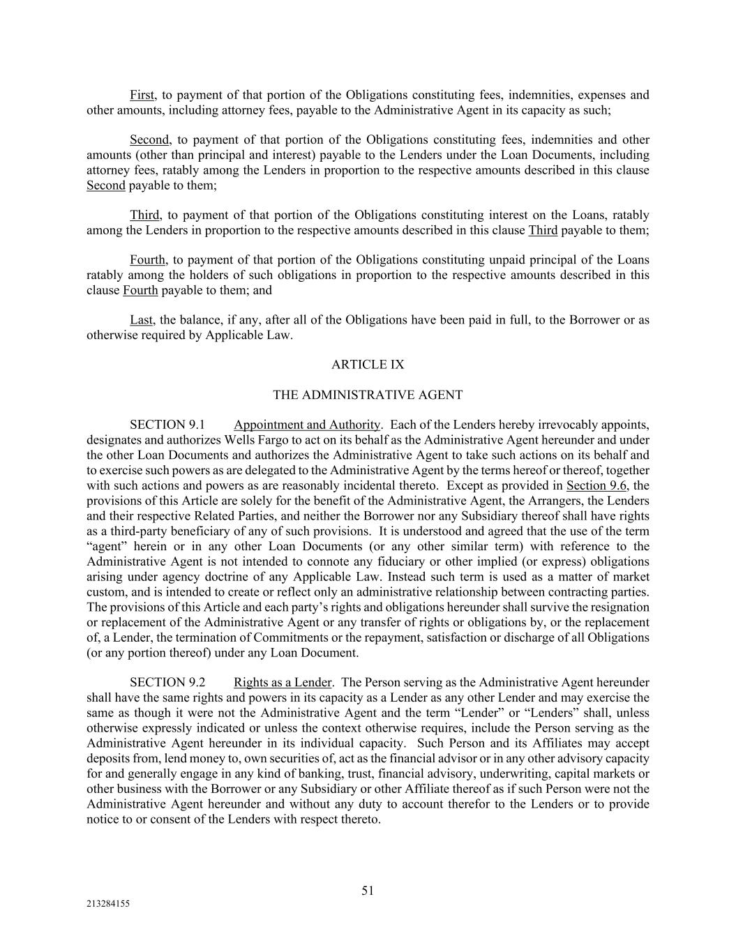 51 213284155 First, to payment of that portion of the Obligations constituting fees, indemnities, expenses and other amounts, including attorney fees, payable to the Administrative Agent in its capacity as such; Second, to payment of that portion of the Obligations constituting fees, indemnities and other amounts (other than principal and interest) payable to the Lenders under the Loan Documents, including attorney fees, ratably among the Lenders in proportion to the respective amounts described in this clause Second payable to them; Third, to payment of that portion of the Obligations constituting interest on the Loans, ratably among the Lenders in proportion to the respective amounts described in this clause Third payable to them; Fourth, to payment of that portion of the Obligations constituting unpaid principal of the Loans ratably among the holders of such obligations in proportion to the respective amounts described in this clause Fourth payable to them; and Last, the balance, if any, after all of the Obligations have been paid in full, to the Borrower or as otherwise required by Applicable Law. ARTICLE IX THE ADMINISTRATIVE AGENT SECTION 9.1 Appointment and Authority. Each of the Lenders hereby irrevocably appoints, designates and authorizes Wells Fargo to act on its behalf as the Administrative Agent hereunder and under the other Loan Documents and authorizes the Administrative Agent to take such actions on its behalf and to exercise such powers as are delegated to the Administrative Agent by the terms hereof or thereof, together with such actions and powers as are reasonably incidental thereto. Except as provided in Section 9.6, the provisions of this Article are solely for the benefit of the Administrative Agent, the Arrangers, the Lenders and their respective Related Parties, and neither the Borrower nor any Subsidiary thereof shall have rights as a third-party beneficiary of any of such provisions. It is understood and agreed that the use of the term “agent” herein or in any other Loan Documents (or any other similar term) with reference to the Administrative Agent is not intended to connote any fiduciary or other implied (or express) obligations arising under agency doctrine of any Applicable Law. Instead such term is used as a matter of market custom, and is intended to create or reflect only an administrative relationship between contracting parties. The provisions of this Article and each party’s rights and obligations hereunder shall survive the resignation or replacement of the Administrative Agent or any transfer of rights or obligations by, or the replacement of, a Lender, the termination of Commitments or the repayment, satisfaction or discharge of all Obligations (or any portion thereof) under any Loan Document. SECTION 9.2 Rights as a Lender. The Person serving as the Administrative Agent hereunder shall have the same rights and powers in its capacity as a Lender as any other Lender and may exercise the same as though it were not the Administrative Agent and the term “Lender” or “Lenders” shall, unless otherwise expressly indicated or unless the context otherwise requires, include the Person serving as the Administrative Agent hereunder in its individual capacity. Such Person and its Affiliates may accept deposits from, lend money to, own securities of, act as the financial advisor or in any other advisory capacity for and generally engage in any kind of banking, trust, financial advisory, underwriting, capital markets or other business with the Borrower or any Subsidiary or other Affiliate thereof as if such Person were not the Administrative Agent hereunder and without any duty to account therefor to the Lenders or to provide notice to or consent of the Lenders with respect thereto.