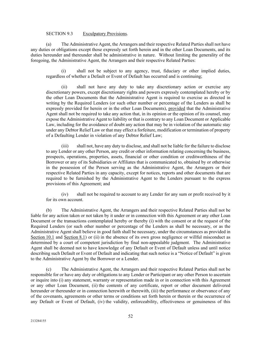 52 213284155 SECTION 9.3 Exculpatory Provisions. (a) The Administrative Agent, the Arrangers and their respective Related Parties shall not have any duties or obligations except those expressly set forth herein and in the other Loan Documents, and its duties hereunder and thereunder shall be administrative in nature. Without limiting the generality of the foregoing, the Administrative Agent, the Arrangers and their respective Related Parties: (i) shall not be subject to any agency, trust, fiduciary or other implied duties, regardless of whether a Default or Event of Default has occurred and is continuing; (ii) shall not have any duty to take any discretionary action or exercise any discretionary powers, except discretionary rights and powers expressly contemplated hereby or by the other Loan Documents that the Administrative Agent is required to exercise as directed in writing by the Required Lenders (or such other number or percentage of the Lenders as shall be expressly provided for herein or in the other Loan Documents), provided that the Administrative Agent shall not be required to take any action that, in its opinion or the opinion of its counsel, may expose the Administrative Agent to liability or that is contrary to any Loan Document or Applicable Law, including for the avoidance of doubt any action that may be in violation of the automatic stay under any Debtor Relief Law or that may effect a forfeiture, modification or termination of property of a Defaulting Lender in violation of any Debtor Relief Law; (iii) shall not, have any duty to disclose, and shall not be liable for the failure to disclose to any Lender or any other Person, any credit or other information relating concerning the business, prospects, operations, properties, assets, financial or other condition or creditworthiness of the Borrower or any of its Subsidiaries or Affiliates that is communicated to, obtained by or otherwise in the possession of the Person serving as the Administrative Agent, the Arrangers or their respective Related Parties in any capacity, except for notices, reports and other documents that are required to be furnished by the Administrative Agent to the Lenders pursuant to the express provisions of this Agreement; and (iv) shall not be required to account to any Lender for any sum or profit received by it for its own account. (b) The Administrative Agent, the Arrangers and their respective Related Parties shall not be liable for any action taken or not taken by it under or in connection with this Agreement or any other Loan Document or the transactions contemplated hereby or thereby (i) with the consent or at the request of the Required Lenders (or such other number or percentage of the Lenders as shall be necessary, or as the Administrative Agent shall believe in good faith shall be necessary, under the circumstances as provided in Section 10.1 and Section 8.1) or (ii) in the absence of its own gross negligence or willful misconduct as determined by a court of competent jurisdiction by final non-appealable judgment. The Administrative Agent shall be deemed not to have knowledge of any Default or Event of Default unless and until notice describing such Default or Event of Default and indicating that such notice is a “Notice of Default” is given to the Administrative Agent by the Borrower or a Lender. (c) The Administrative Agent, the Arrangers and their respective Related Parties shall not be responsible for or have any duty or obligations to any Lender or Participant or any other Person to ascertain or inquire into (i) any statement, warranty or representation made in or in connection with this Agreement or any other Loan Document, (ii) the contents of any certificate, report or other document delivered hereunder or thereunder or in connection herewith or therewith, (iii) the performance or observance of any of the covenants, agreements or other terms or conditions set forth herein or therein or the occurrence of any Default or Event of Default, (iv) the validity, enforceability, effectiveness or genuineness of this