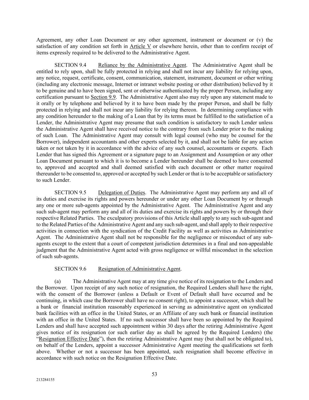 53 213284155 Agreement, any other Loan Document or any other agreement, instrument or document or (v) the satisfaction of any condition set forth in Article V or elsewhere herein, other than to confirm receipt of items expressly required to be delivered to the Administrative Agent. SECTION 9.4 Reliance by the Administrative Agent. The Administrative Agent shall be entitled to rely upon, shall be fully protected in relying and shall not incur any liability for relying upon, any notice, request, certificate, consent, communication, statement, instrument, document or other writing (including any electronic message, Internet or intranet website posting or other distribution) believed by it to be genuine and to have been signed, sent or otherwise authenticated by the proper Person, including any certification pursuant to Section 9.9. The Administrative Agent also may rely upon any statement made to it orally or by telephone and believed by it to have been made by the proper Person, and shall be fully protected in relying and shall not incur any liability for relying thereon. In determining compliance with any condition hereunder to the making of a Loan that by its terms must be fulfilled to the satisfaction of a Lender, the Administrative Agent may presume that such condition is satisfactory to such Lender unless the Administrative Agent shall have received notice to the contrary from such Lender prior to the making of such Loan. The Administrative Agent may consult with legal counsel (who may be counsel for the Borrower), independent accountants and other experts selected by it, and shall not be liable for any action taken or not taken by it in accordance with the advice of any such counsel, accountants or experts. Each Lender that has signed this Agreement or a signature page to an Assignment and Assumption or any other Loan Document pursuant to which it is to become a Lender hereunder shall be deemed to have consented to, approved and accepted and shall deemed satisfied with each document or other matter required thereunder to be consented to, approved or accepted by such Lender or that is to be acceptable or satisfactory to such Lender. SECTION 9.5 Delegation of Duties. The Administrative Agent may perform any and all of its duties and exercise its rights and powers hereunder or under any other Loan Document by or through any one or more sub-agents appointed by the Administrative Agent. The Administrative Agent and any such sub-agent may perform any and all of its duties and exercise its rights and powers by or through their respective Related Parties. The exculpatory provisions of this Article shall apply to any such sub-agent and to the Related Parties of the Administrative Agent and any such sub-agent, and shall apply to their respective activities in connection with the syndication of the Credit Facility as well as activities as Administrative Agent. The Administrative Agent shall not be responsible for the negligence or misconduct of any sub- agents except to the extent that a court of competent jurisdiction determines in a final and non-appealable judgment that the Administrative Agent acted with gross negligence or willful misconduct in the selection of such sub-agents. SECTION 9.6 Resignation of Administrative Agent. (a) The Administrative Agent may at any time give notice of its resignation to the Lenders and the Borrower. Upon receipt of any such notice of resignation, the Required Lenders shall have the right, with the consent of the Borrower (unless a Default or Event of Default shall have occurred and be continuing, in which case the Borrower shall have no consent right), to appoint a successor, which shall be a bank or financial institution reasonably experienced in serving as administrative agent on syndicated bank facilities with an office in the United States, or an Affiliate of any such bank or financial institution with an office in the United States. If no such successor shall have been so appointed by the Required Lenders and shall have accepted such appointment within 30 days after the retiring Administrative Agent gives notice of its resignation (or such earlier day as shall be agreed by the Required Lenders) (the “Resignation Effective Date”), then the retiring Administrative Agent may (but shall not be obligated to), on behalf of the Lenders, appoint a successor Administrative Agent meeting the qualifications set forth above. Whether or not a successor has been appointed, such resignation shall become effective in accordance with such notice on the Resignation Effective Date.
