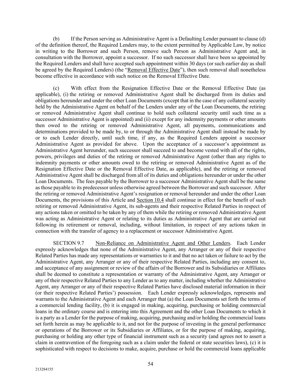 54 213284155 (b) If the Person serving as Administrative Agent is a Defaulting Lender pursuant to clause (d) of the definition thereof, the Required Lenders may, to the extent permitted by Applicable Law, by notice in writing to the Borrower and such Person, remove such Person as Administrative Agent and, in consultation with the Borrower, appoint a successor. If no such successor shall have been so appointed by the Required Lenders and shall have accepted such appointment within 30 days (or such earlier day as shall be agreed by the Required Lenders) (the “Removal Effective Date”), then such removal shall nonetheless become effective in accordance with such notice on the Removal Effective Date. (c) With effect from the Resignation Effective Date or the Removal Effective Date (as applicable), (i) the retiring or removed Administrative Agent shall be discharged from its duties and obligations hereunder and under the other Loan Documents (except that in the case of any collateral security held by the Administrative Agent on behalf of the Lenders under any of the Loan Documents, the retiring or removed Administrative Agent shall continue to hold such collateral security until such time as a successor Administrative Agent is appointed) and (ii) except for any indemnity payments or other amounts then owed to the retiring or removed Administrative Agent, all payments, communications and determinations provided to be made by, to or through the Administrative Agent shall instead be made by or to each Lender directly, until such time, if any, as the Required Lenders appoint a successor Administrative Agent as provided for above. Upon the acceptance of a successor’s appointment as Administrative Agent hereunder, such successor shall succeed to and become vested with all of the rights, powers, privileges and duties of the retiring or removed Administrative Agent (other than any rights to indemnity payments or other amounts owed to the retiring or removed Administrative Agent as of the Resignation Effective Date or the Removal Effective Date, as applicable), and the retiring or removed Administrative Agent shall be discharged from all of its duties and obligations hereunder or under the other Loan Documents. The fees payable by the Borrower to a successor Administrative Agent shall be the same as those payable to its predecessor unless otherwise agreed between the Borrower and such successor. After the retiring or removed Administrative Agent’s resignation or removal hereunder and under the other Loan Documents, the provisions of this Article and Section 10.4 shall continue in effect for the benefit of such retiring or removed Administrative Agent, its sub-agents and their respective Related Parties in respect of any actions taken or omitted to be taken by any of them while the retiring or removed Administrative Agent was acting as Administrative Agent or relating to its duties as Administrative Agent that are carried out following its retirement or removal, including, without limitation, in respect of any actions taken in connection with the transfer of agency to a replacement or successor Administrative Agent. SECTION 9.7 Non-Reliance on Administrative Agent and Other Lenders. Each Lender expressly acknowledges that none of the Administrative Agent, any Arranger or any of their respective Related Parties has made any representations or warranties to it and that no act taken or failure to act by the Administrative Agent, any Arranger or any of their respective Related Parties, including any consent to, and acceptance of any assignment or review of the affairs of the Borrower and its Subsidiaries or Affiliates shall be deemed to constitute a representation or warranty of the Administrative Agent, any Arranger or any of their respective Related Parties to any Lender as to any matter, including whether the Administrative Agent, any Arranger or any of their respective Related Parties have disclosed material information in their (or their respective Related Parties’) possession. Each Lender expressly acknowledges, represents and warrants to the Administrative Agent and each Arranger that (a) the Loan Documents set forth the terms of a commercial lending facility, (b) it is engaged in making, acquiring, purchasing or holding commercial loans in the ordinary course and is entering into this Agreement and the other Loan Documents to which it is a party as a Lender for the purpose of making, acquiring, purchasing and/or holding the commercial loans set forth herein as may be applicable to it, and not for the purpose of investing in the general performance or operations of the Borrower or its Subsidiaries or Affiliates, or for the purpose of making, acquiring, purchasing or holding any other type of financial instrument such as a security (and agrees not to assert a claim in contravention of the foregoing such as a claim under the federal or state securities laws), (c) it is sophisticated with respect to decisions to make, acquire, purchase or hold the commercial loans applicable