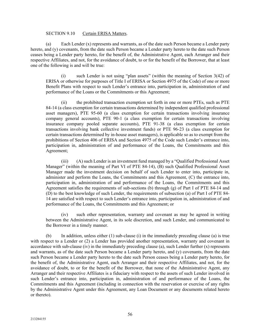 56 213284155 SECTION 9.10 Certain ERISA Matters. (a) Each Lender (x) represents and warrants, as of the date such Person became a Lender party hereto, and (y) covenants, from the date such Person became a Lender party hereto to the date such Person ceases being a Lender party hereto, for the benefit of, the Administrative Agent, each Arranger and their respective Affiliates, and not, for the avoidance of doubt, to or for the benefit of the Borrower, that at least one of the following is and will be true: (i) such Lender is not using “plan assets” (within the meaning of Section 3(42) of ERISA or otherwise for purposes of Title I of ERISA or Section 4975 of the Code) of one or more Benefit Plans with respect to such Lender’s entrance into, participation in, administration of and performance of the Loans or the Commitments or this Agreement; (ii) the prohibited transaction exemption set forth in one or more PTEs, such as PTE 84-14 (a class exemption for certain transactions determined by independent qualified professional asset managers), PTE 95-60 (a class exemption for certain transactions involving insurance company general accounts), PTE 90-1 (a class exemption for certain transactions involving insurance company pooled separate accounts), PTE 91-38 (a class exemption for certain transactions involving bank collective investment funds) or PTE 96-23 (a class exemption for certain transactions determined by in-house asset managers), is applicable so as to exempt from the prohibitions of Section 406 of ERISA and Section 4975 of the Code such Lender’s entrance into, participation in, administration of and performance of the Loans, the Commitments and this Agreement; (iii) (A) such Lender is an investment fund managed by a “Qualified Professional Asset Manager” (within the meaning of Part VI of PTE 84-14), (B) such Qualified Professional Asset Manager made the investment decision on behalf of such Lender to enter into, participate in, administer and perform the Loans, the Commitments and this Agreement, (C) the entrance into, participation in, administration of and performance of the Loans, the Commitments and this Agreement satisfies the requirements of sub-sections (b) through (g) of Part I of PTE 84-14 and (D) to the best knowledge of such Lender, the requirements of subsection (a) of Part I of PTE 84- 14 are satisfied with respect to such Lender’s entrance into, participation in, administration of and performance of the Loans, the Commitments and this Agreement; or (iv) such other representation, warranty and covenant as may be agreed in writing between the Administrative Agent, in its sole discretion, and such Lender, and communicated to the Borrower in a timely manner. (b) In addition, unless either (1) sub-clause (i) in the immediately preceding clause (a) is true with respect to a Lender or (2) a Lender has provided another representation, warranty and covenant in accordance with sub-clause (iv) in the immediately preceding clause (a), such Lender further (x) represents and warrants, as of the date such Person became a Lender party hereto, and (y) covenants, from the date such Person became a Lender party hereto to the date such Person ceases being a Lender party hereto, for the benefit of, the Administrative Agent, each Arranger and their respective Affiliates, and not, for the avoidance of doubt, to or for the benefit of the Borrower, that none of the Administrative Agent, any Arranger and their respective Affiliates is a fiduciary with respect to the assets of such Lender involved in such Lender’s entrance into, participation in, administration of and performance of the Loans, the Commitments and this Agreement (including in connection with the reservation or exercise of any rights by the Administrative Agent under this Agreement, any Loan Document or any documents related hereto or thereto).