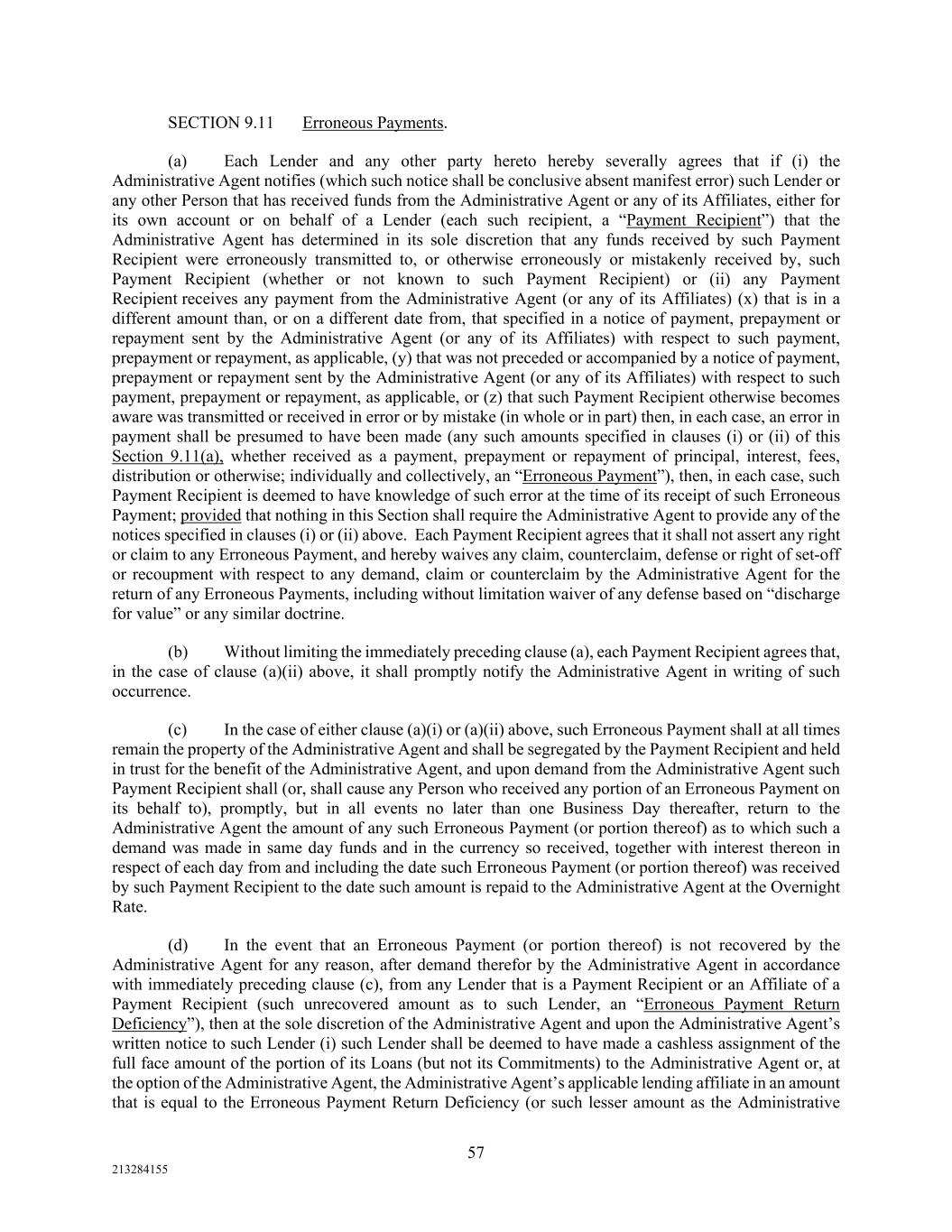 57 213284155 SECTION 9.11 Erroneous Payments. (a) Each Lender and any other party hereto hereby severally agrees that if (i) the Administrative Agent notifies (which such notice shall be conclusive absent manifest error) such Lender or any other Person that has received funds from the Administrative Agent or any of its Affiliates, either for its own account or on behalf of a Lender (each such recipient, a “Payment Recipient”) that the Administrative Agent has determined in its sole discretion that any funds received by such Payment Recipient were erroneously transmitted to, or otherwise erroneously or mistakenly received by, such Payment Recipient (whether or not known to such Payment Recipient) or (ii) any Payment Recipient receives any payment from the Administrative Agent (or any of its Affiliates) (x) that is in a different amount than, or on a different date from, that specified in a notice of payment, prepayment or repayment sent by the Administrative Agent (or any of its Affiliates) with respect to such payment, prepayment or repayment, as applicable, (y) that was not preceded or accompanied by a notice of payment, prepayment or repayment sent by the Administrative Agent (or any of its Affiliates) with respect to such payment, prepayment or repayment, as applicable, or (z) that such Payment Recipient otherwise becomes aware was transmitted or received in error or by mistake (in whole or in part) then, in each case, an error in payment shall be presumed to have been made (any such amounts specified in clauses (i) or (ii) of this Section 9.11(a), whether received as a payment, prepayment or repayment of principal, interest, fees, distribution or otherwise; individually and collectively, an “Erroneous Payment”), then, in each case, such Payment Recipient is deemed to have knowledge of such error at the time of its receipt of such Erroneous Payment; provided that nothing in this Section shall require the Administrative Agent to provide any of the notices specified in clauses (i) or (ii) above. Each Payment Recipient agrees that it shall not assert any right or claim to any Erroneous Payment, and hereby waives any claim, counterclaim, defense or right of set-off or recoupment with respect to any demand, claim or counterclaim by the Administrative Agent for the return of any Erroneous Payments, including without limitation waiver of any defense based on “discharge for value” or any similar doctrine. (b) Without limiting the immediately preceding clause (a), each Payment Recipient agrees that, in the case of clause (a)(ii) above, it shall promptly notify the Administrative Agent in writing of such occurrence. (c) In the case of either clause (a)(i) or (a)(ii) above, such Erroneous Payment shall at all times remain the property of the Administrative Agent and shall be segregated by the Payment Recipient and held in trust for the benefit of the Administrative Agent, and upon demand from the Administrative Agent such Payment Recipient shall (or, shall cause any Person who received any portion of an Erroneous Payment on its behalf to), promptly, but in all events no later than one Business Day thereafter, return to the Administrative Agent the amount of any such Erroneous Payment (or portion thereof) as to which such a demand was made in same day funds and in the currency so received, together with interest thereon in respect of each day from and including the date such Erroneous Payment (or portion thereof) was received by such Payment Recipient to the date such amount is repaid to the Administrative Agent at the Overnight Rate. (d) In the event that an Erroneous Payment (or portion thereof) is not recovered by the Administrative Agent for any reason, after demand therefor by the Administrative Agent in accordance with immediately preceding clause (c), from any Lender that is a Payment Recipient or an Affiliate of a Payment Recipient (such unrecovered amount as to such Lender, an “Erroneous Payment Return Deficiency”), then at the sole discretion of the Administrative Agent and upon the Administrative Agent’s written notice to such Lender (i) such Lender shall be deemed to have made a cashless assignment of the full face amount of the portion of its Loans (but not its Commitments) to the Administrative Agent or, at the option of the Administrative Agent, the Administrative Agent’s applicable lending affiliate in an amount that is equal to the Erroneous Payment Return Deficiency (or such lesser amount as the Administrative