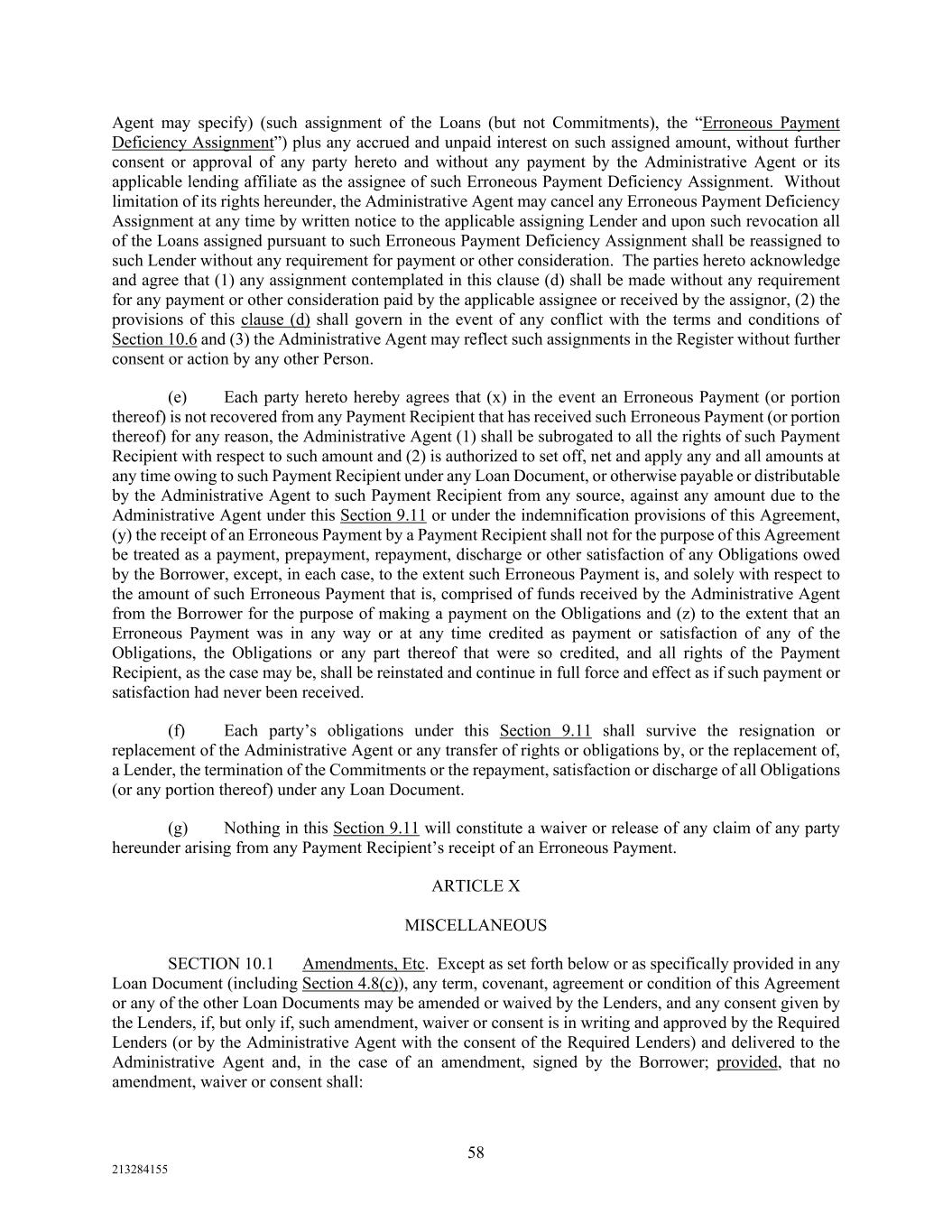 58 213284155 Agent may specify) (such assignment of the Loans (but not Commitments), the “Erroneous Payment Deficiency Assignment”) plus any accrued and unpaid interest on such assigned amount, without further consent or approval of any party hereto and without any payment by the Administrative Agent or its applicable lending affiliate as the assignee of such Erroneous Payment Deficiency Assignment. Without limitation of its rights hereunder, the Administrative Agent may cancel any Erroneous Payment Deficiency Assignment at any time by written notice to the applicable assigning Lender and upon such revocation all of the Loans assigned pursuant to such Erroneous Payment Deficiency Assignment shall be reassigned to such Lender without any requirement for payment or other consideration. The parties hereto acknowledge and agree that (1) any assignment contemplated in this clause (d) shall be made without any requirement for any payment or other consideration paid by the applicable assignee or received by the assignor, (2) the provisions of this clause (d) shall govern in the event of any conflict with the terms and conditions of Section 10.6 and (3) the Administrative Agent may reflect such assignments in the Register without further consent or action by any other Person. (e) Each party hereto hereby agrees that (x) in the event an Erroneous Payment (or portion thereof) is not recovered from any Payment Recipient that has received such Erroneous Payment (or portion thereof) for any reason, the Administrative Agent (1) shall be subrogated to all the rights of such Payment Recipient with respect to such amount and (2) is authorized to set off, net and apply any and all amounts at any time owing to such Payment Recipient under any Loan Document, or otherwise payable or distributable by the Administrative Agent to such Payment Recipient from any source, against any amount due to the Administrative Agent under this Section 9.11 or under the indemnification provisions of this Agreement, (y) the receipt of an Erroneous Payment by a Payment Recipient shall not for the purpose of this Agreement be treated as a payment, prepayment, repayment, discharge or other satisfaction of any Obligations owed by the Borrower, except, in each case, to the extent such Erroneous Payment is, and solely with respect to the amount of such Erroneous Payment that is, comprised of funds received by the Administrative Agent from the Borrower for the purpose of making a payment on the Obligations and (z) to the extent that an Erroneous Payment was in any way or at any time credited as payment or satisfaction of any of the Obligations, the Obligations or any part thereof that were so credited, and all rights of the Payment Recipient, as the case may be, shall be reinstated and continue in full force and effect as if such payment or satisfaction had never been received. (f) Each party’s obligations under this Section 9.11 shall survive the resignation or replacement of the Administrative Agent or any transfer of rights or obligations by, or the replacement of, a Lender, the termination of the Commitments or the repayment, satisfaction or discharge of all Obligations (or any portion thereof) under any Loan Document. (g) Nothing in this Section 9.11 will constitute a waiver or release of any claim of any party hereunder arising from any Payment Recipient’s receipt of an Erroneous Payment. ARTICLE X MISCELLANEOUS SECTION 10.1 Amendments, Etc. Except as set forth below or as specifically provided in any Loan Document (including Section 4.8(c)), any term, covenant, agreement or condition of this Agreement or any of the other Loan Documents may be amended or waived by the Lenders, and any consent given by the Lenders, if, but only if, such amendment, waiver or consent is in writing and approved by the Required Lenders (or by the Administrative Agent with the consent of the Required Lenders) and delivered to the Administrative Agent and, in the case of an amendment, signed by the Borrower; provided, that no amendment, waiver or consent shall: