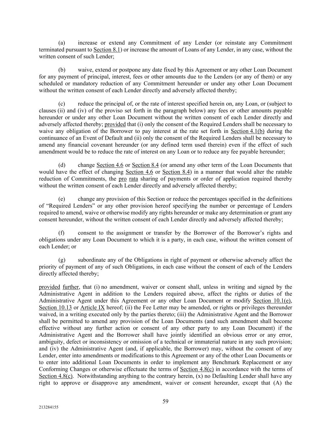 59 213284155 (a) increase or extend any Commitment of any Lender (or reinstate any Commitment terminated pursuant to Section 8.1) or increase the amount of Loans of any Lender, in any case, without the written consent of such Lender; (b) waive, extend or postpone any date fixed by this Agreement or any other Loan Document for any payment of principal, interest, fees or other amounts due to the Lenders (or any of them) or any scheduled or mandatory reduction of any Commitment hereunder or under any other Loan Document without the written consent of each Lender directly and adversely affected thereby; (c) reduce the principal of, or the rate of interest specified herein on, any Loan, or (subject to clauses (ii) and (iv) of the proviso set forth in the paragraph below) any fees or other amounts payable hereunder or under any other Loan Document without the written consent of each Lender directly and adversely affected thereby; provided that (i) only the consent of the Required Lenders shall be necessary to waive any obligation of the Borrower to pay interest at the rate set forth in Section 4.1(b) during the continuance of an Event of Default and (ii) only the consent of the Required Lenders shall be necessary to amend any financial covenant hereunder (or any defined term used therein) even if the effect of such amendment would be to reduce the rate of interest on any Loan or to reduce any fee payable hereunder; (d) change Section 4.6 or Section 8.4 (or amend any other term of the Loan Documents that would have the effect of changing Section 4.6 or Section 8.4) in a manner that would alter the ratable reduction of Commitments, the pro rata sharing of payments or order of application required thereby without the written consent of each Lender directly and adversely affected thereby; (e) change any provision of this Section or reduce the percentages specified in the definitions of “Required Lenders” or any other provision hereof specifying the number or percentage of Lenders required to amend, waive or otherwise modify any rights hereunder or make any determination or grant any consent hereunder, without the written consent of each Lender directly and adversely affected thereby; (f) consent to the assignment or transfer by the Borrower of the Borrower’s rights and obligations under any Loan Document to which it is a party, in each case, without the written consent of each Lender; or (g) subordinate any of the Obligations in right of payment or otherwise adversely affect the priority of payment of any of such Obligations, in each case without the consent of each of the Lenders directly affected thereby; provided further, that (i) no amendment, waiver or consent shall, unless in writing and signed by the Administrative Agent in addition to the Lenders required above, affect the rights or duties of the Administrative Agent under this Agreement or any other Loan Document or modify Section 10.1(e), Section 10.13 or Article IX hereof; (ii) the Fee Letter may be amended, or rights or privileges thereunder waived, in a writing executed only by the parties thereto; (iii) the Administrative Agent and the Borrower shall be permitted to amend any provision of the Loan Documents (and such amendment shall become effective without any further action or consent of any other party to any Loan Document) if the Administrative Agent and the Borrower shall have jointly identified an obvious error or any error, ambiguity, defect or inconsistency or omission of a technical or immaterial nature in any such provision; and (iv) the Administrative Agent (and, if applicable, the Borrower) may, without the consent of any Lender, enter into amendments or modifications to this Agreement or any of the other Loan Documents or to enter into additional Loan Documents in order to implement any Benchmark Replacement or any Conforming Changes or otherwise effectuate the terms of Section 4.8(c) in accordance with the terms of Section 4.8(c). Notwithstanding anything to the contrary herein, (x) no Defaulting Lender shall have any right to approve or disapprove any amendment, waiver or consent hereunder, except that (A) the