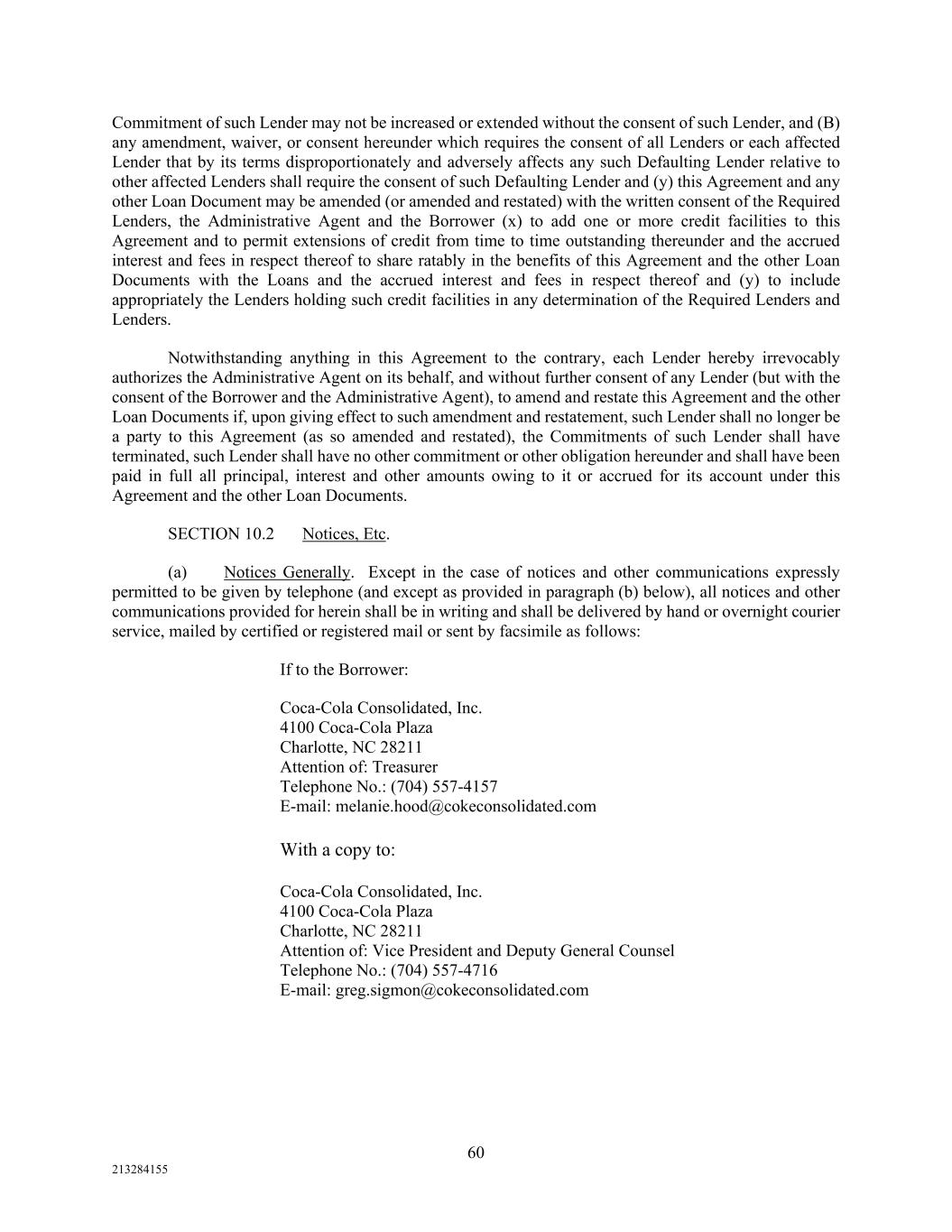 60 213284155 Commitment of such Lender may not be increased or extended without the consent of such Lender, and (B) any amendment, waiver, or consent hereunder which requires the consent of all Lenders or each affected Lender that by its terms disproportionately and adversely affects any such Defaulting Lender relative to other affected Lenders shall require the consent of such Defaulting Lender and (y) this Agreement and any other Loan Document may be amended (or amended and restated) with the written consent of the Required Lenders, the Administrative Agent and the Borrower (x) to add one or more credit facilities to this Agreement and to permit extensions of credit from time to time outstanding thereunder and the accrued interest and fees in respect thereof to share ratably in the benefits of this Agreement and the other Loan Documents with the Loans and the accrued interest and fees in respect thereof and (y) to include appropriately the Lenders holding such credit facilities in any determination of the Required Lenders and Lenders. Notwithstanding anything in this Agreement to the contrary, each Lender hereby irrevocably authorizes the Administrative Agent on its behalf, and without further consent of any Lender (but with the consent of the Borrower and the Administrative Agent), to amend and restate this Agreement and the other Loan Documents if, upon giving effect to such amendment and restatement, such Lender shall no longer be a party to this Agreement (as so amended and restated), the Commitments of such Lender shall have terminated, such Lender shall have no other commitment or other obligation hereunder and shall have been paid in full all principal, interest and other amounts owing to it or accrued for its account under this Agreement and the other Loan Documents. SECTION 10.2 Notices, Etc. (a) Notices Generally. Except in the case of notices and other communications expressly permitted to be given by telephone (and except as provided in paragraph (b) below), all notices and other communications provided for herein shall be in writing and shall be delivered by hand or overnight courier service, mailed by certified or registered mail or sent by facsimile as follows: If to the Borrower: Coca-Cola Consolidated, Inc. 4100 Coca-Cola Plaza Charlotte, NC 28211 Attention of: Treasurer Telephone No.: (704) 557-4157 E-mail: melanie.hood@cokeconsolidated.com With a copy to: Coca-Cola Consolidated, Inc. 4100 Coca-Cola Plaza Charlotte, NC 28211 Attention of: Vice President and Deputy General Counsel Telephone No.: (704) 557-4716 E-mail: greg.sigmon@cokeconsolidated.com