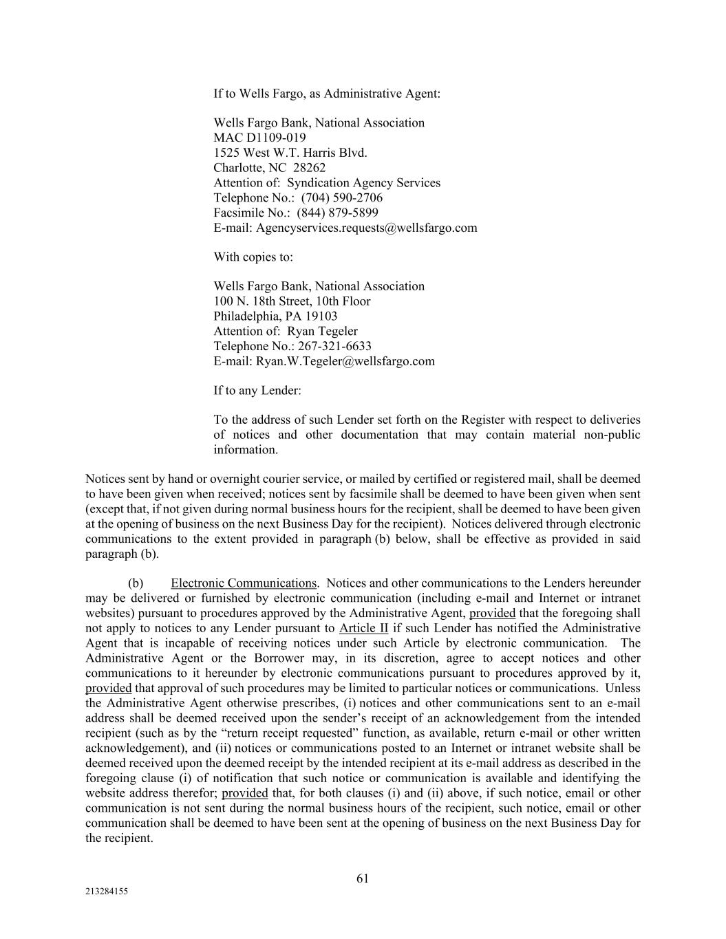 61 213284155 If to Wells Fargo, as Administrative Agent: Wells Fargo Bank, National Association MAC D1109-019 1525 West W.T. Harris Blvd. Charlotte, NC 28262 Attention of: Syndication Agency Services Telephone No.: (704) 590-2706 Facsimile No.: (844) 879-5899 E-mail: Agencyservices.requests@wellsfargo.com With copies to: Wells Fargo Bank, National Association 100 N. 18th Street, 10th Floor Philadelphia, PA 19103 Attention of: Ryan Tegeler Telephone No.: 267-321-6633 E-mail: Ryan.W.Tegeler@wellsfargo.com If to any Lender: To the address of such Lender set forth on the Register with respect to deliveries of notices and other documentation that may contain material non-public information. Notices sent by hand or overnight courier service, or mailed by certified or registered mail, shall be deemed to have been given when received; notices sent by facsimile shall be deemed to have been given when sent (except that, if not given during normal business hours for the recipient, shall be deemed to have been given at the opening of business on the next Business Day for the recipient). Notices delivered through electronic communications to the extent provided in paragraph (b) below, shall be effective as provided in said paragraph (b). (b) Electronic Communications. Notices and other communications to the Lenders hereunder may be delivered or furnished by electronic communication (including e-mail and Internet or intranet websites) pursuant to procedures approved by the Administrative Agent, provided that the foregoing shall not apply to notices to any Lender pursuant to Article II if such Lender has notified the Administrative Agent that is incapable of receiving notices under such Article by electronic communication. The Administrative Agent or the Borrower may, in its discretion, agree to accept notices and other communications to it hereunder by electronic communications pursuant to procedures approved by it, provided that approval of such procedures may be limited to particular notices or communications. Unless the Administrative Agent otherwise prescribes, (i) notices and other communications sent to an e-mail address shall be deemed received upon the sender’s receipt of an acknowledgement from the intended recipient (such as by the “return receipt requested” function, as available, return e-mail or other written acknowledgement), and (ii) notices or communications posted to an Internet or intranet website shall be deemed received upon the deemed receipt by the intended recipient at its e-mail address as described in the foregoing clause (i) of notification that such notice or communication is available and identifying the website address therefor; provided that, for both clauses (i) and (ii) above, if such notice, email or other communication is not sent during the normal business hours of the recipient, such notice, email or other communication shall be deemed to have been sent at the opening of business on the next Business Day for the recipient.