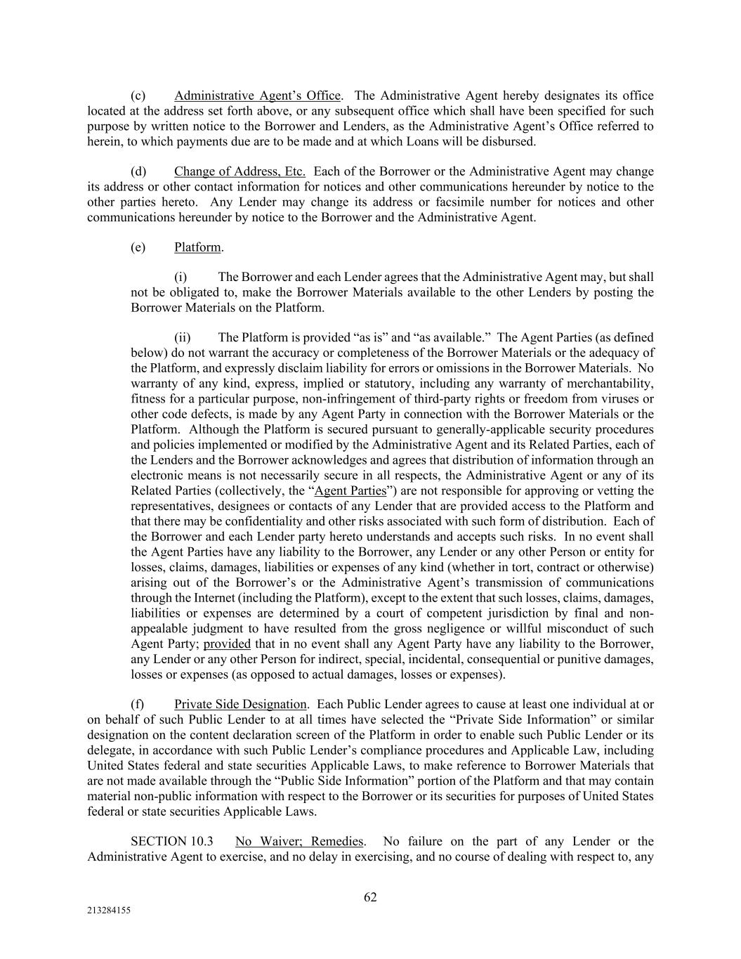 62 213284155 (c) Administrative Agent’s Office. The Administrative Agent hereby designates its office located at the address set forth above, or any subsequent office which shall have been specified for such purpose by written notice to the Borrower and Lenders, as the Administrative Agent’s Office referred to herein, to which payments due are to be made and at which Loans will be disbursed. (d) Change of Address, Etc. Each of the Borrower or the Administrative Agent may change its address or other contact information for notices and other communications hereunder by notice to the other parties hereto. Any Lender may change its address or facsimile number for notices and other communications hereunder by notice to the Borrower and the Administrative Agent. (e) Platform. (i) The Borrower and each Lender agrees that the Administrative Agent may, but shall not be obligated to, make the Borrower Materials available to the other Lenders by posting the Borrower Materials on the Platform. (ii) The Platform is provided “as is” and “as available.” The Agent Parties (as defined below) do not warrant the accuracy or completeness of the Borrower Materials or the adequacy of the Platform, and expressly disclaim liability for errors or omissions in the Borrower Materials. No warranty of any kind, express, implied or statutory, including any warranty of merchantability, fitness for a particular purpose, non-infringement of third-party rights or freedom from viruses or other code defects, is made by any Agent Party in connection with the Borrower Materials or the Platform. Although the Platform is secured pursuant to generally-applicable security procedures and policies implemented or modified by the Administrative Agent and its Related Parties, each of the Lenders and the Borrower acknowledges and agrees that distribution of information through an electronic means is not necessarily secure in all respects, the Administrative Agent or any of its Related Parties (collectively, the “Agent Parties”) are not responsible for approving or vetting the representatives, designees or contacts of any Lender that are provided access to the Platform and that there may be confidentiality and other risks associated with such form of distribution. Each of the Borrower and each Lender party hereto understands and accepts such risks. In no event shall the Agent Parties have any liability to the Borrower, any Lender or any other Person or entity for losses, claims, damages, liabilities or expenses of any kind (whether in tort, contract or otherwise) arising out of the Borrower’s or the Administrative Agent’s transmission of communications through the Internet (including the Platform), except to the extent that such losses, claims, damages, liabilities or expenses are determined by a court of competent jurisdiction by final and non- appealable judgment to have resulted from the gross negligence or willful misconduct of such Agent Party; provided that in no event shall any Agent Party have any liability to the Borrower, any Lender or any other Person for indirect, special, incidental, consequential or punitive damages, losses or expenses (as opposed to actual damages, losses or expenses). (f) Private Side Designation. Each Public Lender agrees to cause at least one individual at or on behalf of such Public Lender to at all times have selected the “Private Side Information” or similar designation on the content declaration screen of the Platform in order to enable such Public Lender or its delegate, in accordance with such Public Lender’s compliance procedures and Applicable Law, including United States federal and state securities Applicable Laws, to make reference to Borrower Materials that are not made available through the “Public Side Information” portion of the Platform and that may contain material non-public information with respect to the Borrower or its securities for purposes of United States federal or state securities Applicable Laws. SECTION 10.3 No Waiver; Remedies. No failure on the part of any Lender or the Administrative Agent to exercise, and no delay in exercising, and no course of dealing with respect to, any