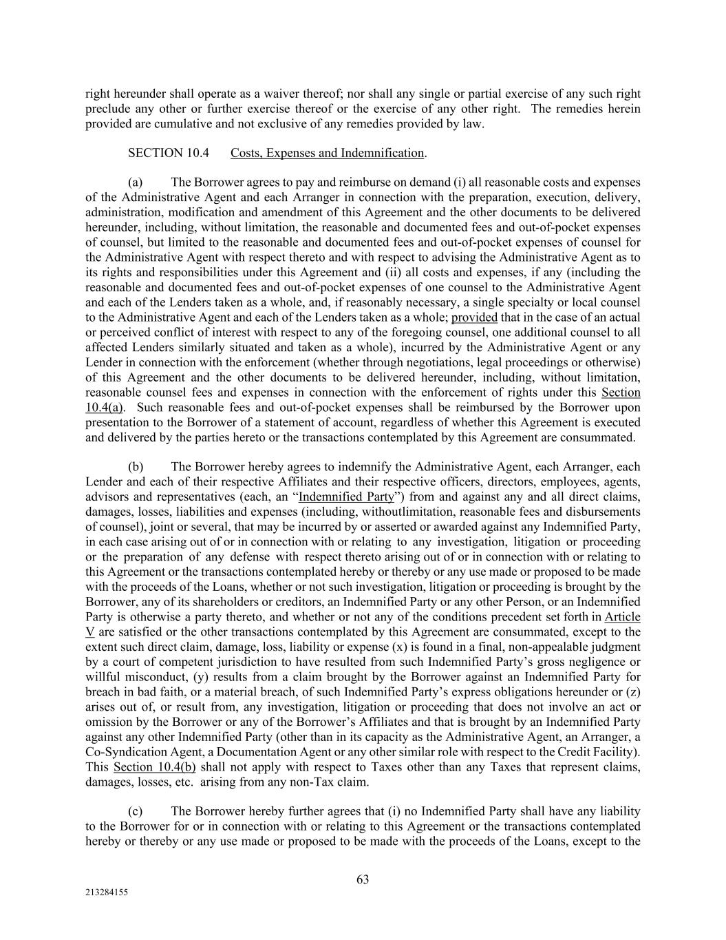 63 213284155 right hereunder shall operate as a waiver thereof; nor shall any single or partial exercise of any such right preclude any other or further exercise thereof or the exercise of any other right. The remedies herein provided are cumulative and not exclusive of any remedies provided by law. SECTION 10.4 Costs, Expenses and Indemnification. (a) The Borrower agrees to pay and reimburse on demand (i) all reasonable costs and expenses of the Administrative Agent and each Arranger in connection with the preparation, execution, delivery, administration, modification and amendment of this Agreement and the other documents to be delivered hereunder, including, without limitation, the reasonable and documented fees and out-of-pocket expenses of counsel, but limited to the reasonable and documented fees and out-of-pocket expenses of counsel for the Administrative Agent with respect thereto and with respect to advising the Administrative Agent as to its rights and responsibilities under this Agreement and (ii) all costs and expenses, if any (including the reasonable and documented fees and out-of-pocket expenses of one counsel to the Administrative Agent and each of the Lenders taken as a whole, and, if reasonably necessary, a single specialty or local counsel to the Administrative Agent and each of the Lenders taken as a whole; provided that in the case of an actual or perceived conflict of interest with respect to any of the foregoing counsel, one additional counsel to all affected Lenders similarly situated and taken as a whole), incurred by the Administrative Agent or any Lender in connection with the enforcement (whether through negotiations, legal proceedings or otherwise) of this Agreement and the other documents to be delivered hereunder, including, without limitation, reasonable counsel fees and expenses in connection with the enforcement of rights under this Section 10.4(a). Such reasonable fees and out-of-pocket expenses shall be reimbursed by the Borrower upon presentation to the Borrower of a statement of account, regardless of whether this Agreement is executed and delivered by the parties hereto or the transactions contemplated by this Agreement are consummated. (b) The Borrower hereby agrees to indemnify the Administrative Agent, each Arranger, each Lender and each of their respective Affiliates and their respective officers, directors, employees, agents, advisors and representatives (each, an “Indemnified Party”) from and against any and all direct claims, damages, losses, liabilities and expenses (including, without limitation, reasonable fees and disbursements of counsel), joint or several, that may be incurred by or asserted or awarded against any Indemnified Party, in each case arising out of or in connection with or relating to any investigation, litigation or proceeding or the preparation of any defense with respect thereto arising out of or in connection with or relating to this Agreement or the transactions contemplated hereby or thereby or any use made or proposed to be made with the proceeds of the Loans, whether or not such investigation, litigation or proceeding is brought by the Borrower, any of its shareholders or creditors, an Indemnified Party or any other Person, or an Indemnified Party is otherwise a party thereto, and whether or not any of the conditions precedent set forth in Article V are satisfied or the other transactions contemplated by this Agreement are consummated, except to the extent such direct claim, damage, loss, liability or expense (x) is found in a final, non-appealable judgment by a court of competent jurisdiction to have resulted from such Indemnified Party’s gross negligence or willful misconduct, (y) results from a claim brought by the Borrower against an Indemnified Party for breach in bad faith, or a material breach, of such Indemnified Party’s express obligations hereunder or (z) arises out of, or result from, any investigation, litigation or proceeding that does not involve an act or omission by the Borrower or any of the Borrower’s Affiliates and that is brought by an Indemnified Party against any other Indemnified Party (other than in its capacity as the Administrative Agent, an Arranger, a Co-Syndication Agent, a Documentation Agent or any other similar role with respect to the Credit Facility). This Section 10.4(b) shall not apply with respect to Taxes other than any Taxes that represent claims, damages, losses, etc. arising from any non-Tax claim. (c) The Borrower hereby further agrees that (i) no Indemnified Party shall have any liability to the Borrower for or in connection with or relating to this Agreement or the transactions contemplated hereby or thereby or any use made or proposed to be made with the proceeds of the Loans, except to the