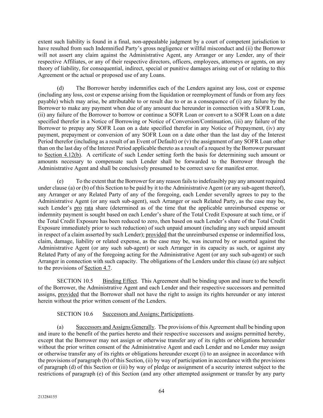 64 213284155 extent such liability is found in a final, non-appealable judgment by a court of competent jurisdiction to have resulted from such Indemnified Party’s gross negligence or willful misconduct and (ii) the Borrower will not assert any claim against the Administrative Agent, any Arranger or any Lender, any of their respective Affiliates, or any of their respective directors, officers, employees, attorneys or agents, on any theory of liability, for consequential, indirect, special or punitive damages arising out of or relating to this Agreement or the actual or proposed use of any Loans. (d) The Borrower hereby indemnifies each of the Lenders against any loss, cost or expense (including any loss, cost or expense arising from the liquidation or reemployment of funds or from any fees payable) which may arise, be attributable to or result due to or as a consequence of (i) any failure by the Borrower to make any payment when due of any amount due hereunder in connection with a SOFR Loan, (ii) any failure of the Borrower to borrow or continue a SOFR Loan or convert to a SOFR Loan on a date specified therefor in a Notice of Borrowing or Notice of Conversion/Continuation, (iii) any failure of the Borrower to prepay any SOFR Loan on a date specified therefor in any Notice of Prepayment, (iv) any payment, prepayment or conversion of any SOFR Loan on a date other than the last day of the Interest Period therefor (including as a result of an Event of Default) or (v) the assignment of any SOFR Loan other than on the last day of the Interest Period applicable thereto as a result of a request by the Borrower pursuant to Section 4.12(b). A certificate of such Lender setting forth the basis for determining such amount or amounts necessary to compensate such Lender shall be forwarded to the Borrower through the Administrative Agent and shall be conclusively presumed to be correct save for manifest error. (e) To the extent that the Borrower for any reason fails to indefeasibly pay any amount required under clause (a) or (b) of this Section to be paid by it to the Administrative Agent (or any sub-agent thereof), any Arranger or any Related Party of any of the foregoing, each Lender severally agrees to pay to the Administrative Agent (or any such sub-agent), such Arranger or such Related Party, as the case may be, such Lender’s pro rata share (determined as of the time that the applicable unreimbursed expense or indemnity payment is sought based on each Lender’s share of the Total Credit Exposure at such time, or if the Total Credit Exposure has been reduced to zero, then based on such Lender’s share of the Total Credit Exposure immediately prior to such reduction) of such unpaid amount (including any such unpaid amount in respect of a claim asserted by such Lender); provided that the unreimbursed expense or indemnified loss, claim, damage, liability or related expense, as the case may be, was incurred by or asserted against the Administrative Agent (or any such sub-agent) or such Arranger in its capacity as such, or against any Related Party of any of the foregoing acting for the Administrative Agent (or any such sub-agent) or such Arranger in connection with such capacity. The obligations of the Lenders under this clause (e) are subject to the provisions of Section 4.7. SECTION 10.5 Binding Effect. This Agreement shall be binding upon and inure to the benefit of the Borrower, the Administrative Agent and each Lender and their respective successors and permitted assigns, provided that the Borrower shall not have the right to assign its rights hereunder or any interest herein without the prior written consent of the Lenders. SECTION 10.6 Successors and Assigns; Participations. (a) Successors and Assigns Generally. The provisions of this Agreement shall be binding upon and inure to the benefit of the parties hereto and their respective successors and assigns permitted hereby, except that the Borrower may not assign or otherwise transfer any of its rights or obligations hereunder without the prior written consent of the Administrative Agent and each Lender and no Lender may assign or otherwise transfer any of its rights or obligations hereunder except (i) to an assignee in accordance with the provisions of paragraph (b) of this Section, (ii) by way of participation in accordance with the provisions of paragraph (d) of this Section or (iii) by way of pledge or assignment of a security interest subject to the restrictions of paragraph (e) of this Section (and any other attempted assignment or transfer by any party
