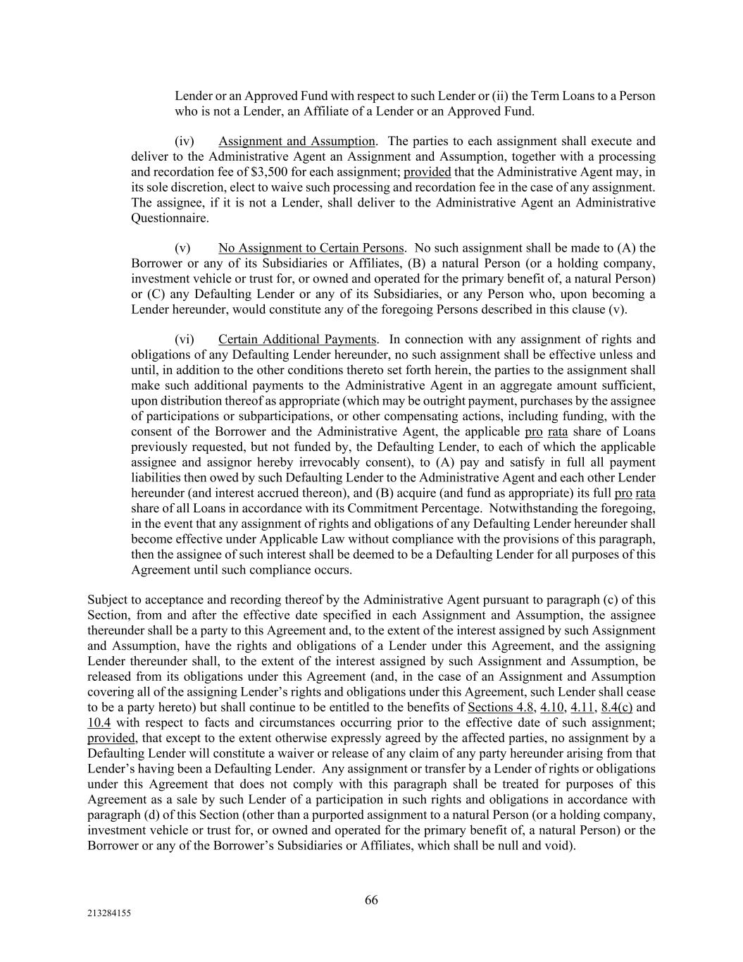 66 213284155 Lender or an Approved Fund with respect to such Lender or (ii) the Term Loans to a Person who is not a Lender, an Affiliate of a Lender or an Approved Fund. (iv) Assignment and Assumption. The parties to each assignment shall execute and deliver to the Administrative Agent an Assignment and Assumption, together with a processing and recordation fee of $3,500 for each assignment; provided that the Administrative Agent may, in its sole discretion, elect to waive such processing and recordation fee in the case of any assignment. The assignee, if it is not a Lender, shall deliver to the Administrative Agent an Administrative Questionnaire. (v) No Assignment to Certain Persons. No such assignment shall be made to (A) the Borrower or any of its Subsidiaries or Affiliates, (B) a natural Person (or a holding company, investment vehicle or trust for, or owned and operated for the primary benefit of, a natural Person) or (C) any Defaulting Lender or any of its Subsidiaries, or any Person who, upon becoming a Lender hereunder, would constitute any of the foregoing Persons described in this clause (v). (vi) Certain Additional Payments. In connection with any assignment of rights and obligations of any Defaulting Lender hereunder, no such assignment shall be effective unless and until, in addition to the other conditions thereto set forth herein, the parties to the assignment shall make such additional payments to the Administrative Agent in an aggregate amount sufficient, upon distribution thereof as appropriate (which may be outright payment, purchases by the assignee of participations or subparticipations, or other compensating actions, including funding, with the consent of the Borrower and the Administrative Agent, the applicable pro rata share of Loans previously requested, but not funded by, the Defaulting Lender, to each of which the applicable assignee and assignor hereby irrevocably consent), to (A) pay and satisfy in full all payment liabilities then owed by such Defaulting Lender to the Administrative Agent and each other Lender hereunder (and interest accrued thereon), and (B) acquire (and fund as appropriate) its full pro rata share of all Loans in accordance with its Commitment Percentage. Notwithstanding the foregoing, in the event that any assignment of rights and obligations of any Defaulting Lender hereunder shall become effective under Applicable Law without compliance with the provisions of this paragraph, then the assignee of such interest shall be deemed to be a Defaulting Lender for all purposes of this Agreement until such compliance occurs. Subject to acceptance and recording thereof by the Administrative Agent pursuant to paragraph (c) of this Section, from and after the effective date specified in each Assignment and Assumption, the assignee thereunder shall be a party to this Agreement and, to the extent of the interest assigned by such Assignment and Assumption, have the rights and obligations of a Lender under this Agreement, and the assigning Lender thereunder shall, to the extent of the interest assigned by such Assignment and Assumption, be released from its obligations under this Agreement (and, in the case of an Assignment and Assumption covering all of the assigning Lender’s rights and obligations under this Agreement, such Lender shall cease to be a party hereto) but shall continue to be entitled to the benefits of Sections 4.8, 4.10, 4.11, 8.4(c) and 10.4 with respect to facts and circumstances occurring prior to the effective date of such assignment; provided, that except to the extent otherwise expressly agreed by the affected parties, no assignment by a Defaulting Lender will constitute a waiver or release of any claim of any party hereunder arising from that Lender’s having been a Defaulting Lender. Any assignment or transfer by a Lender of rights or obligations under this Agreement that does not comply with this paragraph shall be treated for purposes of this Agreement as a sale by such Lender of a participation in such rights and obligations in accordance with paragraph (d) of this Section (other than a purported assignment to a natural Person (or a holding company, investment vehicle or trust for, or owned and operated for the primary benefit of, a natural Person) or the Borrower or any of the Borrower’s Subsidiaries or Affiliates, which shall be null and void).