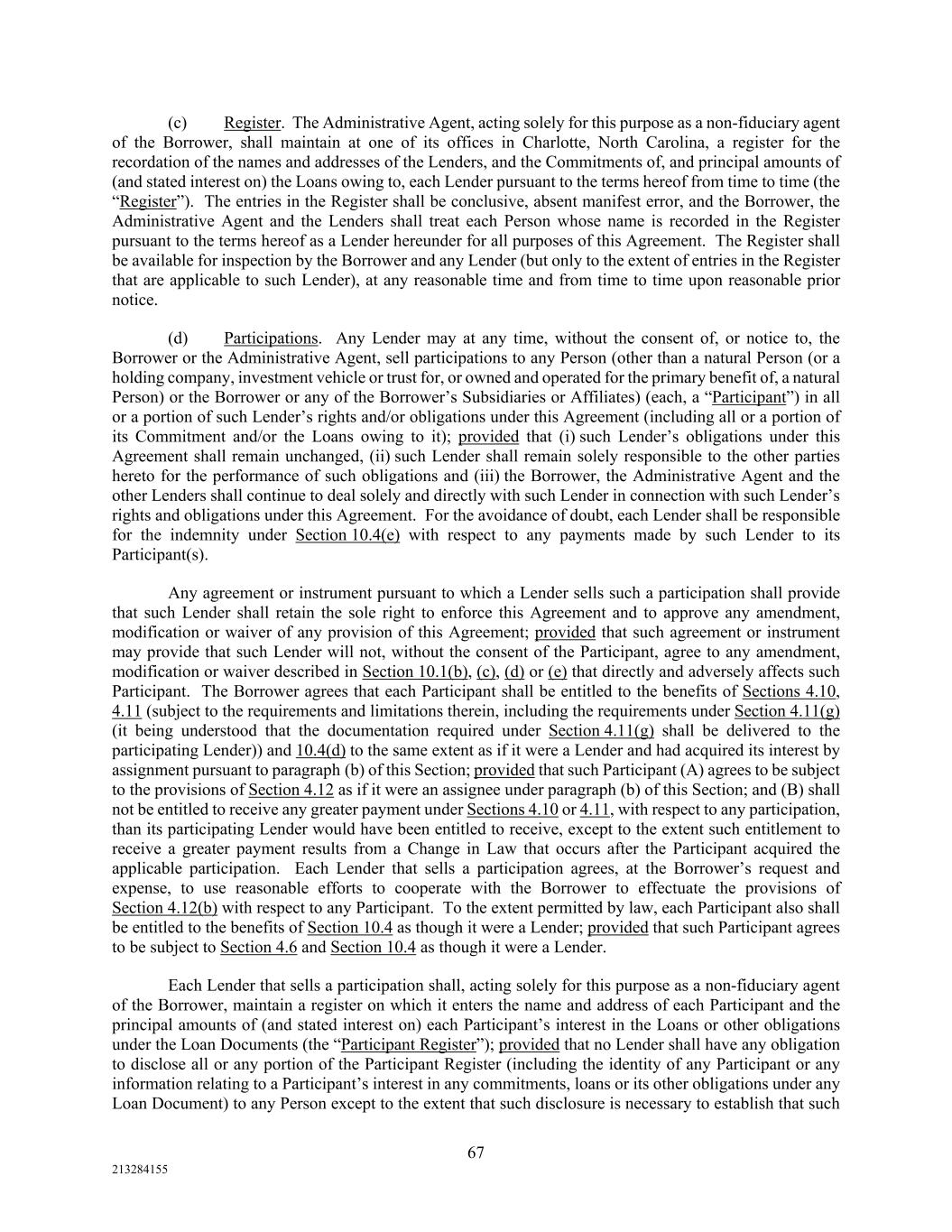 67 213284155 (c) Register. The Administrative Agent, acting solely for this purpose as a non-fiduciary agent of the Borrower, shall maintain at one of its offices in Charlotte, North Carolina, a register for the recordation of the names and addresses of the Lenders, and the Commitments of, and principal amounts of (and stated interest on) the Loans owing to, each Lender pursuant to the terms hereof from time to time (the “Register”). The entries in the Register shall be conclusive, absent manifest error, and the Borrower, the Administrative Agent and the Lenders shall treat each Person whose name is recorded in the Register pursuant to the terms hereof as a Lender hereunder for all purposes of this Agreement. The Register shall be available for inspection by the Borrower and any Lender (but only to the extent of entries in the Register that are applicable to such Lender), at any reasonable time and from time to time upon reasonable prior notice. (d) Participations. Any Lender may at any time, without the consent of, or notice to, the Borrower or the Administrative Agent, sell participations to any Person (other than a natural Person (or a holding company, investment vehicle or trust for, or owned and operated for the primary benefit of, a natural Person) or the Borrower or any of the Borrower’s Subsidiaries or Affiliates) (each, a “Participant”) in all or a portion of such Lender’s rights and/or obligations under this Agreement (including all or a portion of its Commitment and/or the Loans owing to it); provided that (i) such Lender’s obligations under this Agreement shall remain unchanged, (ii) such Lender shall remain solely responsible to the other parties hereto for the performance of such obligations and (iii) the Borrower, the Administrative Agent and the other Lenders shall continue to deal solely and directly with such Lender in connection with such Lender’s rights and obligations under this Agreement. For the avoidance of doubt, each Lender shall be responsible for the indemnity under Section 10.4(e) with respect to any payments made by such Lender to its Participant(s). Any agreement or instrument pursuant to which a Lender sells such a participation shall provide that such Lender shall retain the sole right to enforce this Agreement and to approve any amendment, modification or waiver of any provision of this Agreement; provided that such agreement or instrument may provide that such Lender will not, without the consent of the Participant, agree to any amendment, modification or waiver described in Section 10.1(b), (c), (d) or (e) that directly and adversely affects such Participant. The Borrower agrees that each Participant shall be entitled to the benefits of Sections 4.10, 4.11 (subject to the requirements and limitations therein, including the requirements under Section 4.11(g) (it being understood that the documentation required under Section 4.11(g) shall be delivered to the participating Lender)) and 10.4(d) to the same extent as if it were a Lender and had acquired its interest by assignment pursuant to paragraph (b) of this Section; provided that such Participant (A) agrees to be subject to the provisions of Section 4.12 as if it were an assignee under paragraph (b) of this Section; and (B) shall not be entitled to receive any greater payment under Sections 4.10 or 4.11, with respect to any participation, than its participating Lender would have been entitled to receive, except to the extent such entitlement to receive a greater payment results from a Change in Law that occurs after the Participant acquired the applicable participation. Each Lender that sells a participation agrees, at the Borrower’s request and expense, to use reasonable efforts to cooperate with the Borrower to effectuate the provisions of Section 4.12(b) with respect to any Participant. To the extent permitted by law, each Participant also shall be entitled to the benefits of Section 10.4 as though it were a Lender; provided that such Participant agrees to be subject to Section 4.6 and Section 10.4 as though it were a Lender. Each Lender that sells a participation shall, acting solely for this purpose as a non-fiduciary agent of the Borrower, maintain a register on which it enters the name and address of each Participant and the principal amounts of (and stated interest on) each Participant’s interest in the Loans or other obligations under the Loan Documents (the “Participant Register”); provided that no Lender shall have any obligation to disclose all or any portion of the Participant Register (including the identity of any Participant or any information relating to a Participant’s interest in any commitments, loans or its other obligations under any Loan Document) to any Person except to the extent that such disclosure is necessary to establish that such