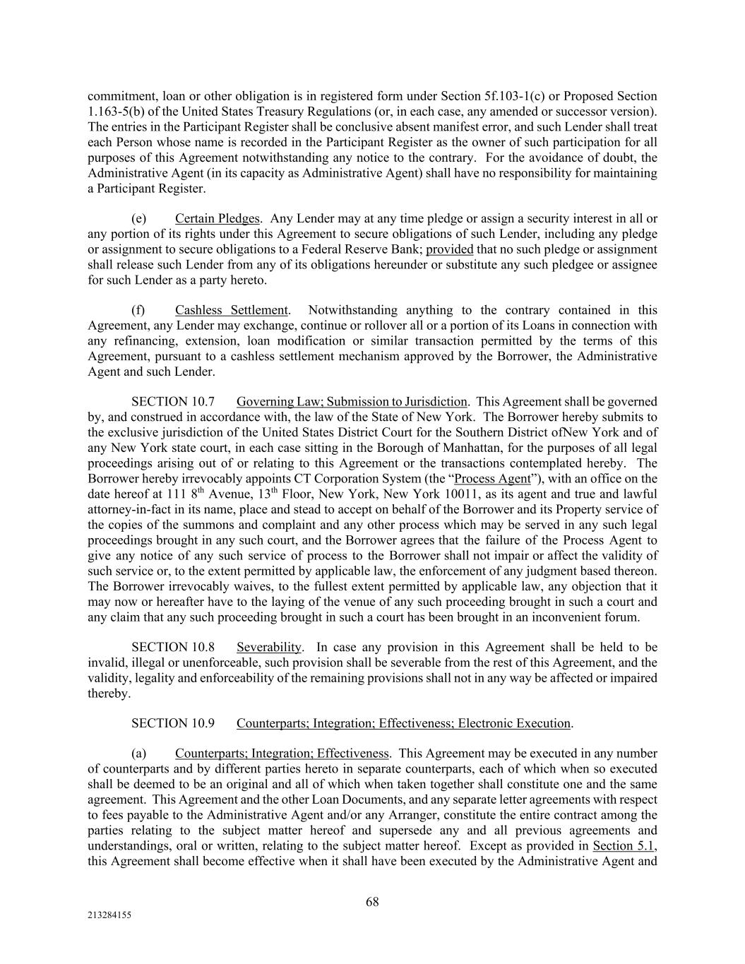 68 213284155 commitment, loan or other obligation is in registered form under Section 5f.103-1(c) or Proposed Section 1.163-5(b) of the United States Treasury Regulations (or, in each case, any amended or successor version). The entries in the Participant Register shall be conclusive absent manifest error, and such Lender shall treat each Person whose name is recorded in the Participant Register as the owner of such participation for all purposes of this Agreement notwithstanding any notice to the contrary. For the avoidance of doubt, the Administrative Agent (in its capacity as Administrative Agent) shall have no responsibility for maintaining a Participant Register. (e) Certain Pledges. Any Lender may at any time pledge or assign a security interest in all or any portion of its rights under this Agreement to secure obligations of such Lender, including any pledge or assignment to secure obligations to a Federal Reserve Bank; provided that no such pledge or assignment shall release such Lender from any of its obligations hereunder or substitute any such pledgee or assignee for such Lender as a party hereto. (f) Cashless Settlement. Notwithstanding anything to the contrary contained in this Agreement, any Lender may exchange, continue or rollover all or a portion of its Loans in connection with any refinancing, extension, loan modification or similar transaction permitted by the terms of this Agreement, pursuant to a cashless settlement mechanism approved by the Borrower, the Administrative Agent and such Lender. SECTION 10.7 Governing Law; Submission to Jurisdiction. This Agreement shall be governed by, and construed in accordance with, the law of the State of New York. The Borrower hereby submits to the exclusive jurisdiction of the United States District Court for the Southern District of New York and of any New York state court, in each case sitting in the Borough of Manhattan, for the purposes of all legal proceedings arising out of or relating to this Agreement or the transactions contemplated hereby. The Borrower hereby irrevocably appoints CT Corporation System (the “Process Agent”), with an office on the date hereof at 111 8th Avenue, 13th Floor, New York, New York 10011, as its agent and true and lawful attorney-in-fact in its name, place and stead to accept on behalf of the Borrower and its Property service of the copies of the summons and complaint and any other process which may be served in any such legal proceedings brought in any such court, and the Borrower agrees that the failure of the Process Agent to give any notice of any such service of process to the Borrower shall not impair or affect the validity of such service or, to the extent permitted by applicable law, the enforcement of any judgment based thereon. The Borrower irrevocably waives, to the fullest extent permitted by applicable law, any objection that it may now or hereafter have to the laying of the venue of any such proceeding brought in such a court and any claim that any such proceeding brought in such a court has been brought in an inconvenient forum. SECTION 10.8 Severability. In case any provision in this Agreement shall be held to be invalid, illegal or unenforceable, such provision shall be severable from the rest of this Agreement, and the validity, legality and enforceability of the remaining provisions shall not in any way be affected or impaired thereby. SECTION 10.9 Counterparts; Integration; Effectiveness; Electronic Execution. (a) Counterparts; Integration; Effectiveness. This Agreement may be executed in any number of counterparts and by different parties hereto in separate counterparts, each of which when so executed shall be deemed to be an original and all of which when taken together shall constitute one and the same agreement. This Agreement and the other Loan Documents, and any separate letter agreements with respect to fees payable to the Administrative Agent and/or any Arranger, constitute the entire contract among the parties relating to the subject matter hereof and supersede any and all previous agreements and understandings, oral or written, relating to the subject matter hereof. Except as provided in Section 5.1, this Agreement shall become effective when it shall have been executed by the Administrative Agent and
