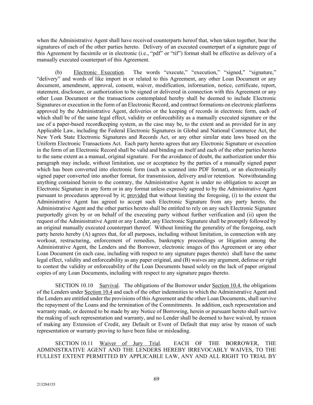 69 213284155 when the Administrative Agent shall have received counterparts hereof that, when taken together, bear the signatures of each of the other parties hereto. Delivery of an executed counterpart of a signature page of this Agreement by facsimile or in electronic (i.e., “pdf” or “tif”) format shall be effective as delivery of a manually executed counterpart of this Agreement. (b) Electronic Execution. The words “execute,” “execution,” “signed,” “signature,” “delivery” and words of like import in or related to this Agreement, any other Loan Document or any document, amendment, approval, consent, waiver, modification, information, notice, certificate, report, statement, disclosure, or authorization to be signed or delivered in connection with this Agreement or any other Loan Document or the transactions contemplated hereby shall be deemed to include Electronic Signatures or execution in the form of an Electronic Record, and contract formations on electronic platforms approved by the Administrative Agent, deliveries or the keeping of records in electronic form, each of which shall be of the same legal effect, validity or enforceability as a manually executed signature or the use of a paper-based recordkeeping system, as the case may be, to the extent and as provided for in any Applicable Law, including the Federal Electronic Signatures in Global and National Commerce Act, the New York State Electronic Signatures and Records Act, or any other similar state laws based on the Uniform Electronic Transactions Act. Each party hereto agrees that any Electronic Signature or execution in the form of an Electronic Record shall be valid and binding on itself and each of the other parties hereto to the same extent as a manual, original signature. For the avoidance of doubt, the authorization under this paragraph may include, without limitation, use or acceptance by the parties of a manually signed paper which has been converted into electronic form (such as scanned into PDF format), or an electronically signed paper converted into another format, for transmission, delivery and/or retention. Notwithstanding anything contained herein to the contrary, the Administrative Agent is under no obligation to accept an Electronic Signature in any form or in any format unless expressly agreed to by the Administrative Agent pursuant to procedures approved by it; provided that without limiting the foregoing, (i) to the extent the Administrative Agent has agreed to accept such Electronic Signature from any party hereto, the Administrative Agent and the other parties hereto shall be entitled to rely on any such Electronic Signature purportedly given by or on behalf of the executing party without further verification and (ii) upon the request of the Administrative Agent or any Lender, any Electronic Signature shall be promptly followed by an original manually executed counterpart thereof. Without limiting the generality of the foregoing, each party hereto hereby (A) agrees that, for all purposes, including without limitation, in connection with any workout, restructuring, enforcement of remedies, bankruptcy proceedings or litigation among the Administrative Agent, the Lenders and the Borrower, electronic images of this Agreement or any other Loan Document (in each case, including with respect to any signature pages thereto) shall have the same legal effect, validity and enforceability as any paper original, and (B) waives any argument, defense or right to contest the validity or enforceability of the Loan Documents based solely on the lack of paper original copies of any Loan Documents, including with respect to any signature pages thereto. SECTION 10.10 Survival. The obligations of the Borrower under Section 10.4, the obligations of the Lenders under Section 10.4 and each of the other indemnities to which the Administrative Agent and the Lenders are entitled under the provisions of this Agreement and the other Loan Documents, shall survive the repayment of the Loans and the termination of the Commitments. In addition, each representation and warranty made, or deemed to be made by any Notice of Borrowing, herein or pursuant hereto shall survive the making of such representation and warranty, and no Lender shall be deemed to have waived, by reason of making any Extension of Credit, any Default or Event of Default that may arise by reason of such representation or warranty proving to have been false or misleading. SECTION 10.11 Waiver of Jury Trial. EACH OF THE BORROWER, THE ADMINISTRATIVE AGENT AND THE LENDERS HEREBY IRREVOCABLY WAIVES, TO THE FULLEST EXTENT PERMITTED BY APPLICABLE LAW, ANY AND ALL RIGHT TO TRIAL BY