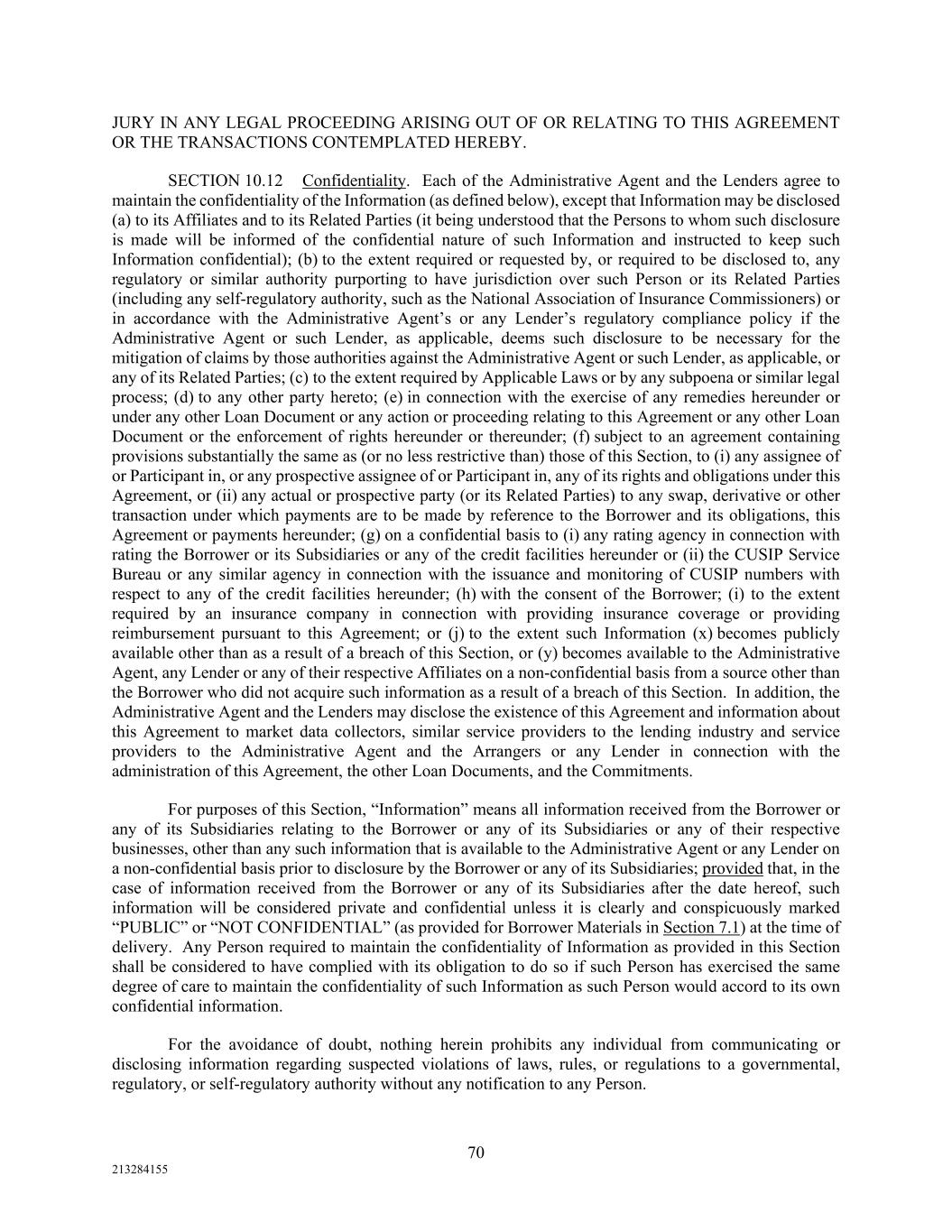 70 213284155 JURY IN ANY LEGAL PROCEEDING ARISING OUT OF OR RELATING TO THIS AGREEMENT OR THE TRANSACTIONS CONTEMPLATED HEREBY. SECTION 10.12 Confidentiality. Each of the Administrative Agent and the Lenders agree to maintain the confidentiality of the Information (as defined below), except that Information may be disclosed (a) to its Affiliates and to its Related Parties (it being understood that the Persons to whom such disclosure is made will be informed of the confidential nature of such Information and instructed to keep such Information confidential); (b) to the extent required or requested by, or required to be disclosed to, any regulatory or similar authority purporting to have jurisdiction over such Person or its Related Parties (including any self-regulatory authority, such as the National Association of Insurance Commissioners) or in accordance with the Administrative Agent’s or any Lender’s regulatory compliance policy if the Administrative Agent or such Lender, as applicable, deems such disclosure to be necessary for the mitigation of claims by those authorities against the Administrative Agent or such Lender, as applicable, or any of its Related Parties; (c) to the extent required by Applicable Laws or by any subpoena or similar legal process; (d) to any other party hereto; (e) in connection with the exercise of any remedies hereunder or under any other Loan Document or any action or proceeding relating to this Agreement or any other Loan Document or the enforcement of rights hereunder or thereunder; (f) subject to an agreement containing provisions substantially the same as (or no less restrictive than) those of this Section, to (i) any assignee of or Participant in, or any prospective assignee of or Participant in, any of its rights and obligations under this Agreement, or (ii) any actual or prospective party (or its Related Parties) to any swap, derivative or other transaction under which payments are to be made by reference to the Borrower and its obligations, this Agreement or payments hereunder; (g) on a confidential basis to (i) any rating agency in connection with rating the Borrower or its Subsidiaries or any of the credit facilities hereunder or (ii) the CUSIP Service Bureau or any similar agency in connection with the issuance and monitoring of CUSIP numbers with respect to any of the credit facilities hereunder; (h) with the consent of the Borrower; (i) to the extent required by an insurance company in connection with providing insurance coverage or providing reimbursement pursuant to this Agreement; or (j) to the extent such Information (x) becomes publicly available other than as a result of a breach of this Section, or (y) becomes available to the Administrative Agent, any Lender or any of their respective Affiliates on a non-confidential basis from a source other than the Borrower who did not acquire such information as a result of a breach of this Section. In addition, the Administrative Agent and the Lenders may disclose the existence of this Agreement and information about this Agreement to market data collectors, similar service providers to the lending industry and service providers to the Administrative Agent and the Arrangers or any Lender in connection with the administration of this Agreement, the other Loan Documents, and the Commitments. For purposes of this Section, “Information” means all information received from the Borrower or any of its Subsidiaries relating to the Borrower or any of its Subsidiaries or any of their respective businesses, other than any such information that is available to the Administrative Agent or any Lender on a non-confidential basis prior to disclosure by the Borrower or any of its Subsidiaries; provided that, in the case of information received from the Borrower or any of its Subsidiaries after the date hereof, such information will be considered private and confidential unless it is clearly and conspicuously marked “PUBLIC” or “NOT CONFIDENTIAL” (as provided for Borrower Materials in Section 7.1) at the time of delivery. Any Person required to maintain the confidentiality of Information as provided in this Section shall be considered to have complied with its obligation to do so if such Person has exercised the same degree of care to maintain the confidentiality of such Information as such Person would accord to its own confidential information. For the avoidance of doubt, nothing herein prohibits any individual from communicating or disclosing information regarding suspected violations of laws, rules, or regulations to a governmental, regulatory, or self-regulatory authority without any notification to any Person.