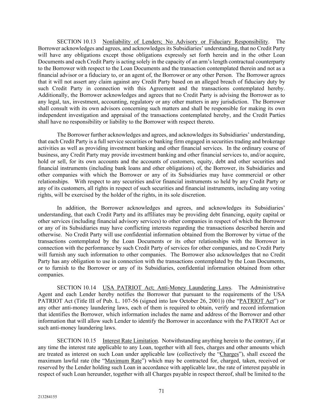 71 213284155 SECTION 10.13 Nonliability of Lenders; No Advisory or Fiduciary Responsibility. The Borrower acknowledges and agrees, and acknowledges its Subsidiaries’ understanding, that no Credit Party will have any obligations except those obligations expressly set forth herein and in the other Loan Documents and each Credit Party is acting solely in the capacity of an arm’s length contractual counterparty to the Borrower with respect to the Loan Documents and the transaction contemplated therein and not as a financial advisor or a fiduciary to, or an agent of, the Borrower or any other Person. The Borrower agrees that it will not assert any claim against any Credit Party based on an alleged breach of fiduciary duty by such Credit Party in connection with this Agreement and the transactions contemplated hereby. Additionally, the Borrower acknowledges and agrees that no Credit Party is advising the Borrower as to any legal, tax, investment, accounting, regulatory or any other matters in any jurisdiction. The Borrower shall consult with its own advisors concerning such matters and shall be responsible for making its own independent investigation and appraisal of the transactions contemplated hereby, and the Credit Parties shall have no responsibility or liability to the Borrower with respect thereto. The Borrower further acknowledges and agrees, and acknowledges its Subsidiaries’ understanding, that each Credit Party is a full service securities or banking firm engaged in securities trading and brokerage activities as well as providing investment banking and other financial services. In the ordinary course of business, any Credit Party may provide investment banking and other financial services to, and/or acquire, hold or sell, for its own accounts and the accounts of customers, equity, debt and other securities and financial instruments (including bank loans and other obligations) of, the Borrower, its Subsidiaries and other companies with which the Borrower or any of its Subsidiaries may have commercial or other relationships. With respect to any securities and/or financial instruments so held by any Credit Party or any of its customers, all rights in respect of such securities and financial instruments, including any voting rights, will be exercised by the holder of the rights, in its sole discretion. In addition, the Borrower acknowledges and agrees, and acknowledges its Subsidiaries’ understanding, that each Credit Party and its affiliates may be providing debt financing, equity capital or other services (including financial advisory services) to other companies in respect of which the Borrower or any of its Subsidiaries may have conflicting interests regarding the transactions described herein and otherwise. No Credit Party will use confidential information obtained from the Borrower by virtue of the transactions contemplated by the Loan Documents or its other relationships with the Borrower in connection with the performance by such Credit Party of services for other companies, and no Credit Party will furnish any such information to other companies. The Borrower also acknowledges that no Credit Party has any obligation to use in connection with the transactions contemplated by the Loan Documents, or to furnish to the Borrower or any of its Subsidiaries, confidential information obtained from other companies. SECTION 10.14 USA PATRIOT Act; Anti-Money Laundering Laws. The Administrative Agent and each Lender hereby notifies the Borrower that pursuant to the requirements of the USA PATRIOT Act (Title III of Pub. L. 107-56 (signed into law October 26, 2001)) (the “PATRIOT Act”) or any other anti-money laundering laws, each of them is required to obtain, verify and record information that identifies the Borrower, which information includes the name and address of the Borrower and other information that will allow such Lender to identify the Borrower in accordance with the PATRIOT Act or such anti-money laundering laws. SECTION 10.15 Interest Rate Limitation. Notwithstanding anything herein to the contrary, if at any time the interest rate applicable to any Loan, together with all fees, charges and other amounts which are treated as interest on such Loan under applicable law (collectively the “Charges”), shall exceed the maximum lawful rate (the “Maximum Rate”) which may be contracted for, charged, taken, received or reserved by the Lender holding such Loan in accordance with applicable law, the rate of interest payable in respect of such Loan hereunder, together with all Charges payable in respect thereof, shall be limited to the
