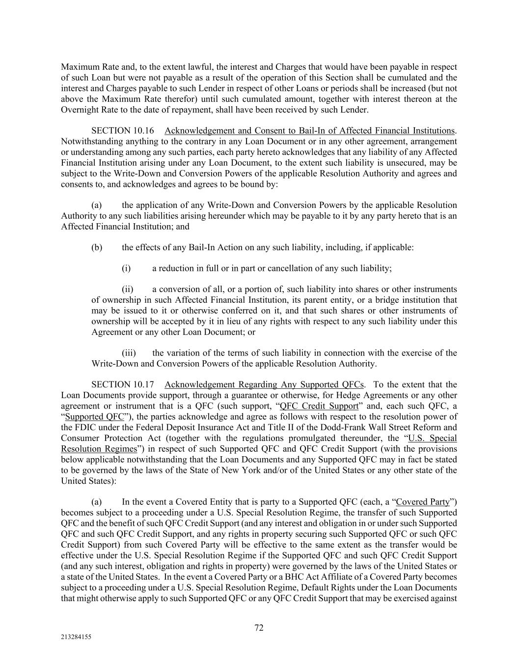 72 213284155 Maximum Rate and, to the extent lawful, the interest and Charges that would have been payable in respect of such Loan but were not payable as a result of the operation of this Section shall be cumulated and the interest and Charges payable to such Lender in respect of other Loans or periods shall be increased (but not above the Maximum Rate therefor) until such cumulated amount, together with interest thereon at the Overnight Rate to the date of repayment, shall have been received by such Lender. SECTION 10.16 Acknowledgement and Consent to Bail-In of Affected Financial Institutions. Notwithstanding anything to the contrary in any Loan Document or in any other agreement, arrangement or understanding among any such parties, each party hereto acknowledges that any liability of any Affected Financial Institution arising under any Loan Document, to the extent such liability is unsecured, may be subject to the Write-Down and Conversion Powers of the applicable Resolution Authority and agrees and consents to, and acknowledges and agrees to be bound by: (a) the application of any Write-Down and Conversion Powers by the applicable Resolution Authority to any such liabilities arising hereunder which may be payable to it by any party hereto that is an Affected Financial Institution; and (b) the effects of any Bail-In Action on any such liability, including, if applicable: (i) a reduction in full or in part or cancellation of any such liability; (ii) a conversion of all, or a portion of, such liability into shares or other instruments of ownership in such Affected Financial Institution, its parent entity, or a bridge institution that may be issued to it or otherwise conferred on it, and that such shares or other instruments of ownership will be accepted by it in lieu of any rights with respect to any such liability under this Agreement or any other Loan Document; or (iii) the variation of the terms of such liability in connection with the exercise of the Write-Down and Conversion Powers of the applicable Resolution Authority. SECTION 10.17 Acknowledgement Regarding Any Supported QFCs. To the extent that the Loan Documents provide support, through a guarantee or otherwise, for Hedge Agreements or any other agreement or instrument that is a QFC (such support, “QFC Credit Support” and, each such QFC, a “Supported QFC”), the parties acknowledge and agree as follows with respect to the resolution power of the FDIC under the Federal Deposit Insurance Act and Title II of the Dodd-Frank Wall Street Reform and Consumer Protection Act (together with the regulations promulgated thereunder, the “U.S. Special Resolution Regimes”) in respect of such Supported QFC and QFC Credit Support (with the provisions below applicable notwithstanding that the Loan Documents and any Supported QFC may in fact be stated to be governed by the laws of the State of New York and/or of the United States or any other state of the United States): (a) In the event a Covered Entity that is party to a Supported QFC (each, a “Covered Party”) becomes subject to a proceeding under a U.S. Special Resolution Regime, the transfer of such Supported QFC and the benefit of such QFC Credit Support (and any interest and obligation in or under such Supported QFC and such QFC Credit Support, and any rights in property securing such Supported QFC or such QFC Credit Support) from such Covered Party will be effective to the same extent as the transfer would be effective under the U.S. Special Resolution Regime if the Supported QFC and such QFC Credit Support (and any such interest, obligation and rights in property) were governed by the laws of the United States or a state of the United States. In the event a Covered Party or a BHC Act Affiliate of a Covered Party becomes subject to a proceeding under a U.S. Special Resolution Regime, Default Rights under the Loan Documents that might otherwise apply to such Supported QFC or any QFC Credit Support that may be exercised against