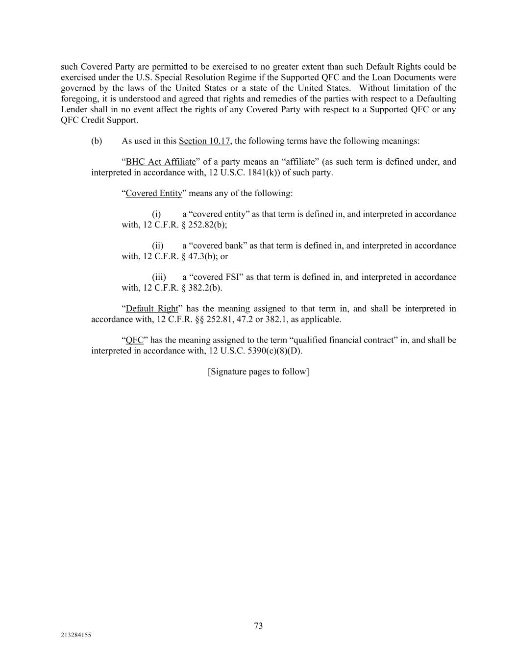 73 213284155 such Covered Party are permitted to be exercised to no greater extent than such Default Rights could be exercised under the U.S. Special Resolution Regime if the Supported QFC and the Loan Documents were governed by the laws of the United States or a state of the United States. Without limitation of the foregoing, it is understood and agreed that rights and remedies of the parties with respect to a Defaulting Lender shall in no event affect the rights of any Covered Party with respect to a Supported QFC or any QFC Credit Support. (b) As used in this Section 10.17, the following terms have the following meanings: “BHC Act Affiliate” of a party means an “affiliate” (as such term is defined under, and interpreted in accordance with, 12 U.S.C. 1841(k)) of such party. “Covered Entity” means any of the following: (i) a “covered entity” as that term is defined in, and interpreted in accordance with, 12 C.F.R. § 252.82(b); (ii) a “covered bank” as that term is defined in, and interpreted in accordance with, 12 C.F.R. § 47.3(b); or (iii) a “covered FSI” as that term is defined in, and interpreted in accordance with, 12 C.F.R. § 382.2(b). “Default Right” has the meaning assigned to that term in, and shall be interpreted in accordance with, 12 C.F.R. §§ 252.81, 47.2 or 382.1, as applicable. “QFC” has the meaning assigned to the term “qualified financial contract” in, and shall be interpreted in accordance with, 12 U.S.C. 5390(c)(8)(D). [Signature pages to follow]