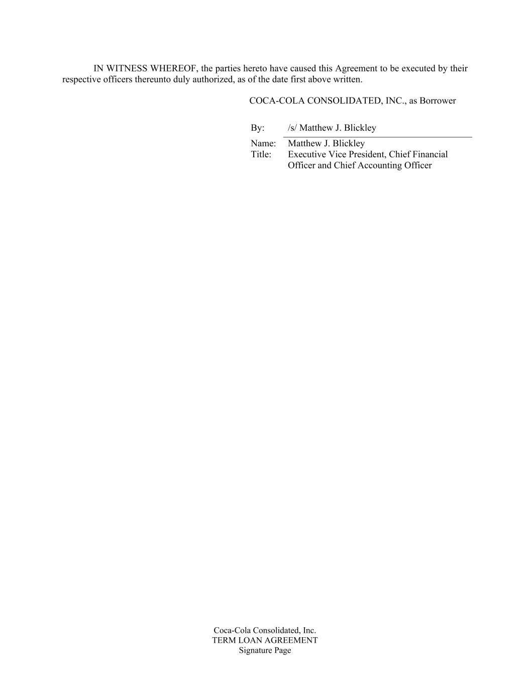 Coca-Cola Consolidated, Inc. TERM LOAN AGREEMENT Signature Page IN WITNESS WHEREOF, the parties hereto have caused this Agreement to be executed by their respective officers thereunto duly authorized, as of the date first above written. COCA-COLA CONSOLIDATED, INC., as Borrower By: /s/ Matthew J. Blickley Name: Matthew J. Blickley Title: Executive Vice President, Chief Financial Officer and Chief Accounting Officer