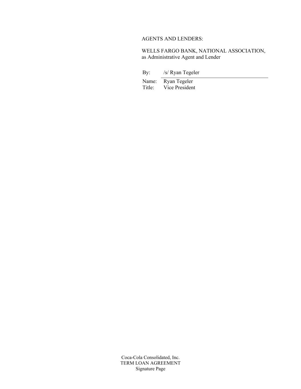 Coca-Cola Consolidated, Inc. TERM LOAN AGREEMENT Signature Page AGENTS AND LENDERS: WELLS FARGO BANK, NATIONAL ASSOCIATION, as Administrative Agent and Lender By: /s/ Ryan Tegeler Name: Ryan Tegeler Title: Vice President