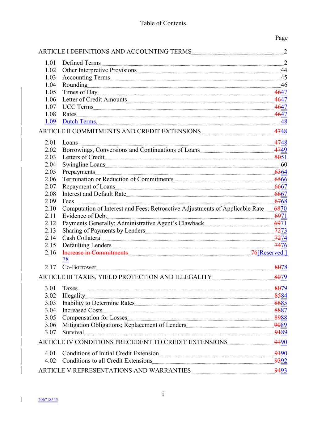 Table of Contents Page ARTICLE I DEFINITIONS AND ACCOUNTING TERMS 2 1.01 Defined Terms 2 1.02 Other Interpretive Provisions 44 1.03 Accounting Terms 45 1.04 Rounding 46 1.05 Times of Day 4647 1.06 Letter of Credit Amounts 4647 1.07 UCC Terms 4647 1.08 Rates 4647 1.09 Dutch Terms. 48 ARTICLE II COMMITMENTS AND CREDIT EXTENSIONS 4748 2.01 Loans 4748 2.02 Borrowings, Conversions and Continuations of Loans 4749 2.03 Letters of Credit 5051 2.04 Swingline Loans 60 2.05 Prepayments 6364 2.06 Termination or Reduction of Commitments 6566 2.07 Repayment of Loans 6667 2.08 Interest and Default Rate 6667 2.09 Fees 6768 2.10 Computation of Interest and Fees; Retroactive Adjustments of Applicable Rate 6870 2.11 Evidence of Debt 6971 2.12 Payments Generally; Administrative Agent’s Clawback 6971 2.13 Sharing of Payments by Lenders 7273 2.14 Cash Collateral 7274 2.15 Defaulting Lenders 7476 2.16 Increase in Commitments 76[Reserved.] 78 2.17 Co-Borrower 8078 ARTICLE III TAXES, YIELD PROTECTION AND ILLEGALITY 8079 3.01 Taxes 8079 3.02 Illegality 8584 3.03 Inability to Determine Rates 8685 3.04 Increased Costs 8887 3.05 Compensation for Losses 8988 3.06 Mitigation Obligations; Replacement of Lenders 9089 3.07 Survival 9189 ARTICLE IV CONDITIONS PRECEDENT TO CREDIT EXTENSIONS 9190 4.01 Conditions of Initial Credit Extension 9190 4.02 Conditions to all Credit Extensions 9392 ARTICLE V REPRESENTATIONS AND WARRANTIES 9493 i 206718545