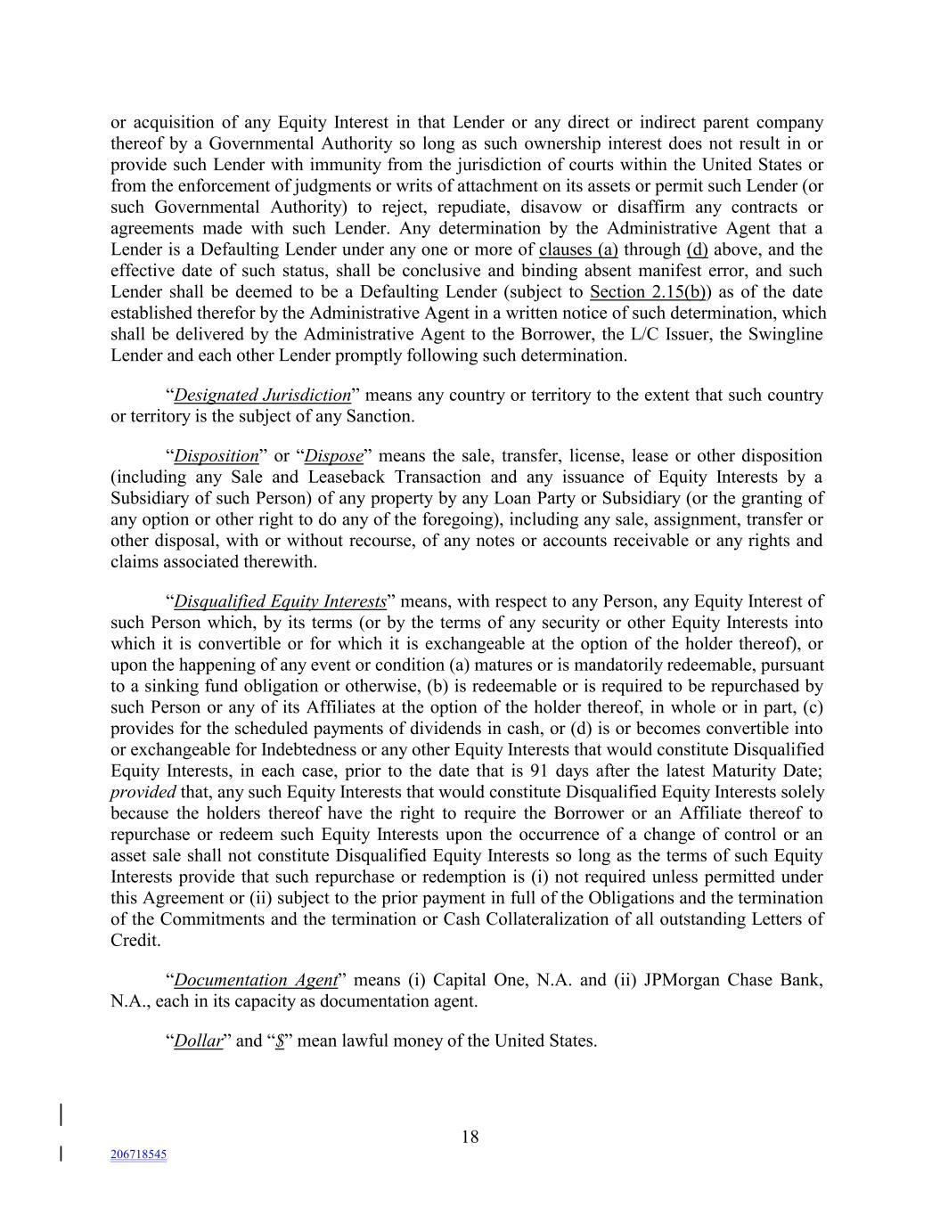 or acquisition of any Equity Interest in that Lender or any direct or indirect parent company thereof by a Governmental Authority so long as such ownership interest does not result in or provide such Lender with immunity from the jurisdiction of courts within the United States or from the enforcement of judgments or writs of attachment on its assets or permit such Lender (or such Governmental Authority) to reject, repudiate, disavow or disaffirm any contracts or agreements made with such Lender. Any determination by the Administrative Agent that a Lender is a Defaulting Lender under any one or more of clauses (a) through (d) above, and the effective date of such status, shall be conclusive and binding absent manifest error, and such Lender shall be deemed to be a Defaulting Lender (subject to Section 2.15(b)) as of the date established therefor by the Administrative Agent in a written notice of such determination, which shall be delivered by the Administrative Agent to the Borrower, the L/C Issuer, the Swingline Lender and each other Lender promptly following such determination. “Designated Jurisdiction” means any country or territory to the extent that such country or territory is the subject of any Sanction. “Disposition” or “Dispose” means the sale, transfer, license, lease or other disposition (including any Sale and Leaseback Transaction and any issuance of Equity Interests by a Subsidiary of such Person) of any property by any Loan Party or Subsidiary (or the granting of any option or other right to do any of the foregoing), including any sale, assignment, transfer or other disposal, with or without recourse, of any notes or accounts receivable or any rights and claims associated therewith. “Disqualified Equity Interests” means, with respect to any Person, any Equity Interest of such Person which, by its terms (or by the terms of any security or other Equity Interests into which it is convertible or for which it is exchangeable at the option of the holder thereof), or upon the happening of any event or condition (a) matures or is mandatorily redeemable, pursuant to a sinking fund obligation or otherwise, (b) is redeemable or is required to be repurchased by such Person or any of its Affiliates at the option of the holder thereof, in whole or in part, (c) provides for the scheduled payments of dividends in cash, or (d) is or becomes convertible into or exchangeable for Indebtedness or any other Equity Interests that would constitute Disqualified Equity Interests, in each case, prior to the date that is 91 days after the latest Maturity Date; provided that, any such Equity Interests that would constitute Disqualified Equity Interests solely because the holders thereof have the right to require the Borrower or an Affiliate thereof to repurchase or redeem such Equity Interests upon the occurrence of a change of control or an asset sale shall not constitute Disqualified Equity Interests so long as the terms of such Equity Interests provide that such repurchase or redemption is (i) not required unless permitted under this Agreement or (ii) subject to the prior payment in full of the Obligations and the termination of the Commitments and the termination or Cash Collateralization of all outstanding Letters of Credit. “Documentation Agent” means (i) Capital One, N.A. and (ii) JPMorgan Chase Bank, N.A., each in its capacity as documentation agent. “Dollar” and “$” mean lawful money of the United States. 18 206718545