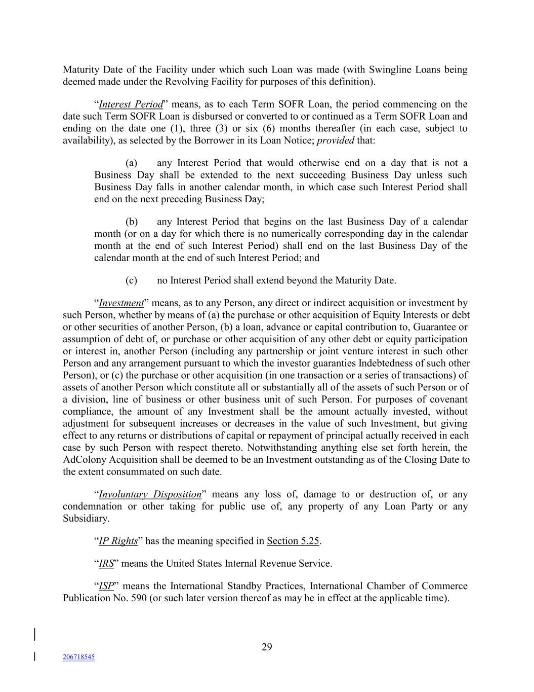 Maturity Date of the Facility under which such Loan was made (with Swingline Loans being deemed made under the Revolving Facility for purposes of this definition). “Interest Period” means, as to each Term SOFR Loan, the period commencing on the date such Term SOFR Loan is disbursed or converted to or continued as a Term SOFR Loan and ending on the date one (1), three (3) or six (6) months thereafter (in each case, subject to availability), as selected by the Borrower in its Loan Notice; provided that: (a) any Interest Period that would otherwise end on a day that is not a Business Day shall be extended to the next succeeding Business Day unless such Business Day falls in another calendar month, in which case such Interest Period shall end on the next preceding Business Day; (b) any Interest Period that begins on the last Business Day of a calendar month (or on a day for which there is no numerically corresponding day in the calendar month at the end of such Interest Period) shall end on the last Business Day of the calendar month at the end of such Interest Period; and (c) no Interest Period shall extend beyond the Maturity Date. “Investment” means, as to any Person, any direct or indirect acquisition or investment by such Person, whether by means of (a) the purchase or other acquisition of Equity Interests or debt or other securities of another Person, (b) a loan, advance or capital contribution to, Guarantee or assumption of debt of, or purchase or other acquisition of any other debt or equity participation or interest in, another Person (including any partnership or joint venture interest in such other Person and any arrangement pursuant to which the investor guaranties Indebtedness of such other Person), or (c) the purchase or other acquisition (in one transaction or a series of transactions) of assets of another Person which constitute all or substantially all of the assets of such Person or of a division, line of business or other business unit of such Person. For purposes of covenant compliance, the amount of any Investment shall be the amount actually invested, without adjustment for subsequent increases or decreases in the value of such Investment, but giving effect to any returns or distributions of capital or repayment of principal actually received in each case by such Person with respect thereto. Notwithstanding anything else set forth herein, the AdColony Acquisition shall be deemed to be an Investment outstanding as of the Closing Date to the extent consummated on such date. “Involuntary Disposition” means any loss of, damage to or destruction of, or any condemnation or other taking for public use of, any property of any Loan Party or any Subsidiary. “IP Rights” has the meaning specified in Section 5.25. “IRS” means the United States Internal Revenue Service. “ISP” means the International Standby Practices, International Chamber of Commerce Publication No. 590 (or such later version thereof as may be in effect at the applicable time). 29 206718545