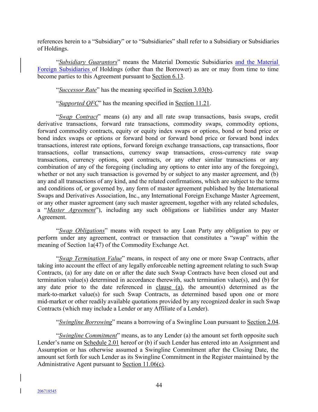 references herein to a “Subsidiary” or to “Subsidiaries” shall refer to a Subsidiary or Subsidiaries of Holdings. “Subsidiary Guarantors” means the Material Domestic Subsidiaries and the Material Foreign Subsidiaries of Holdings (other than the Borrower) as are or may from time to time become parties to this Agreement pursuant to Section 6.13. “Successor Rate” has the meaning specified in Section 3.03(b). “Supported QFC” has the meaning specified in Section 11.21. “Swap Contract” means (a) any and all rate swap transactions, basis swaps, credit derivative transactions, forward rate transactions, commodity swaps, commodity options, forward commodity contracts, equity or equity index swaps or options, bond or bond price or bond index swaps or options or forward bond or forward bond price or forward bond index transactions, interest rate options, forward foreign exchange transactions, cap transactions, floor transactions, collar transactions, currency swap transactions, cross-currency rate swap transactions, currency options, spot contracts, or any other similar transactions or any combination of any of the foregoing (including any options to enter into any of the foregoing), whether or not any such transaction is governed by or subject to any master agreement, and (b) any and all transactions of any kind, and the related confirmations, which are subject to the terms and conditions of, or governed by, any form of master agreement published by the International Swaps and Derivatives Association, Inc., any International Foreign Exchange Master Agreement, or any other master agreement (any such master agreement, together with any related schedules, a “Master Agreement”), including any such obligations or liabilities under any Master Agreement. “Swap Obligations” means with respect to any Loan Party any obligation to pay or perform under any agreement, contract or transaction that constitutes a “swap” within the meaning of Section 1a(47) of the Commodity Exchange Act. “Swap Termination Value” means, in respect of any one or more Swap Contracts, after taking into account the effect of any legally enforceable netting agreement relating to such Swap Contracts, (a) for any date on or after the date such Swap Contracts have been closed out and termination value(s) determined in accordance therewith, such termination value(s), and (b) for any date prior to the date referenced in clause (a), the amount(s) determined as the mark-to-market value(s) for such Swap Contracts, as determined based upon one or more mid-market or other readily available quotations provided by any recognized dealer in such Swap Contracts (which may include a Lender or any Affiliate of a Lender). “Swingline Borrowing” means a borrowing of a Swingline Loan pursuant to Section 2.04. “Swingline Commitment” means, as to any Lender (a) the amount set forth opposite such Lender’s name on Schedule 2.01 hereof or (b) if such Lender has entered into an Assignment and Assumption or has otherwise assumed a Swingline Commitment after the Closing Date, the amount set forth for such Lender as its Swingline Commitment in the Register maintained by the Administrative Agent pursuant to Section 11.06(c). 44 206718545