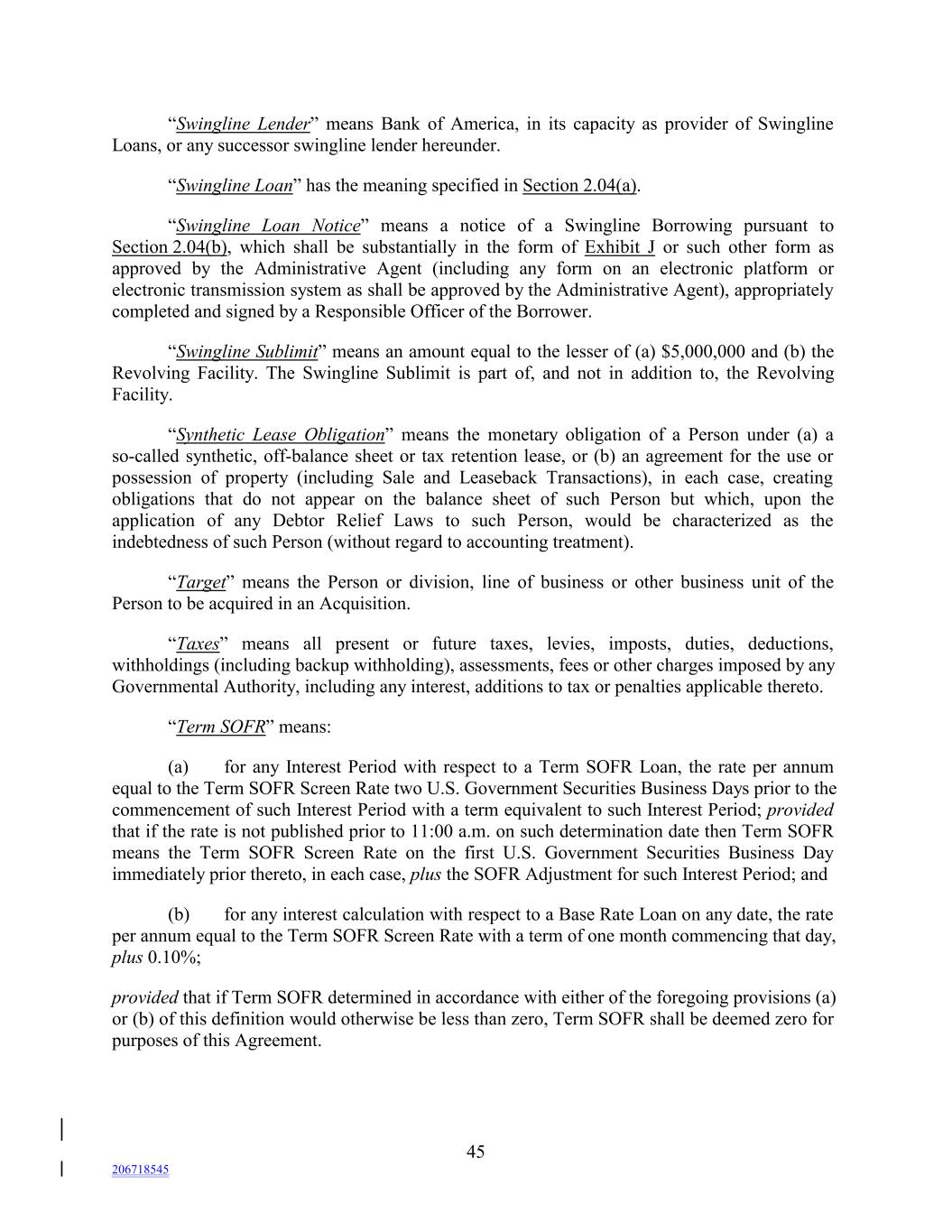 “Swingline Lender” means Bank of America, in its capacity as provider of Swingline Loans, or any successor swingline lender hereunder. “Swingline Loan” has the meaning specified in Section 2.04(a). “Swingline Loan Notice” means a notice of a Swingline Borrowing pursuant to Section 2.04(b), which shall be substantially in the form of Exhibit J or such other form as approved by the Administrative Agent (including any form on an electronic platform or electronic transmission system as shall be approved by the Administrative Agent), appropriately completed and signed by a Responsible Officer of the Borrower. “Swingline Sublimit” means an amount equal to the lesser of (a) $5,000,000 and (b) the Revolving Facility. The Swingline Sublimit is part of, and not in addition to, the Revolving Facility. “Synthetic Lease Obligation” means the monetary obligation of a Person under (a) a so-called synthetic, off-balance sheet or tax retention lease, or (b) an agreement for the use or possession of property (including Sale and Leaseback Transactions), in each case, creating obligations that do not appear on the balance sheet of such Person but which, upon the application of any Debtor Relief Laws to such Person, would be characterized as the indebtedness of such Person (without regard to accounting treatment). “Target” means the Person or division, line of business or other business unit of the Person to be acquired in an Acquisition. “Taxes” means all present or future taxes, levies, imposts, duties, deductions, withholdings (including backup withholding), assessments, fees or other charges imposed by any Governmental Authority, including any interest, additions to tax or penalties applicable thereto. “Term SOFR” means: (a) for any Interest Period with respect to a Term SOFR Loan, the rate per annum equal to the Term SOFR Screen Rate two U.S. Government Securities Business Days prior to the commencement of such Interest Period with a term equivalent to such Interest Period; provided that if the rate is not published prior to 11:00 a.m. on such determination date then Term SOFR means the Term SOFR Screen Rate on the first U.S. Government Securities Business Day immediately prior thereto, in each case, plus the SOFR Adjustment for such Interest Period; and (b) for any interest calculation with respect to a Base Rate Loan on any date, the rate per annum equal to the Term SOFR Screen Rate with a term of one month commencing that day, plus 0.10%; provided that if Term SOFR determined in accordance with either of the foregoing provisions (a) or (b) of this definition would otherwise be less than zero, Term SOFR shall be deemed zero for purposes of this Agreement. 45 206718545