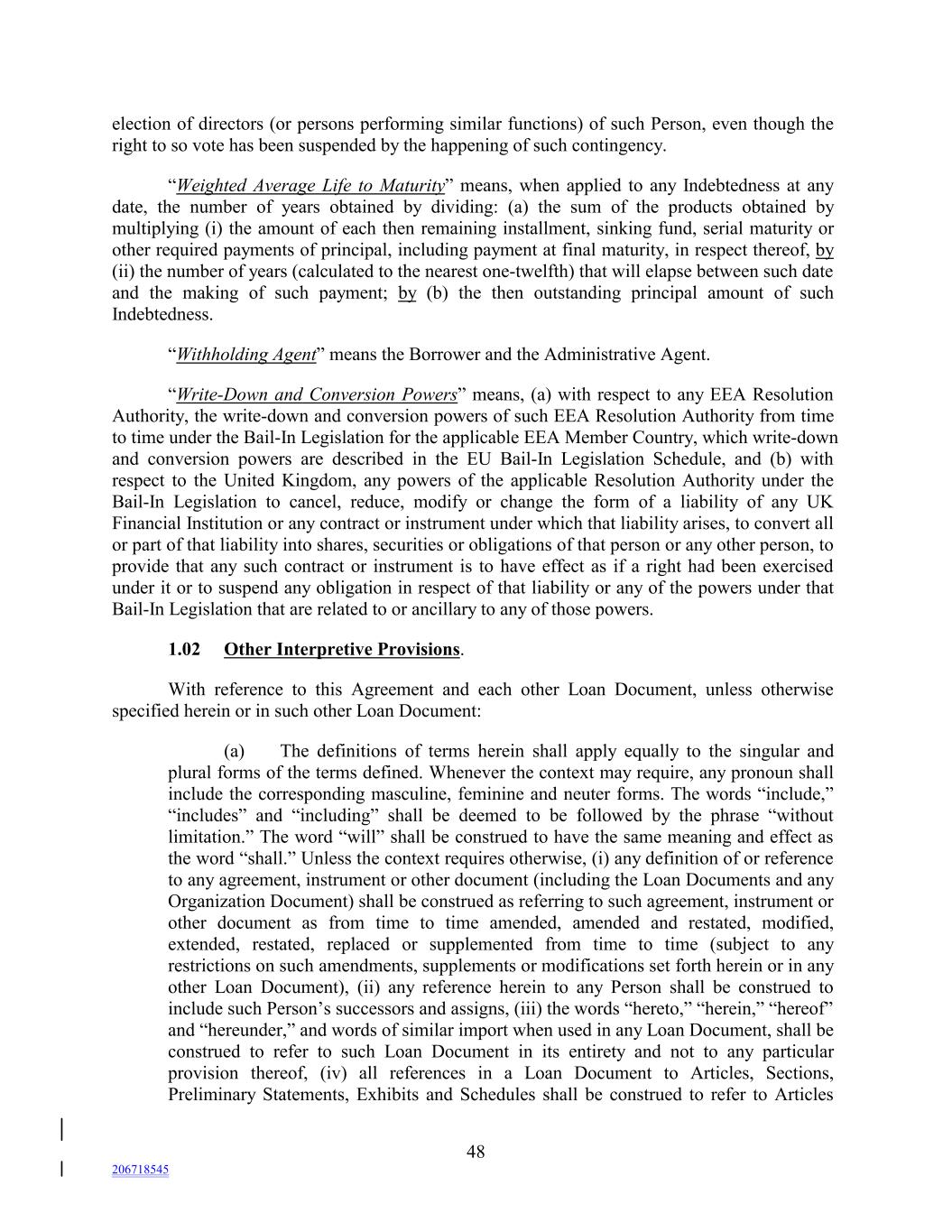 election of directors (or persons performing similar functions) of such Person, even though the right to so vote has been suspended by the happening of such contingency. “Weighted Average Life to Maturity” means, when applied to any Indebtedness at any date, the number of years obtained by dividing: (a) the sum of the products obtained by multiplying (i) the amount of each then remaining installment, sinking fund, serial maturity or other required payments of principal, including payment at final maturity, in respect thereof, by (ii) the number of years (calculated to the nearest one-twelfth) that will elapse between such date and the making of such payment; by (b) the then outstanding principal amount of such Indebtedness. “Withholding Agent” means the Borrower and the Administrative Agent. “Write-Down and Conversion Powers” means, (a) with respect to any EEA Resolution Authority, the write-down and conversion powers of such EEA Resolution Authority from time to time under the Bail-In Legislation for the applicable EEA Member Country, which write-down and conversion powers are described in the EU Bail-In Legislation Schedule, and (b) with respect to the United Kingdom, any powers of the applicable Resolution Authority under the Bail-In Legislation to cancel, reduce, modify or change the form of a liability of any UK Financial Institution or any contract or instrument under which that liability arises, to convert all or part of that liability into shares, securities or obligations of that person or any other person, to provide that any such contract or instrument is to have effect as if a right had been exercised under it or to suspend any obligation in respect of that liability or any of the powers under that Bail-In Legislation that are related to or ancillary to any of those powers. 1.02 Other Interpretive Provisions. With reference to this Agreement and each other Loan Document, unless otherwise specified herein or in such other Loan Document: (a) The definitions of terms herein shall apply equally to the singular and plural forms of the terms defined. Whenever the context may require, any pronoun shall include the corresponding masculine, feminine and neuter forms. The words “include,” “includes” and “including” shall be deemed to be followed by the phrase “without limitation.” The word “will” shall be construed to have the same meaning and effect as the word “shall.” Unless the context requires otherwise, (i) any definition of or reference to any agreement, instrument or other document (including the Loan Documents and any Organization Document) shall be construed as referring to such agreement, instrument or other document as from time to time amended, amended and restated, modified, extended, restated, replaced or supplemented from time to time (subject to any restrictions on such amendments, supplements or modifications set forth herein or in any other Loan Document), (ii) any reference herein to any Person shall be construed to include such Person’s successors and assigns, (iii) the words “hereto,” “herein,” “hereof” and “hereunder,” and words of similar import when used in any Loan Document, shall be construed to refer to such Loan Document in its entirety and not to any particular provision thereof, (iv) all references in a Loan Document to Articles, Sections, Preliminary Statements, Exhibits and Schedules shall be construed to refer to Articles 48 206718545