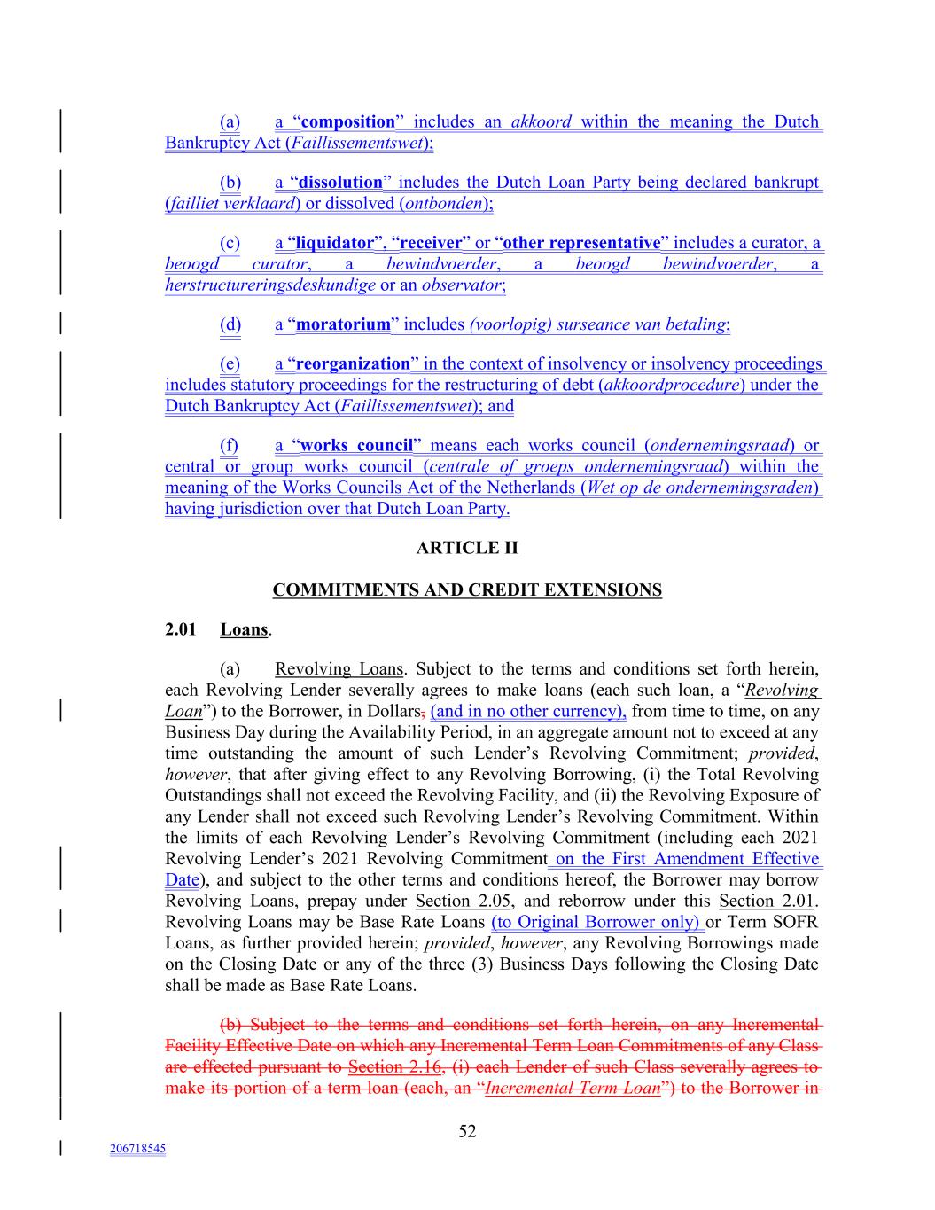 (a) a “composition” includes an akkoord within the meaning the Dutch Bankruptcy Act (Faillissementswet); (b) a “dissolution” includes the Dutch Loan Party being declared bankrupt (failliet verklaard) or dissolved (ontbonden); (c) a “liquidator”, “receiver” or “other representative” includes a curator, a beoogd curator, a bewindvoerder, a beoogd bewindvoerder, a herstructureringsdeskundige or an observator; (d) a “moratorium” includes (voorlopig) surseance van betaling; (e) a “reorganization” in the context of insolvency or insolvency proceedings includes statutory proceedings for the restructuring of debt (akkoordprocedure) under the Dutch Bankruptcy Act (Faillissementswet); and (f) a “works council” means each works council (ondernemingsraad) or central or group works council (centrale of groeps ondernemingsraad) within the meaning of the Works Councils Act of the Netherlands (Wet op de ondernemingsraden) having jurisdiction over that Dutch Loan Party. ARTICLE II COMMITMENTS AND CREDIT EXTENSIONS 2.01 Loans. (a) Revolving Loans. Subject to the terms and conditions set forth herein, each Revolving Lender severally agrees to make loans (each such loan, a “Revolving Loan”) to the Borrower, in Dollars, (and in no other currency), from time to time, on any Business Day during the Availability Period, in an aggregate amount not to exceed at any time outstanding the amount of such Lender’s Revolving Commitment; provided, however, that after giving effect to any Revolving Borrowing, (i) the Total Revolving Outstandings shall not exceed the Revolving Facility, and (ii) the Revolving Exposure of any Lender shall not exceed such Revolving Lender’s Revolving Commitment. Within the limits of each Revolving Lender’s Revolving Commitment (including each 2021 Revolving Lender’s 2021 Revolving Commitment on the First Amendment Effective Date), and subject to the other terms and conditions hereof, the Borrower may borrow Revolving Loans, prepay under Section 2.05, and reborrow under this Section 2.01. Revolving Loans may be Base Rate Loans (to Original Borrower only) or Term SOFR Loans, as further provided herein; provided, however, any Revolving Borrowings made on the Closing Date or any of the three (3) Business Days following the Closing Date shall be made as Base Rate Loans. (b) Subject to the terms and conditions set forth herein, on any Incremental Facility Effective Date on which any Incremental Term Loan Commitments of any Class are effected pursuant to Section 2.16, (i) each Lender of such Class severally agrees to make its portion of a term loan (each, an “Incremental Term Loan”) to the Borrower in 52 206718545