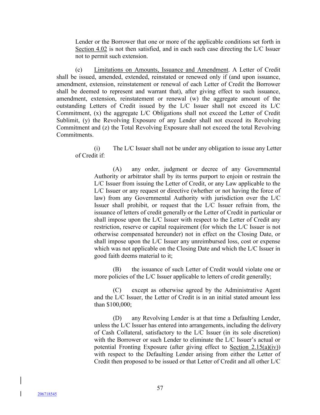 Lender or the Borrower that one or more of the applicable conditions set forth in Section 4.02 is not then satisfied, and in each such case directing the L/C Issuer not to permit such extension. (c) Limitations on Amounts, Issuance and Amendment. A Letter of Credit shall be issued, amended, extended, reinstated or renewed only if (and upon issuance, amendment, extension, reinstatement or renewal of each Letter of Credit the Borrower shall be deemed to represent and warrant that), after giving effect to such issuance, amendment, extension, reinstatement or renewal (w) the aggregate amount of the outstanding Letters of Credit issued by the L/C Issuer shall not exceed its L/C Commitment, (x) the aggregate L/C Obligations shall not exceed the Letter of Credit Sublimit, (y) the Revolving Exposure of any Lender shall not exceed its Revolving Commitment and (z) the Total Revolving Exposure shall not exceed the total Revolving Commitments. (i) The L/C Issuer shall not be under any obligation to issue any Letter of Credit if: (A) any order, judgment or decree of any Governmental Authority or arbitrator shall by its terms purport to enjoin or restrain the L/C Issuer from issuing the Letter of Credit, or any Law applicable to the L/C Issuer or any request or directive (whether or not having the force of law) from any Governmental Authority with jurisdiction over the L/C Issuer shall prohibit, or request that the L/C Issuer refrain from, the issuance of letters of credit generally or the Letter of Credit in particular or shall impose upon the L/C Issuer with respect to the Letter of Credit any restriction, reserve or capital requirement (for which the L/C Issuer is not otherwise compensated hereunder) not in effect on the Closing Date, or shall impose upon the L/C Issuer any unreimbursed loss, cost or expense which was not applicable on the Closing Date and which the L/C Issuer in good faith deems material to it; (B) the issuance of such Letter of Credit would violate one or more policies of the L/C Issuer applicable to letters of credit generally; (C) except as otherwise agreed by the Administrative Agent and the L/C Issuer, the Letter of Credit is in an initial stated amount less than $100,000; (D) any Revolving Lender is at that time a Defaulting Lender, unless the L/C Issuer has entered into arrangements, including the delivery of Cash Collateral, satisfactory to the L/C Issuer (in its sole discretion) with the Borrower or such Lender to eliminate the L/C Issuer’s actual or potential Fronting Exposure (after giving effect to Section 2.15(a)(iv)) with respect to the Defaulting Lender arising from either the Letter of Credit then proposed to be issued or that Letter of Credit and all other L/C 57 206718545