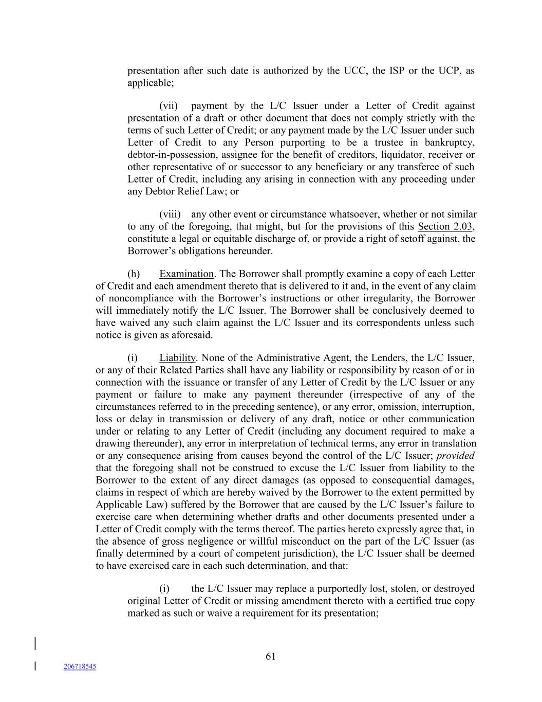 presentation after such date is authorized by the UCC, the ISP or the UCP, as applicable; (vii) payment by the L/C Issuer under a Letter of Credit against presentation of a draft or other document that does not comply strictly with the terms of such Letter of Credit; or any payment made by the L/C Issuer under such Letter of Credit to any Person purporting to be a trustee in bankruptcy, debtor-in-possession, assignee for the benefit of creditors, liquidator, receiver or other representative of or successor to any beneficiary or any transferee of such Letter of Credit, including any arising in connection with any proceeding under any Debtor Relief Law; or (viii) any other event or circumstance whatsoever, whether or not similar to any of the foregoing, that might, but for the provisions of this Section 2.03, constitute a legal or equitable discharge of, or provide a right of setoff against, the Borrower’s obligations hereunder. (h) Examination. The Borrower shall promptly examine a copy of each Letter of Credit and each amendment thereto that is delivered to it and, in the event of any claim of noncompliance with the Borrower’s instructions or other irregularity, the Borrower will immediately notify the L/C Issuer. The Borrower shall be conclusively deemed to have waived any such claim against the L/C Issuer and its correspondents unless such notice is given as aforesaid. (i) Liability. None of the Administrative Agent, the Lenders, the L/C Issuer, or any of their Related Parties shall have any liability or responsibility by reason of or in connection with the issuance or transfer of any Letter of Credit by the L/C Issuer or any payment or failure to make any payment thereunder (irrespective of any of the circumstances referred to in the preceding sentence), or any error, omission, interruption, loss or delay in transmission or delivery of any draft, notice or other communication under or relating to any Letter of Credit (including any document required to make a drawing thereunder), any error in interpretation of technical terms, any error in translation or any consequence arising from causes beyond the control of the L/C Issuer; provided that the foregoing shall not be construed to excuse the L/C Issuer from liability to the Borrower to the extent of any direct damages (as opposed to consequential damages, claims in respect of which are hereby waived by the Borrower to the extent permitted by Applicable Law) suffered by the Borrower that are caused by the L/C Issuer’s failure to exercise care when determining whether drafts and other documents presented under a Letter of Credit comply with the terms thereof. The parties hereto expressly agree that, in the absence of gross negligence or willful misconduct on the part of the L/C Issuer (as finally determined by a court of competent jurisdiction), the L/C Issuer shall be deemed to have exercised care in each such determination, and that: (i) the L/C Issuer may replace a purportedly lost, stolen, or destroyed original Letter of Credit or missing amendment thereto with a certified true copy marked as such or waive a requirement for its presentation; 61 206718545