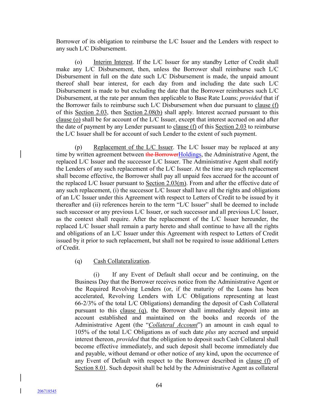 Borrower of its obligation to reimburse the L/C Issuer and the Lenders with respect to any such L/C Disbursement. (o) Interim Interest. If the L/C Issuer for any standby Letter of Credit shall make any L/C Disbursement, then, unless the Borrower shall reimburse such L/C Disbursement in full on the date such L/C Disbursement is made, the unpaid amount thereof shall bear interest, for each day from and including the date such L/C Disbursement is made to but excluding the date that the Borrower reimburses such L/C Disbursement, at the rate per annum then applicable to Base Rate Loans; provided that if the Borrower fails to reimburse such L/C Disbursement when due pursuant to clause (f) of this Section 2.03, then Section 2.08(b) shall apply. Interest accrued pursuant to this clause (o) shall be for account of the L/C Issuer, except that interest accrued on and after the date of payment by any Lender pursuant to clause (f) of this Section 2.03 to reimburse the L/C Issuer shall be for account of such Lender to the extent of such payment. (p) Replacement of the L/C Issuer. The L/C Issuer may be replaced at any time by written agreement between the BorrowerHoldings, the Administrative Agent, the replaced L/C Issuer and the successor L/C Issuer. The Administrative Agent shall notify the Lenders of any such replacement of the L/C Issuer. At the time any such replacement shall become effective, the Borrower shall pay all unpaid fees accrued for the account of the replaced L/C Issuer pursuant to Section 2.03(m). From and after the effective date of any such replacement, (i) the successor L/C Issuer shall have all the rights and obligations of an L/C Issuer under this Agreement with respect to Letters of Credit to be issued by it thereafter and (ii) references herein to the term “L/C Issuer” shall be deemed to include such successor or any previous L/C Issuer, or such successor and all previous L/C Issuer, as the context shall require. After the replacement of the L/C Issuer hereunder, the replaced L/C Issuer shall remain a party hereto and shall continue to have all the rights and obligations of an L/C Issuer under this Agreement with respect to Letters of Credit issued by it prior to such replacement, but shall not be required to issue additional Letters of Credit. (q) Cash Collateralization. (i) If any Event of Default shall occur and be continuing, on the Business Day that the Borrower receives notice from the Administrative Agent or the Required Revolving Lenders (or, if the maturity of the Loans has been accelerated, Revolving Lenders with L/C Obligations representing at least 66-2/3% of the total L/C Obligations) demanding the deposit of Cash Collateral pursuant to this clause (q), the Borrower shall immediately deposit into an account established and maintained on the books and records of the Administrative Agent (the “Collateral Account”) an amount in cash equal to 105% of the total L/C Obligations as of such date plus any accrued and unpaid interest thereon, provided that the obligation to deposit such Cash Collateral shall become effective immediately, and such deposit shall become immediately due and payable, without demand or other notice of any kind, upon the occurrence of any Event of Default with respect to the Borrower described in clause (f) of Section 8.01. Such deposit shall be held by the Administrative Agent as collateral 64 206718545