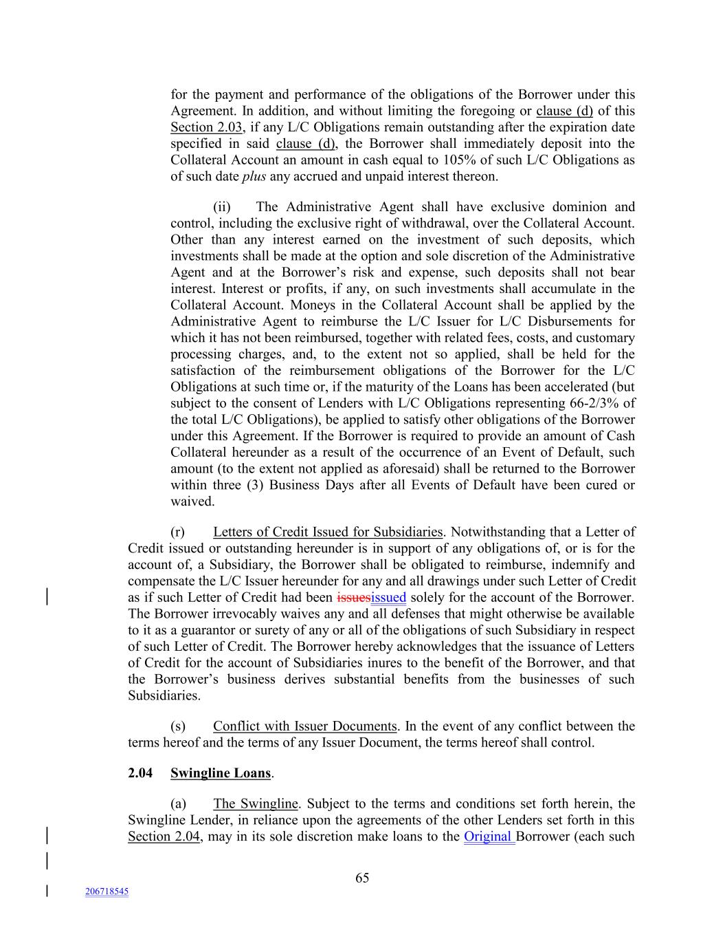 for the payment and performance of the obligations of the Borrower under this Agreement. In addition, and without limiting the foregoing or clause (d) of this Section 2.03, if any L/C Obligations remain outstanding after the expiration date specified in said clause (d), the Borrower shall immediately deposit into the Collateral Account an amount in cash equal to 105% of such L/C Obligations as of such date plus any accrued and unpaid interest thereon. (ii) The Administrative Agent shall have exclusive dominion and control, including the exclusive right of withdrawal, over the Collateral Account. Other than any interest earned on the investment of such deposits, which investments shall be made at the option and sole discretion of the Administrative Agent and at the Borrower’s risk and expense, such deposits shall not bear interest. Interest or profits, if any, on such investments shall accumulate in the Collateral Account. Moneys in the Collateral Account shall be applied by the Administrative Agent to reimburse the L/C Issuer for L/C Disbursements for which it has not been reimbursed, together with related fees, costs, and customary processing charges, and, to the extent not so applied, shall be held for the satisfaction of the reimbursement obligations of the Borrower for the L/C Obligations at such time or, if the maturity of the Loans has been accelerated (but subject to the consent of Lenders with L/C Obligations representing 66-2/3% of the total L/C Obligations), be applied to satisfy other obligations of the Borrower under this Agreement. If the Borrower is required to provide an amount of Cash Collateral hereunder as a result of the occurrence of an Event of Default, such amount (to the extent not applied as aforesaid) shall be returned to the Borrower within three (3) Business Days after all Events of Default have been cured or waived. (r) Letters of Credit Issued for Subsidiaries. Notwithstanding that a Letter of Credit issued or outstanding hereunder is in support of any obligations of, or is for the account of, a Subsidiary, the Borrower shall be obligated to reimburse, indemnify and compensate the L/C Issuer hereunder for any and all drawings under such Letter of Credit as if such Letter of Credit had been issuesissued solely for the account of the Borrower. The Borrower irrevocably waives any and all defenses that might otherwise be available to it as a guarantor or surety of any or all of the obligations of such Subsidiary in respect of such Letter of Credit. The Borrower hereby acknowledges that the issuance of Letters of Credit for the account of Subsidiaries inures to the benefit of the Borrower, and that the Borrower’s business derives substantial benefits from the businesses of such Subsidiaries. (s) Conflict with Issuer Documents. In the event of any conflict between the terms hereof and the terms of any Issuer Document, the terms hereof shall control. 2.04 Swingline Loans. (a) The Swingline. Subject to the terms and conditions set forth herein, the Swingline Lender, in reliance upon the agreements of the other Lenders set forth in this Section 2.04, may in its sole discretion make loans to the Original Borrower (each such 65 206718545