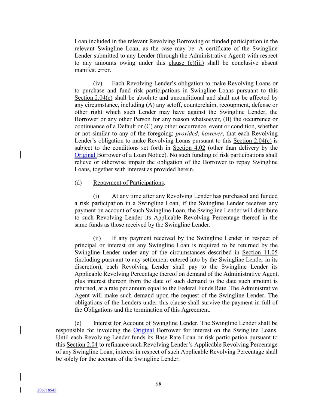Loan included in the relevant Revolving Borrowing or funded participation in the relevant Swingline Loan, as the case may be. A certificate of the Swingline Lender submitted to any Lender (through the Administrative Agent) with respect to any amounts owing under this clause (c)(iii) shall be conclusive absent manifest error. (iv) Each Revolving Lender’s obligation to make Revolving Loans or to purchase and fund risk participations in Swingline Loans pursuant to this Section 2.04(c) shall be absolute and unconditional and shall not be affected by any circumstance, including (A) any setoff, counterclaim, recoupment, defense or other right which such Lender may have against the Swingline Lender, the Borrower or any other Person for any reason whatsoever, (B) the occurrence or continuance of a Default or (C) any other occurrence, event or condition, whether or not similar to any of the foregoing; provided, however, that each Revolving Lender’s obligation to make Revolving Loans pursuant to this Section 2.04(c) is subject to the conditions set forth in Section 4.02 (other than delivery by the Original Borrower of a Loan Notice). No such funding of risk participations shall relieve or otherwise impair the obligation of the Borrower to repay Swingline Loans, together with interest as provided herein. (d) Repayment of Participations. (i) At any time after any Revolving Lender has purchased and funded a risk participation in a Swingline Loan, if the Swingline Lender receives any payment on account of such Swingline Loan, the Swingline Lender will distribute to such Revolving Lender its Applicable Revolving Percentage thereof in the same funds as those received by the Swingline Lender. (ii) If any payment received by the Swingline Lender in respect of principal or interest on any Swingline Loan is required to be returned by the Swingline Lender under any of the circumstances described in Section 11.05 (including pursuant to any settlement entered into by the Swingline Lender in its discretion), each Revolving Lender shall pay to the Swingline Lender its Applicable Revolving Percentage thereof on demand of the Administrative Agent, plus interest thereon from the date of such demand to the date such amount is returned, at a rate per annum equal to the Federal Funds Rate. The Administrative Agent will make such demand upon the request of the Swingline Lender. The obligations of the Lenders under this clause shall survive the payment in full of the Obligations and the termination of this Agreement. (e) Interest for Account of Swingline Lender. The Swingline Lender shall be responsible for invoicing the Original Borrower for interest on the Swingline Loans. Until each Revolving Lender funds its Base Rate Loan or risk participation pursuant to this Section 2.04 to refinance such Revolving Lender’s Applicable Revolving Percentage of any Swingline Loan, interest in respect of such Applicable Revolving Percentage shall be solely for the account of the Swingline Lender. 68 206718545