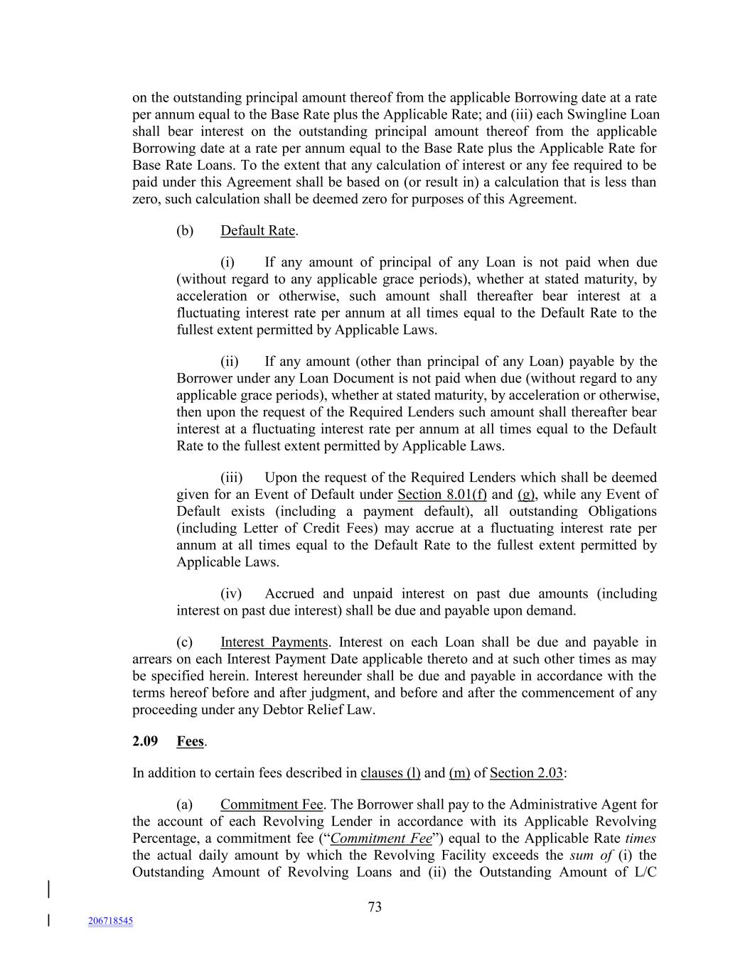 on the outstanding principal amount thereof from the applicable Borrowing date at a rate per annum equal to the Base Rate plus the Applicable Rate; and (iii) each Swingline Loan shall bear interest on the outstanding principal amount thereof from the applicable Borrowing date at a rate per annum equal to the Base Rate plus the Applicable Rate for Base Rate Loans. To the extent that any calculation of interest or any fee required to be paid under this Agreement shall be based on (or result in) a calculation that is less than zero, such calculation shall be deemed zero for purposes of this Agreement. (b) Default Rate. (i) If any amount of principal of any Loan is not paid when due (without regard to any applicable grace periods), whether at stated maturity, by acceleration or otherwise, such amount shall thereafter bear interest at a fluctuating interest rate per annum at all times equal to the Default Rate to the fullest extent permitted by Applicable Laws. (ii) If any amount (other than principal of any Loan) payable by the Borrower under any Loan Document is not paid when due (without regard to any applicable grace periods), whether at stated maturity, by acceleration or otherwise, then upon the request of the Required Lenders such amount shall thereafter bear interest at a fluctuating interest rate per annum at all times equal to the Default Rate to the fullest extent permitted by Applicable Laws. (iii) Upon the request of the Required Lenders which shall be deemed given for an Event of Default under Section 8.01(f) and (g), while any Event of Default exists (including a payment default), all outstanding Obligations (including Letter of Credit Fees) may accrue at a fluctuating interest rate per annum at all times equal to the Default Rate to the fullest extent permitted by Applicable Laws. (iv) Accrued and unpaid interest on past due amounts (including interest on past due interest) shall be due and payable upon demand. (c) Interest Payments. Interest on each Loan shall be due and payable in arrears on each Interest Payment Date applicable thereto and at such other times as may be specified herein. Interest hereunder shall be due and payable in accordance with the terms hereof before and after judgment, and before and after the commencement of any proceeding under any Debtor Relief Law. 2.09 Fees. In addition to certain fees described in clauses (l) and (m) of Section 2.03: (a) Commitment Fee. The Borrower shall pay to the Administrative Agent for the account of each Revolving Lender in accordance with its Applicable Revolving Percentage, a commitment fee (“Commitment Fee”) equal to the Applicable Rate times the actual daily amount by which the Revolving Facility exceeds the sum of (i) the Outstanding Amount of Revolving Loans and (ii) the Outstanding Amount of L/C 73 206718545