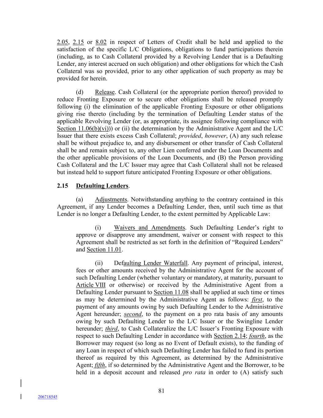 2.05, 2.15 or 8.02 in respect of Letters of Credit shall be held and applied to the satisfaction of the specific L/C Obligations, obligations to fund participations therein (including, as to Cash Collateral provided by a Revolving Lender that is a Defaulting Lender, any interest accrued on such obligation) and other obligations for which the Cash Collateral was so provided, prior to any other application of such property as may be provided for herein. (d) Release. Cash Collateral (or the appropriate portion thereof) provided to reduce Fronting Exposure or to secure other obligations shall be released promptly following (i) the elimination of the applicable Fronting Exposure or other obligations giving rise thereto (including by the termination of Defaulting Lender status of the applicable Revolving Lender (or, as appropriate, its assignee following compliance with Section 11.06(b)(vi))) or (ii) the determination by the Administrative Agent and the L/C Issuer that there exists excess Cash Collateral; provided, however, (A) any such release shall be without prejudice to, and any disbursement or other transfer of Cash Collateral shall be and remain subject to, any other Lien conferred under the Loan Documents and the other applicable provisions of the Loan Documents, and (B) the Person providing Cash Collateral and the L/C Issuer may agree that Cash Collateral shall not be released but instead held to support future anticipated Fronting Exposure or other obligations. 2.15 Defaulting Lenders. (a) Adjustments. Notwithstanding anything to the contrary contained in this Agreement, if any Lender becomes a Defaulting Lender, then, until such time as that Lender is no longer a Defaulting Lender, to the extent permitted by Applicable Law: (i) Waivers and Amendments. Such Defaulting Lender’s right to approve or disapprove any amendment, waiver or consent with respect to this Agreement shall be restricted as set forth in the definition of “Required Lenders” and Section 11.01. (ii) Defaulting Lender Waterfall. Any payment of principal, interest, fees or other amounts received by the Administrative Agent for the account of such Defaulting Lender (whether voluntary or mandatory, at maturity, pursuant to Article VIII or otherwise) or received by the Administrative Agent from a Defaulting Lender pursuant to Section 11.08 shall be applied at such time or times as may be determined by the Administrative Agent as follows: first, to the payment of any amounts owing by such Defaulting Lender to the Administrative Agent hereunder; second, to the payment on a pro rata basis of any amounts owing by such Defaulting Lender to the L/C Issuer or the Swingline Lender hereunder; third, to Cash Collateralize the L/C Issuer’s Fronting Exposure with respect to such Defaulting Lender in accordance with Section 2.14; fourth, as the Borrower may request (so long as no Event of Default exists), to the funding of any Loan in respect of which such Defaulting Lender has failed to fund its portion thereof as required by this Agreement, as determined by the Administrative Agent; fifth, if so determined by the Administrative Agent and the Borrower, to be held in a deposit account and released pro rata in order to (A) satisfy such 81 206718545