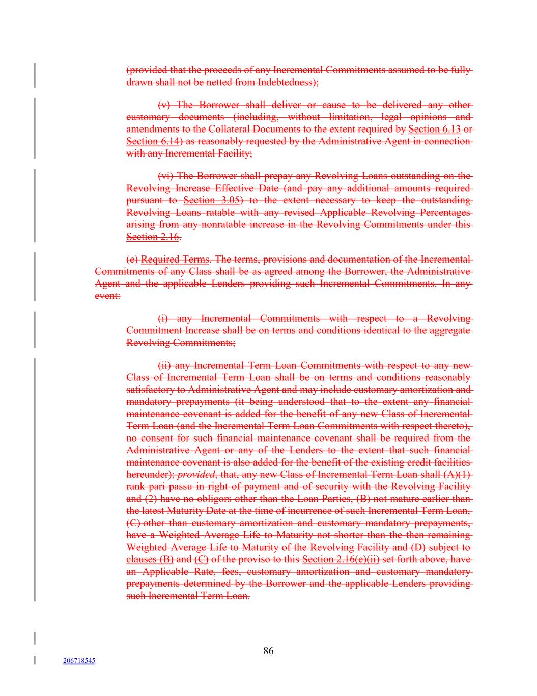 2 206746446 SECTION 2. Amendments to the Credit Agreement. Effective as of the Fifth Amendment Effective Date: (a) The Existing Credit Agreement is hereby amended to delete the stricken text (indicated textually in the same manner as the following example: stricken text) and to add the double-underlined text (indicated textually in the same manner as the following example: double-underlined text) as set forth in the pages of the Amended Credit Agreement attached as Annex A hereto. (b) All schedules to the Existing Credit Agreement (including Schedules 1.01(b), 5.21(f) and 6.18 to the Existing Credit Agreement) are hereby amended and restated in their entirety and attached as Annex B hereto, and such schedules, among other things, reflect information regarding the New Borrower. (c) New Exhibit Q is hereby added to the Existing Credit Agreement as set forth on Annex C hereto. All existing exhibits to the Existing Credit Agreement shall remain as in effect immediately prior to the Fifth Amendment Effective Date. The Existing Credit Agreement, as amended pursuant to this Section, is referred to as the “Amended Credit Agreement”; the Existing Credit Agreement and the Amended Credit Agreement are sometimes referred to as the “Credit Agreement”. The Administrative Agent and each of the Lenders (i) acknowledge and agree that this Amendment shall constitute the reduction notice required by Section 2.06(a) of the Existing Credit Agreement with respect to the Revolving Facility and (ii) waive any other requirements with respect to such notice under the Existing Credit Agreement (including, for the avoidance of doubt, the deadline for receipt of such notice set forth therein). SECTION 3. Joinder of New Borrower. The New Borrower hereby acknowledges, agrees and confirms that, by its execution of this Amendment, with effect from the Fifth Amendment Effective Date, the New Borrower will be deemed to be a party to and a “Borrower” under the Amended Credit Agreement, and the New Borrower shall have all of the obligations of a “Borrower” thereunder as if it had executed the Existing Credit Agreement and the other Loan Documents as a “Borrower”. The New Borrower hereby ratifies, as of the date hereof, and agrees to be bound by, all representations and warranties, covenants and other terms, conditions and provisions of the Amended Credit Agreement and the other applicable Loan Documents. The New Borrower acknowledges and confirms that it has received a copy of the Existing Credit Agreement and the schedules and exhibits thereto and each other Loan Document and Collateral Document and the schedules and exhibits thereto. SECTION 4. Representations and Warranties. To induce the other parties hereto to enter into this Amendment, each Loan Party represents and warrants to the other parties hereto on the Fifth Amendment Effective Date that, both before and after giving effect to the transactions contemplated by this Amendment: (a) this Amendment has been duly authorized, executed and delivered by such Loan Party, and this Amendment and the Amended Credit Agreement constitute such Loan Party’s legal, valid and binding obligation, enforceable against such Loan Party in accordance with terms thereof; (b) the representations and warranties made by the Loan Parties in Articles II and V of the Amended Credit Agreement or the other Loan Documents (i) that contain a materiality qualification, are true and correct, on and as of the Fifth Amendment Effective Date and (ii) that do not contain a materiality qualification, are true and correct in all material respects, on and as of the Fifth Amendment Effective Date, except (A) the representations and warranties contained in clauses (a) and (b) of Section 5.05 of the Amended Credit Agreement shall be deemed to refer to the most recent statements furnished pursuant to clauses (a) and (b), respectively, of Section 6.01 of the Existing Credit Agreement and (B) any